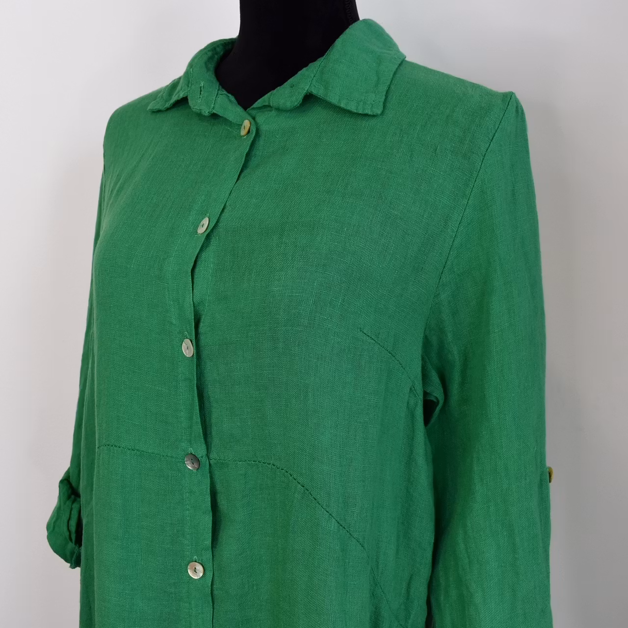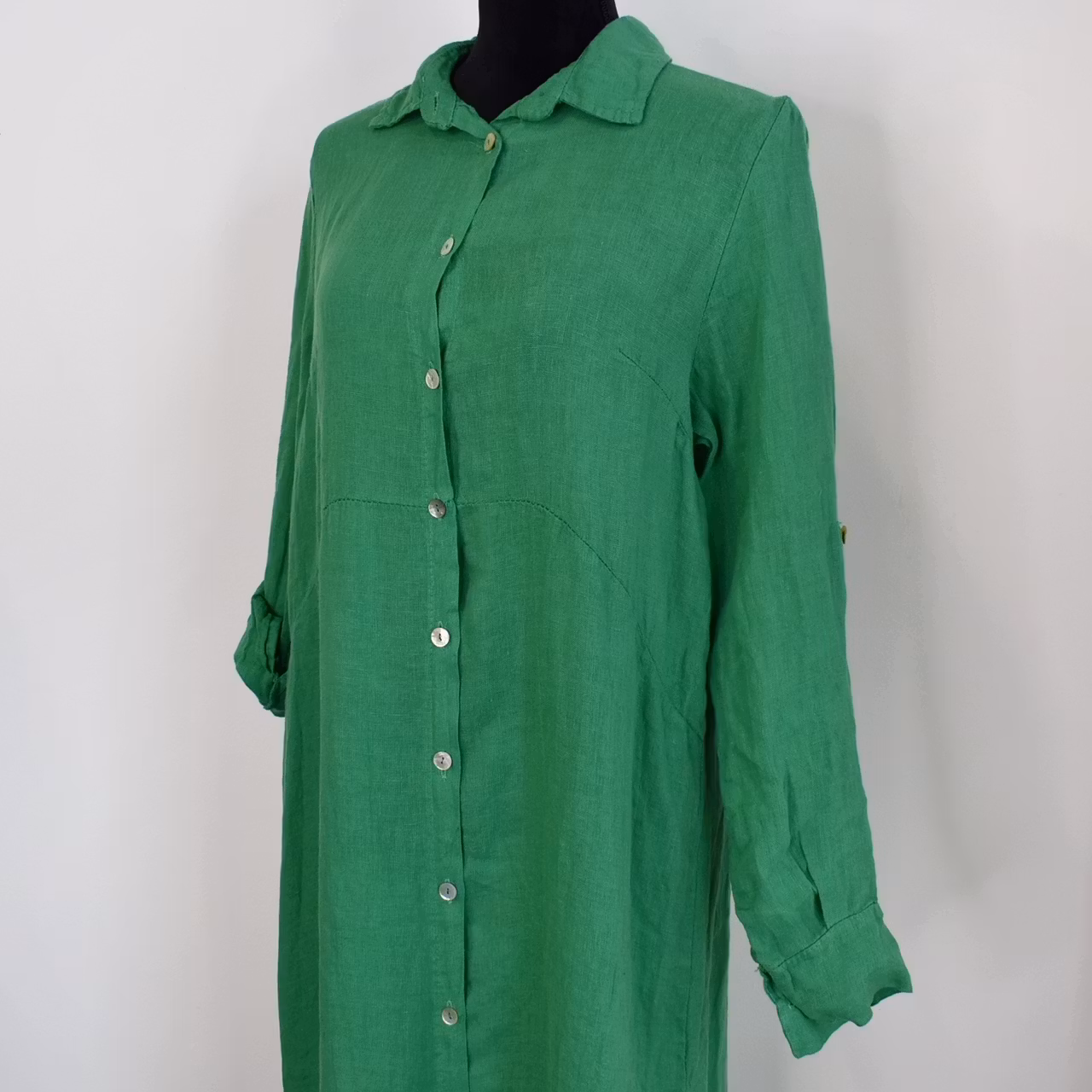 Det här är en så snygg och bekväm skjortklänning i skönt linnematerial. Ärmen kan vikas upp och fästas med knapp. Det finns slits i sidan och sprund i ryggen. Klänningen är något längre baktill och där är pärlemorknappar hela vägen framtill samt en i ärmslutet. Observera att materialet inte innehåller stretch och att tyget är något genomskinligt. Då vi alla är olika formade rekommenderar vi att man även använder sig av måtten längre ner i beskrivningen för att bedöma om plagget kan passa. One Size - passar uppskattningsvis upp till M (passformen beror på varje persons unika form & proportioner). Modellen är storlek S, har en bröstvidd på cirka 88cm, och är 163cm lång.