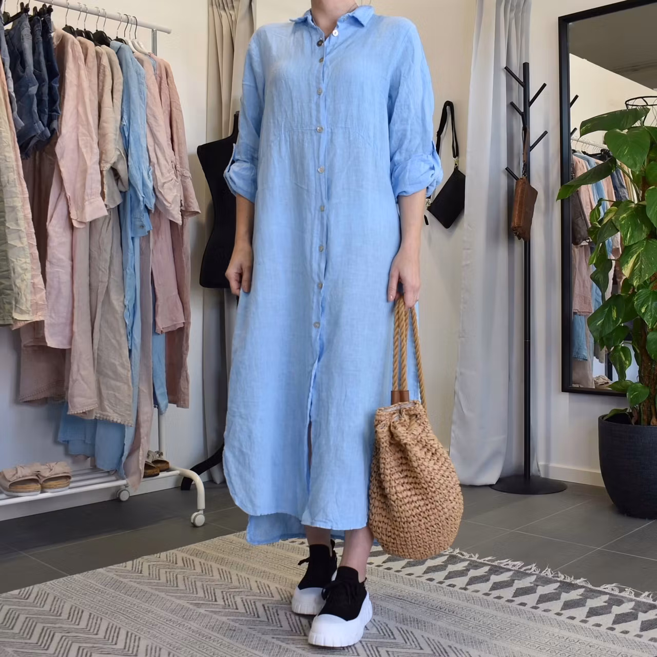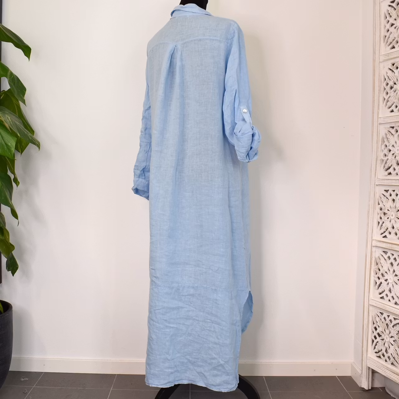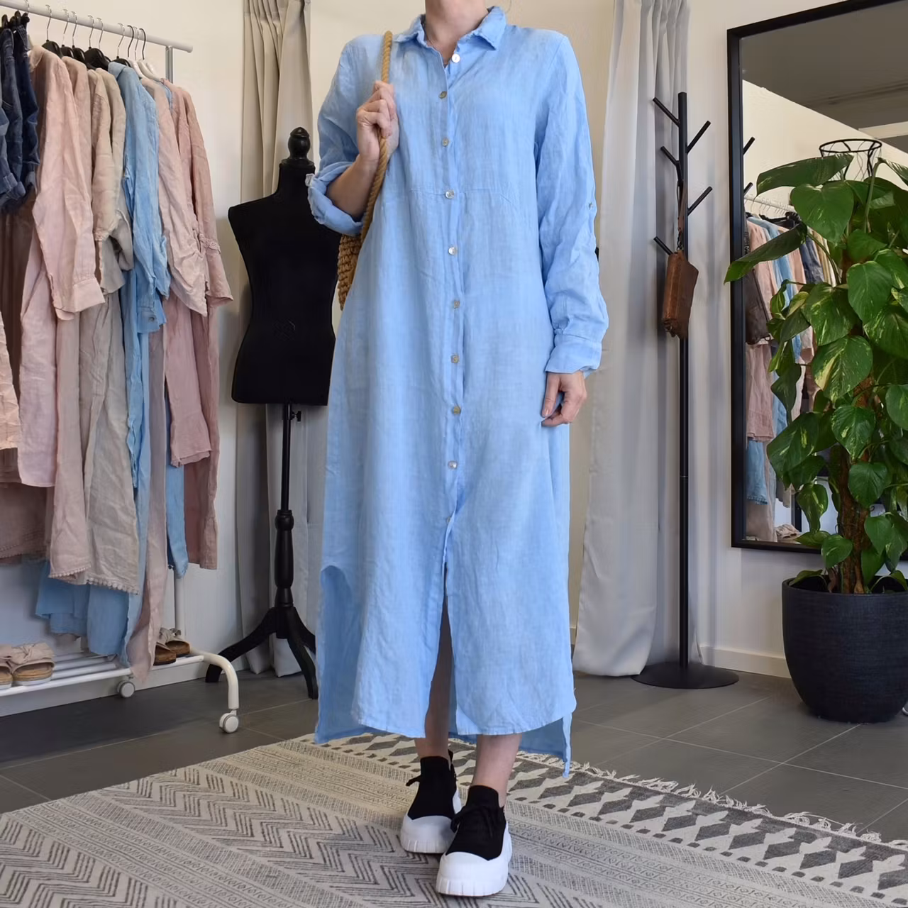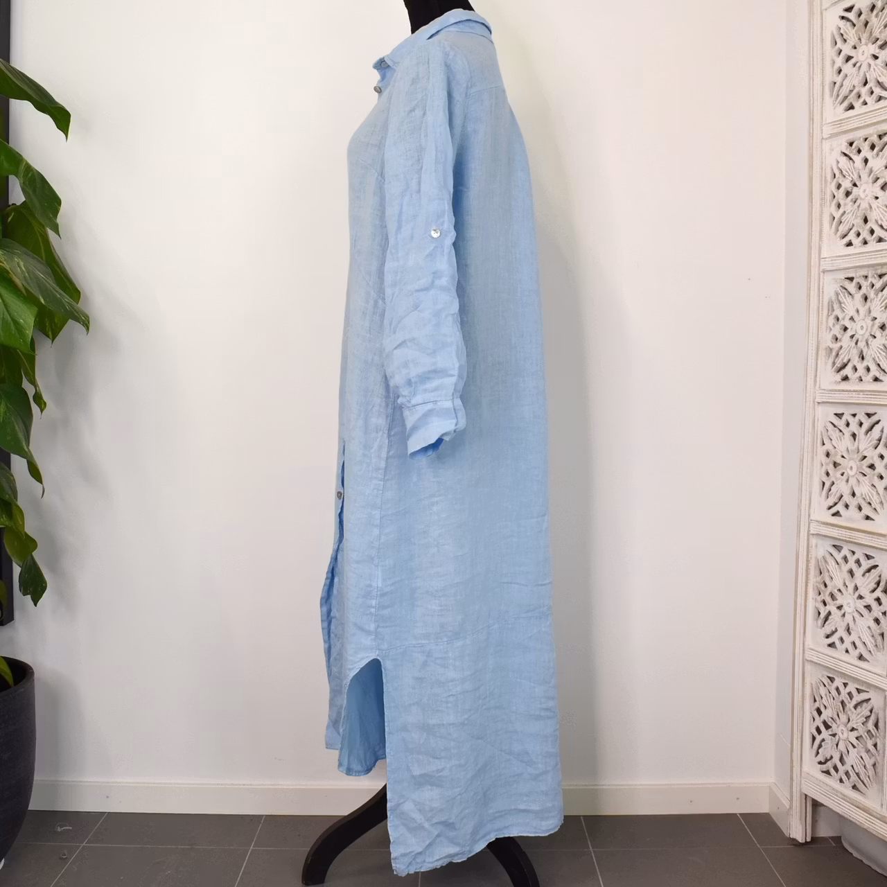 Det här är en så snygg och bekväm skjortklänning i skönt linnematerial. Ärmen kan vikas upp och fästas med knapp. Det finns slits i sidan och sprund i ryggen. Klänningen är något längre baktill och där är pärlemorknappar hela vägen framtill samt en i ärmslutet. Observera att materialet inte innehåller stretch och att tyget är något genomskinligt. Då vi alla är olika formade rekommenderar vi att man även använder sig av måtten för att bedöma om plagget passar eller ej. One Size - passar uppskattningsvis upp till M (passformen beror på varje persons unika form & proportioner). Modellen är storlek S, har en bröstvidd på cirka 88cm, och är 163cm lång.  Se ungefärliga mått längre ner i beskrivningen.