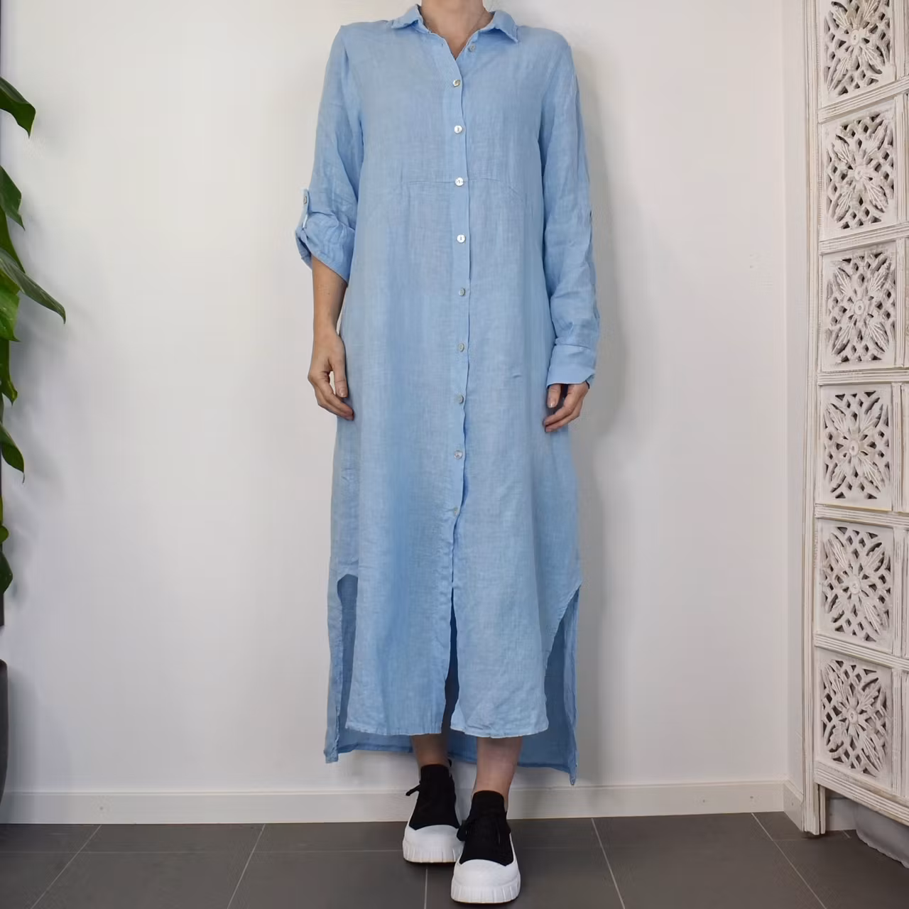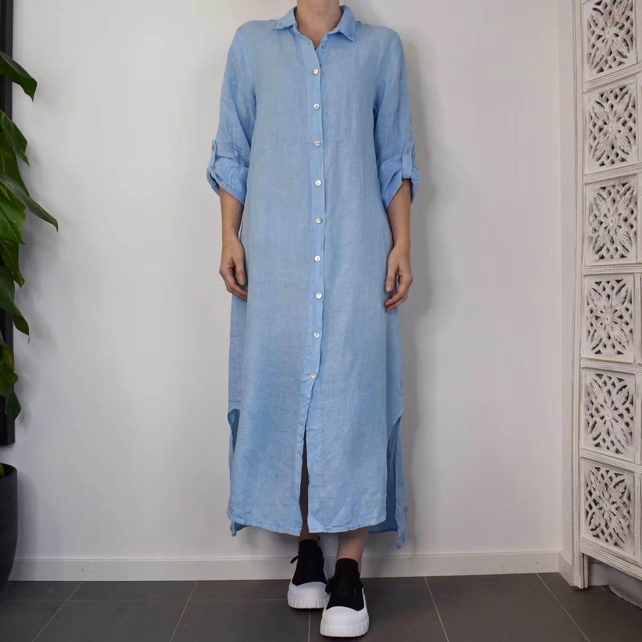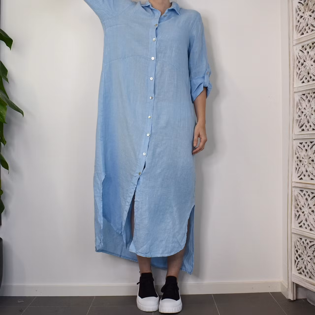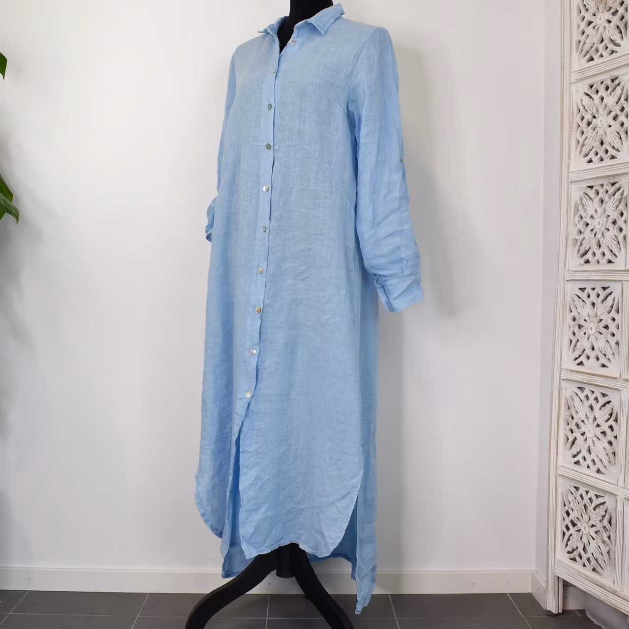 Det här är en så snygg och bekväm skjortklänning i skönt linnematerial. Ärmen kan vikas upp och fästas med knapp. Det finns slits i sidan och sprund i ryggen. Klänningen är något längre baktill och där är pärlemorknappar hela vägen framtill samt en i ärmslutet. Observera att materialet inte innehåller stretch och att tyget är något genomskinligt. Då vi alla är olika formade rekommenderar vi att man även använder sig av måtten för att bedöma om plagget passar eller ej. One Size - passar uppskattningsvis upp till M (passformen beror på varje persons unika form & proportioner). Modellen är storlek S, har en bröstvidd på cirka 88cm, och är 163cm lång.  Se ungefärliga mått längre ner i beskrivningen.