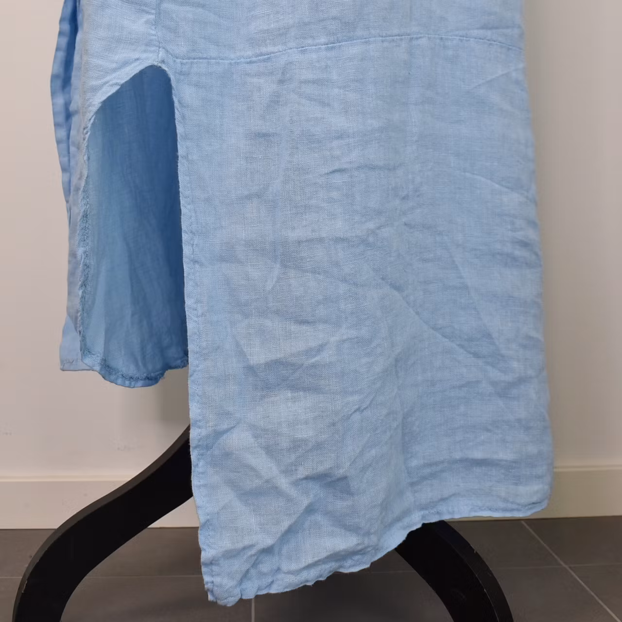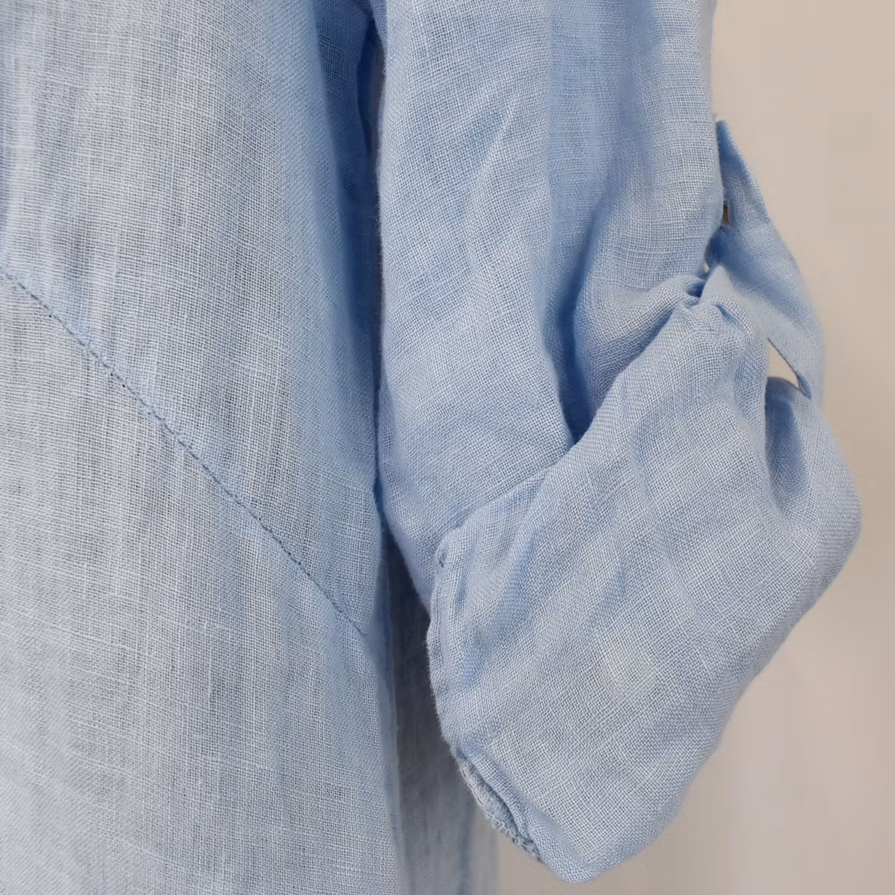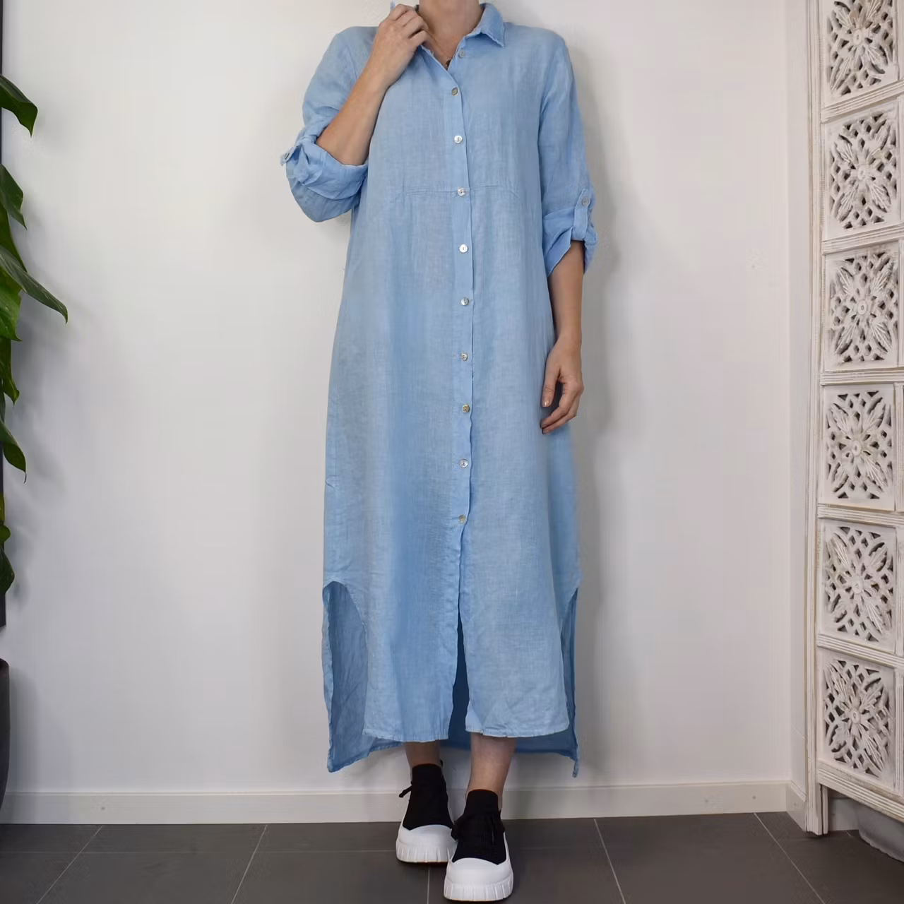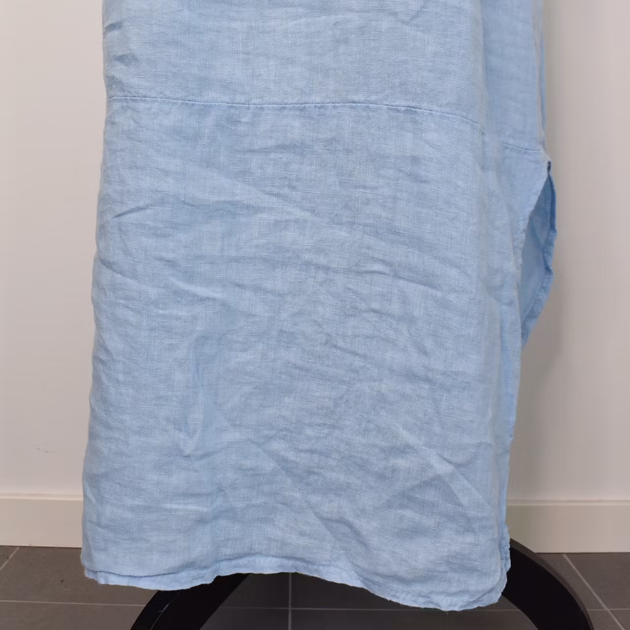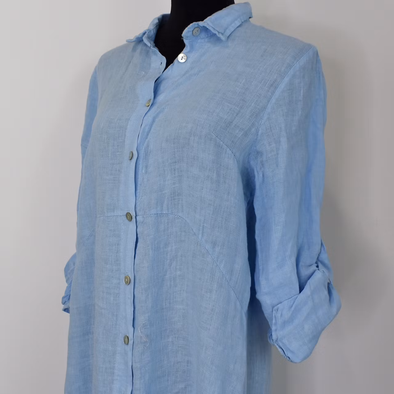 Det här är en så snygg och bekväm skjortklänning i skönt linnematerial. Ärmen kan vikas upp och fästas med knapp. Det finns slits i sidan och sprund i ryggen. Klänningen är något längre baktill och där är pärlemorknappar hela vägen framtill samt en i ärmslutet. Observera att materialet inte innehåller stretch och att tyget är något genomskinligt. Då vi alla är olika formade rekommenderar vi att man även använder sig av måtten för att bedöma om plagget passar eller ej. One Size - passar uppskattningsvis upp till M (passformen beror på varje persons unika form & proportioner). Modellen är storlek S, har en bröstvidd på cirka 88cm, och är 163cm lång.  Se ungefärliga mått längre ner i beskrivningen.