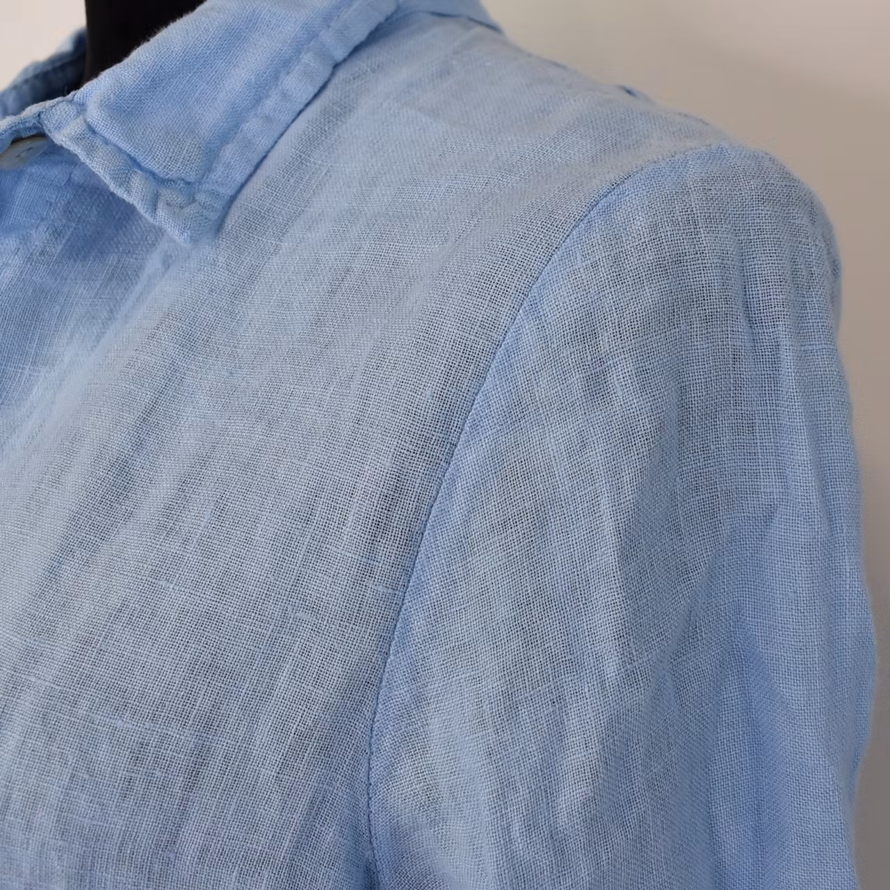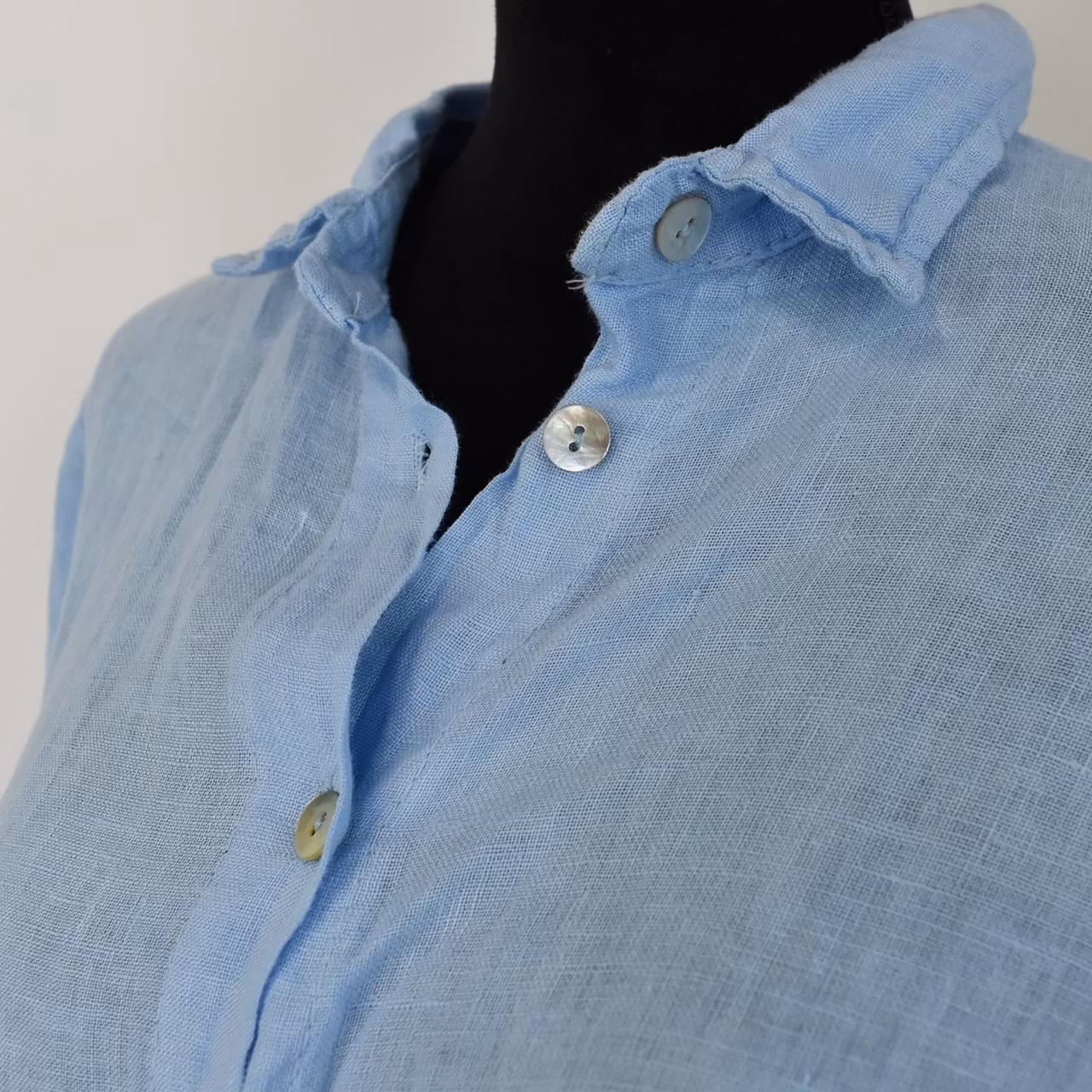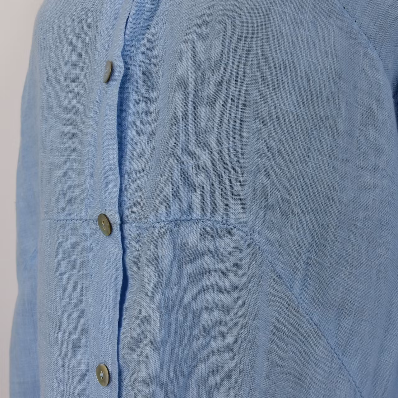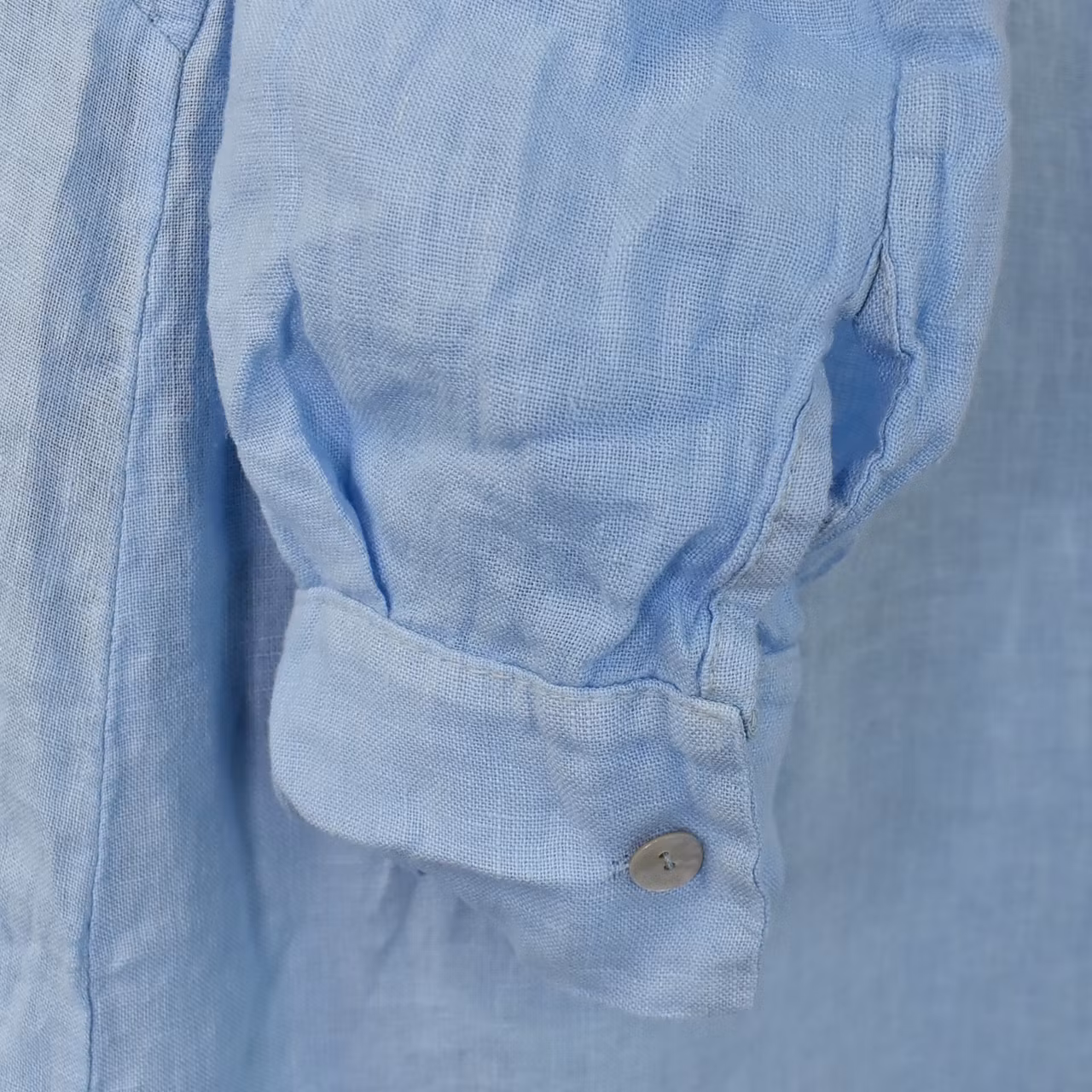 Det här är en så snygg och bekväm skjortklänning i skönt linnematerial. Ärmen kan vikas upp och fästas med knapp. Det finns slits i sidan och sprund i ryggen. Klänningen är något längre baktill och där är pärlemorknappar hela vägen framtill samt en i ärmslutet. Observera att materialet inte innehåller stretch och att tyget är något genomskinligt. Då vi alla är olika formade rekommenderar vi att man även använder sig av måtten för att bedöma om plagget passar eller ej. One Size - passar uppskattningsvis upp till M (passformen beror på varje persons unika form & proportioner). Modellen är storlek S, har en bröstvidd på cirka 88cm, och är 163cm lång.  Se ungefärliga mått längre ner i beskrivningen.