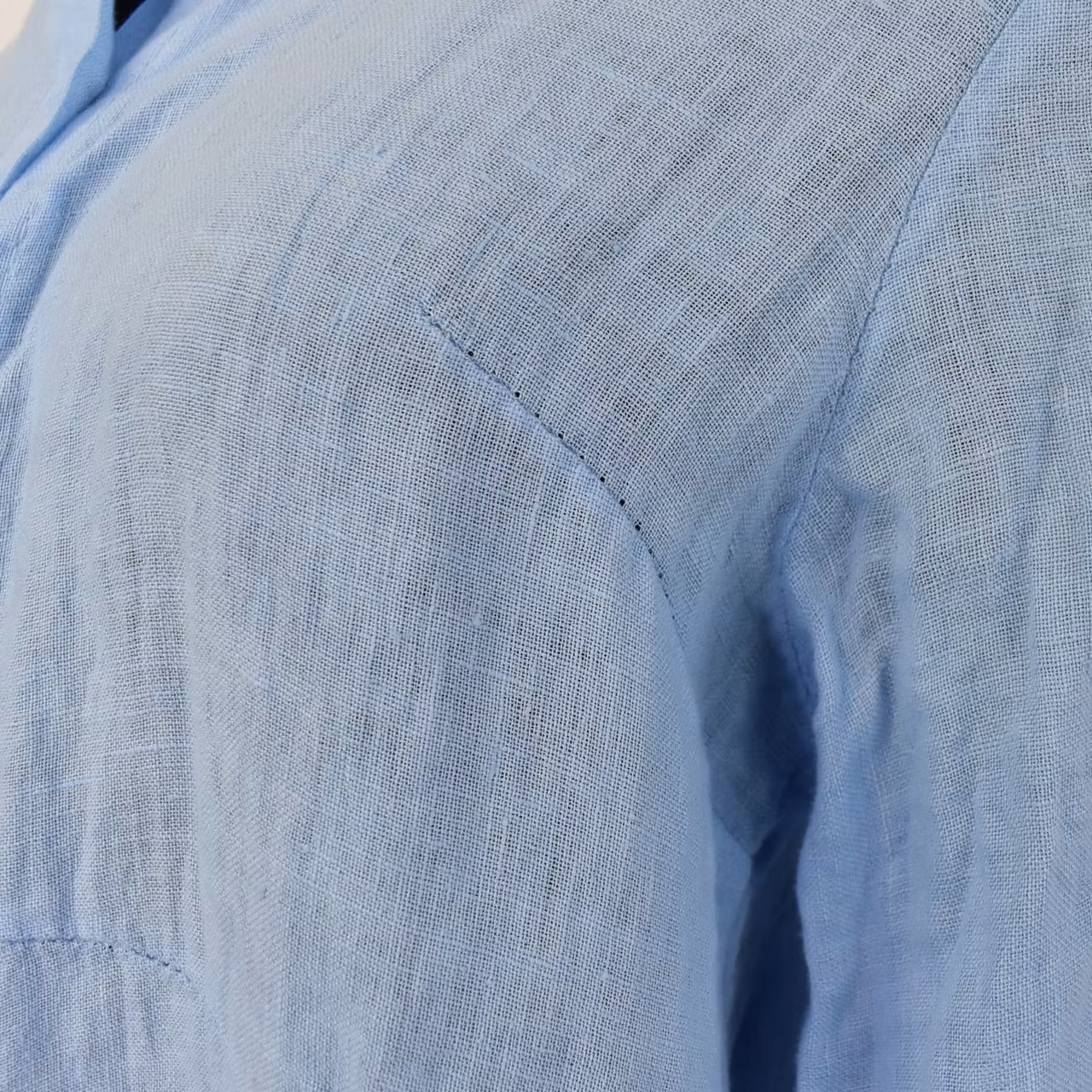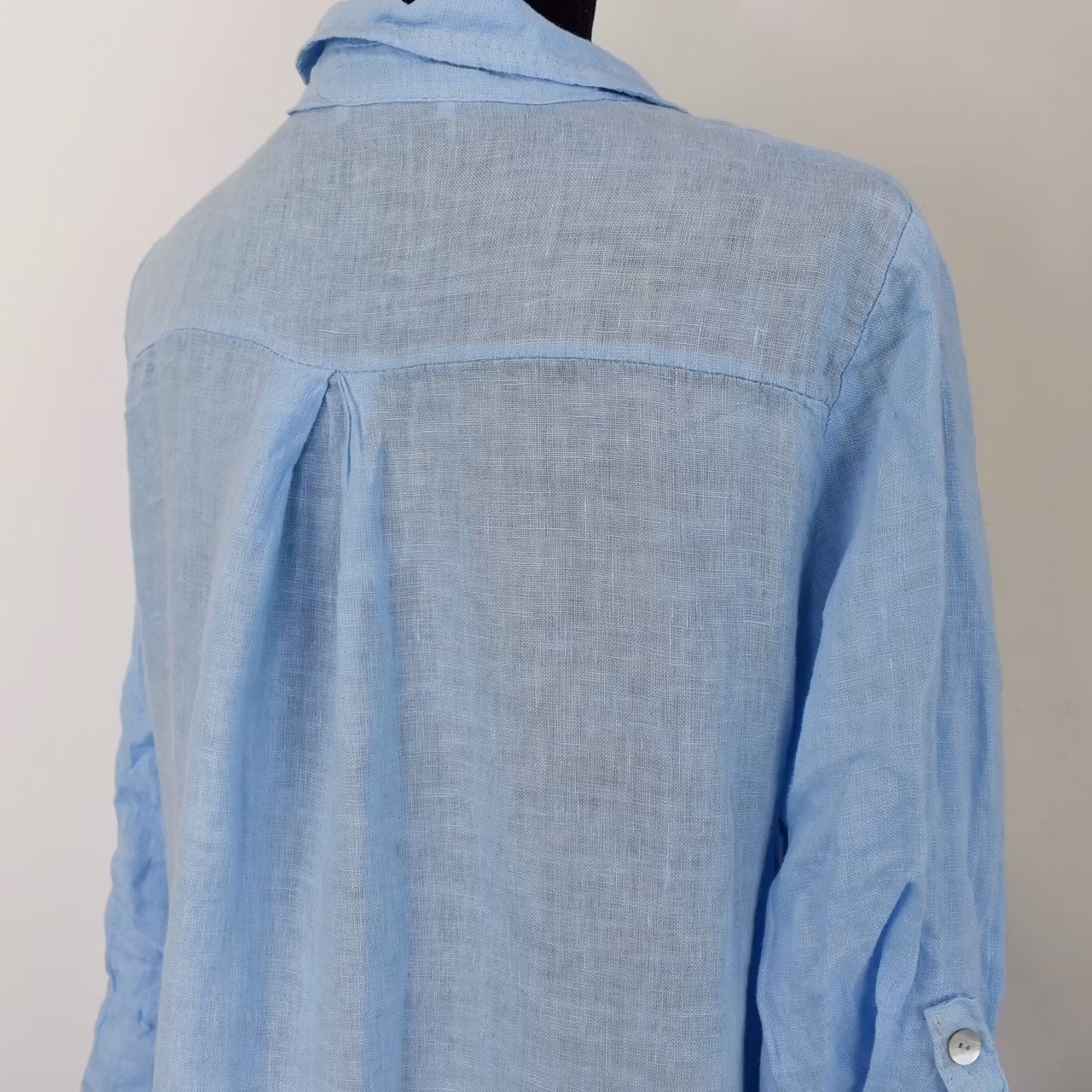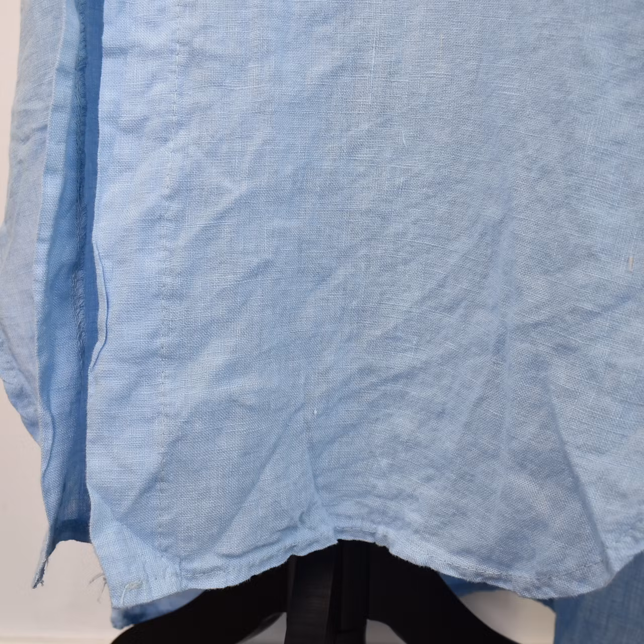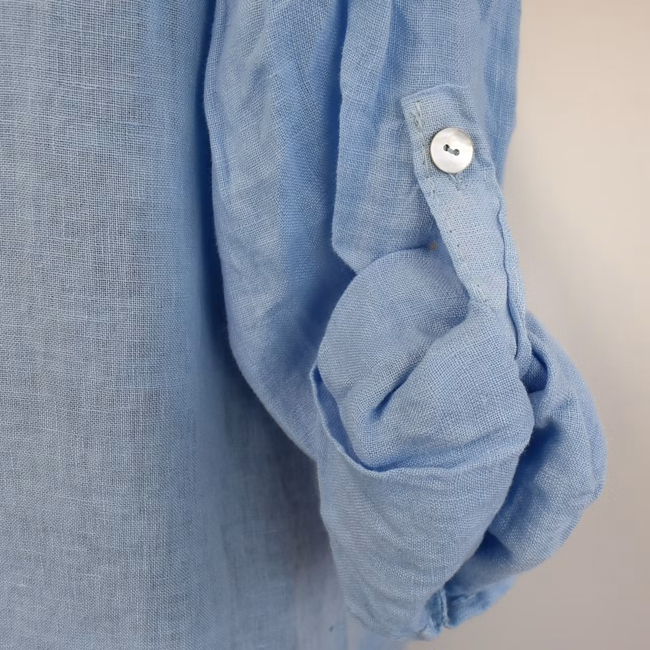 Det här är en så snygg och bekväm skjortklänning i skönt linnematerial. Ärmen kan vikas upp och fästas med knapp. Det finns slits i sidan och sprund i ryggen. Klänningen är något längre baktill och där är pärlemorknappar hela vägen framtill samt en i ärmslutet. Observera att materialet inte innehåller stretch och att tyget är något genomskinligt. Då vi alla är olika formade rekommenderar vi att man även använder sig av måtten för att bedöma om plagget passar eller ej. One Size - passar uppskattningsvis upp till M (passformen beror på varje persons unika form & proportioner). Modellen är storlek S, har en bröstvidd på cirka 88cm, och är 163cm lång.  Se ungefärliga mått längre ner i beskrivningen.