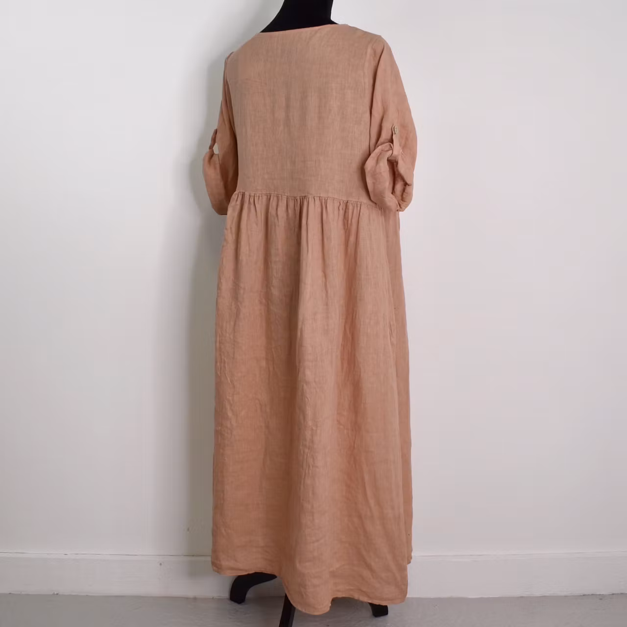 Det här är en underbar medellång klänning i tunt, mjukt linnetyg. Halsen är enkelt rundringad. Ärmen är smal och trekvartslång. Det går en söm runt midjan och från den är nederdelens tyg vackert rynkat. I sidorna finns gömda fickor. Materialet innehåller inte stretch och tyget är en aning genomskinligt. Observera att tyget, som halsringningen är förstärkt med på baksidan, kan vara synligt. Modellen har en bröstvidd på cirka 88cm, är 163cm lång och bär storlek S/M. Förekomsten av streck, färgskiftningar etc. inte är defekter utan en del av det som gör tyget vackert.