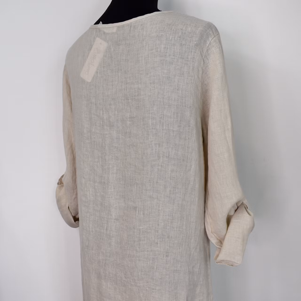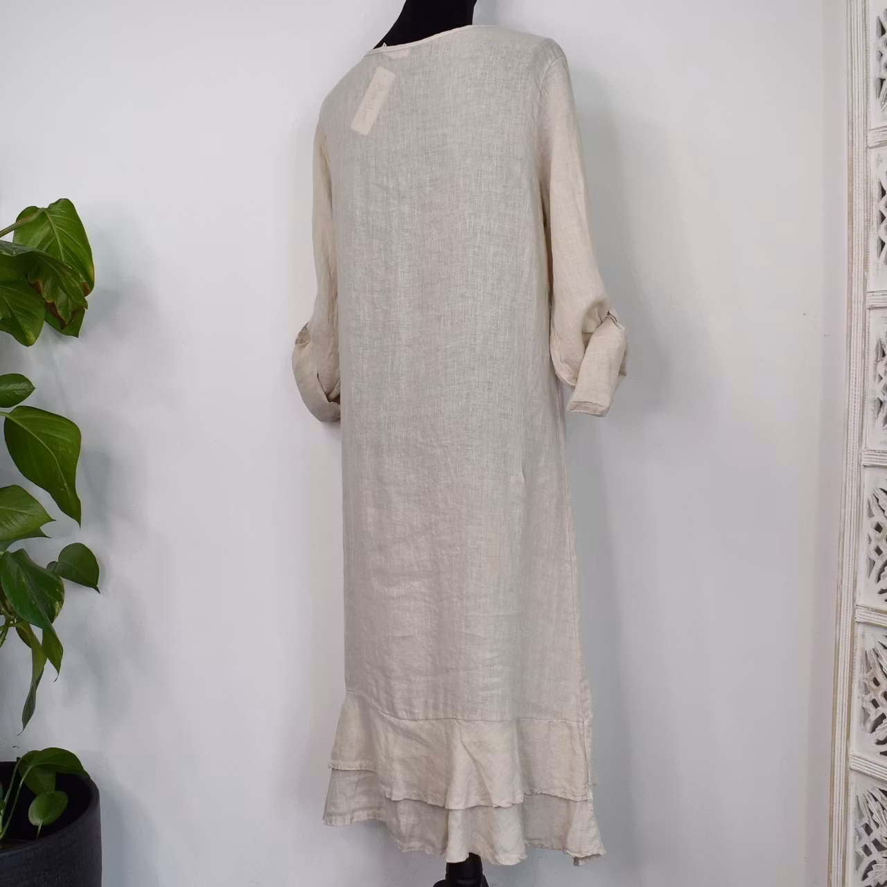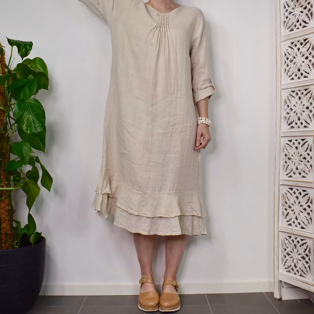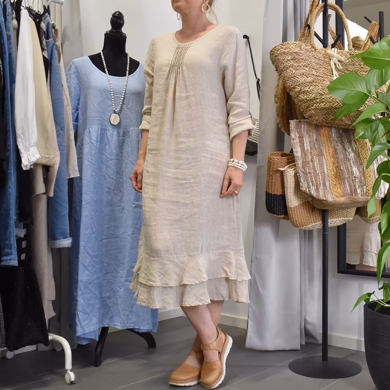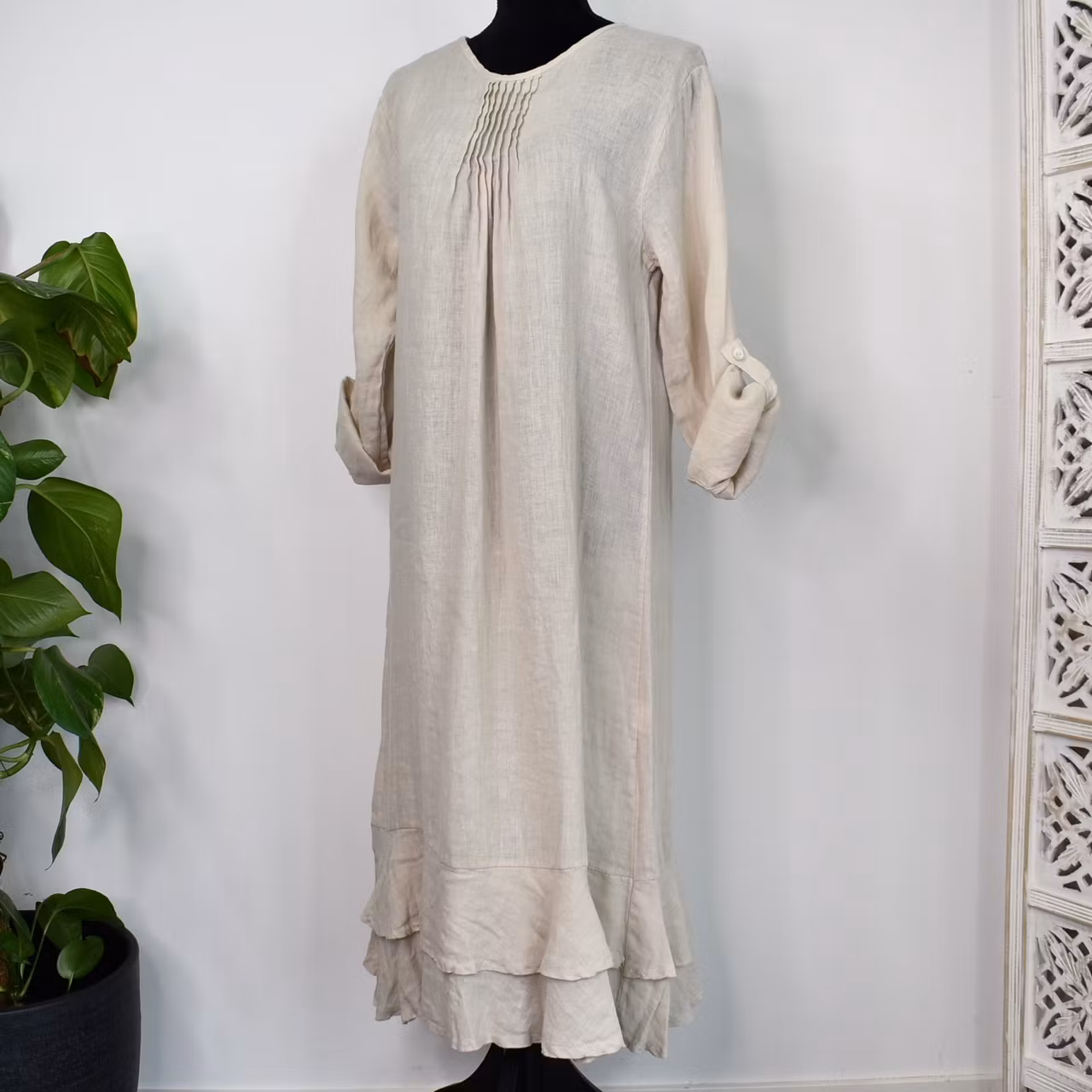 Detta är en mycket söt klänning i tunt, mjukt linnetyg. Längst ner på klänningen är där dubbel volang och under halsringningen finns dekorativa veck som ger vackert fall framtill. Halsen är enkelt rundringad. Ärmen är lång men kan vikas upp och fästas med knapp. Tänk på att klänningen inte är särskilt vid nertill (se måtten) och att vecken fram inte sitter helt centrerat.. Observera att materialet inte innehåller stretch och att tyget är något genomskinligt. Storlekar - S/M & L/XL. Då det är individuellt hur man upplever storlekar, och vi alla är olika formade, så rekommenderar vi att ta hjälp av måtten längre ner i beskrivningen för att se vilken storlek som kan passa. Modellen har en bröstvidd på cirka 88cm, är 163cm lång och bär storlek S/M. Observera att förekomsten av streck, färgskiftningar etc. inte är defekter utan en del av det som gör tyget vackert.