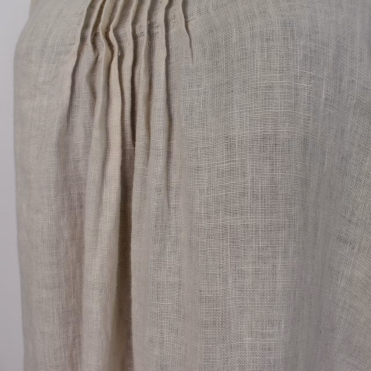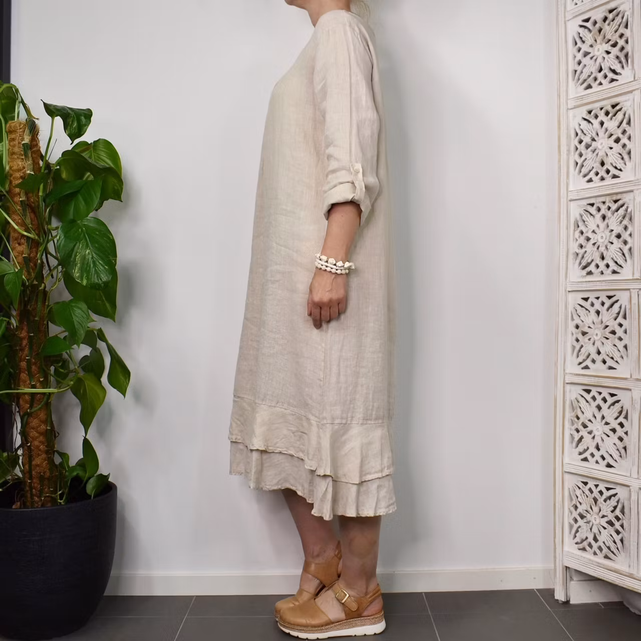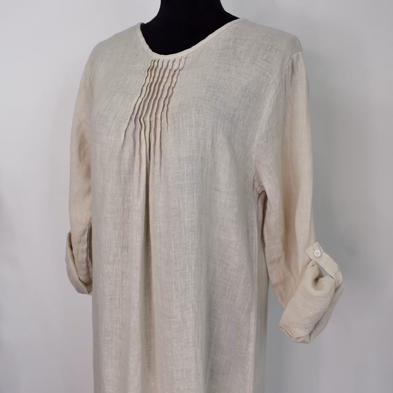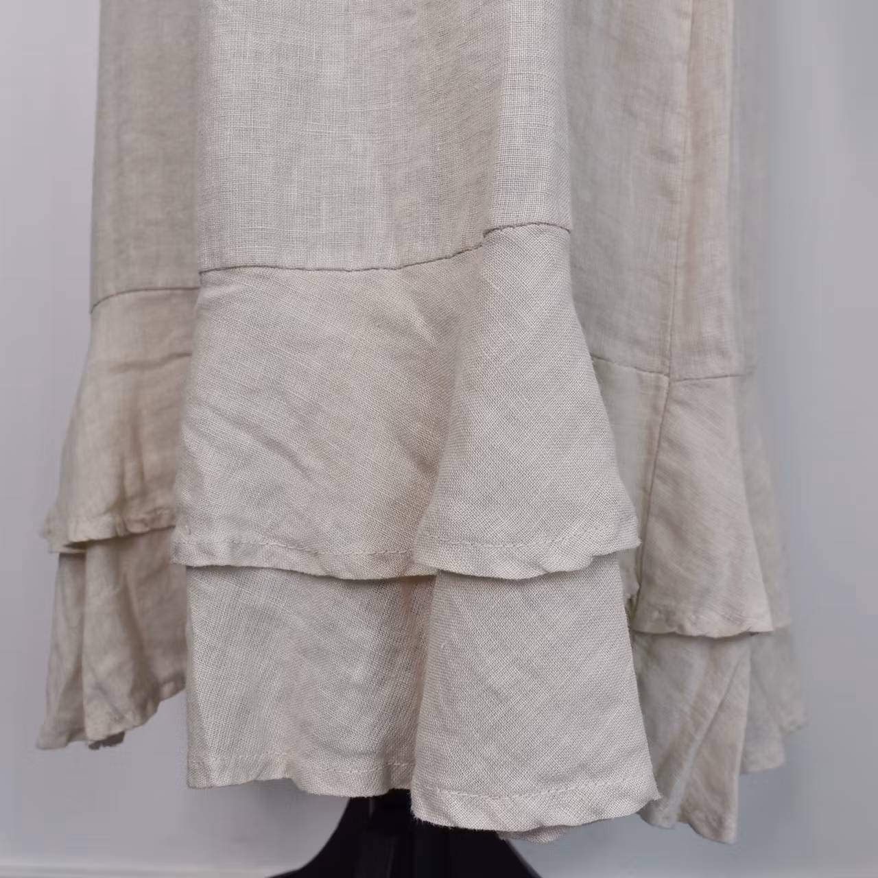 Detta är en mycket söt klänning i tunt, mjukt linnetyg. Längst ner på klänningen är där dubbel volang och under halsringningen finns dekorativa veck som ger vackert fall framtill. Halsen är enkelt rundringad. Ärmen är lång men kan vikas upp och fästas med knapp. Tänk på att klänningen inte är särskilt vid nertill (se måtten) och att vecken fram inte sitter helt centrerat.. Observera att materialet inte innehåller stretch och att tyget är något genomskinligt. Storlekar - S/M & L/XL. Då det är individuellt hur man upplever storlekar, och vi alla är olika formade, så rekommenderar vi att ta hjälp av måtten längre ner i beskrivningen för att se vilken storlek som kan passa. Modellen har en bröstvidd på cirka 88cm, är 163cm lång och bär storlek S/M. Observera att förekomsten av streck, färgskiftningar etc. inte är defekter utan en del av det som gör tyget vackert.