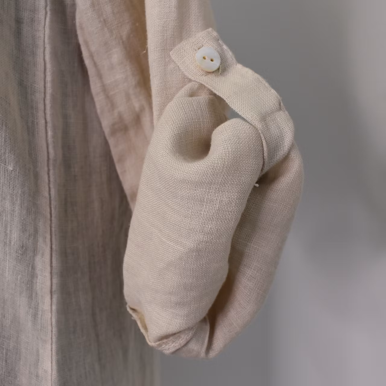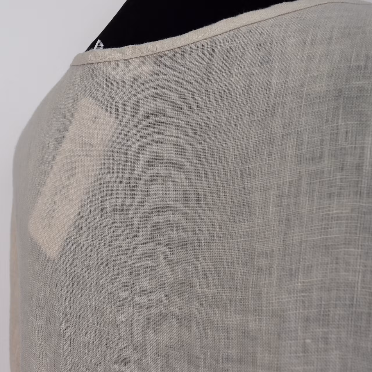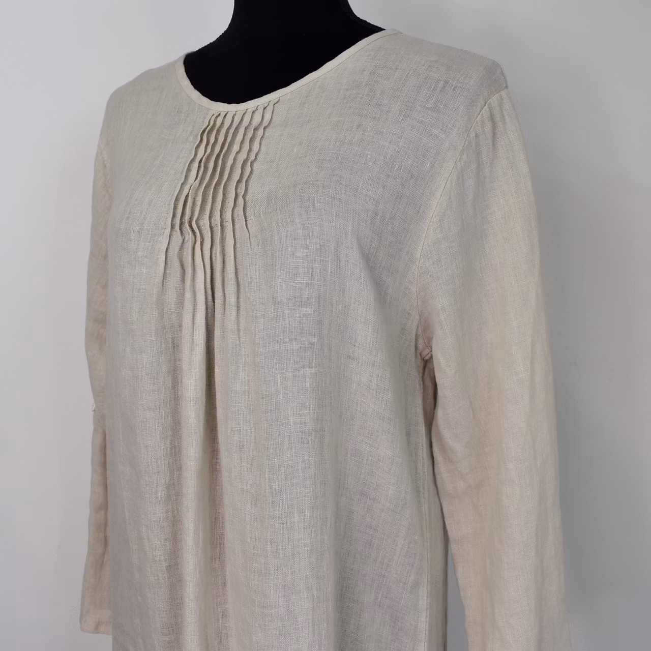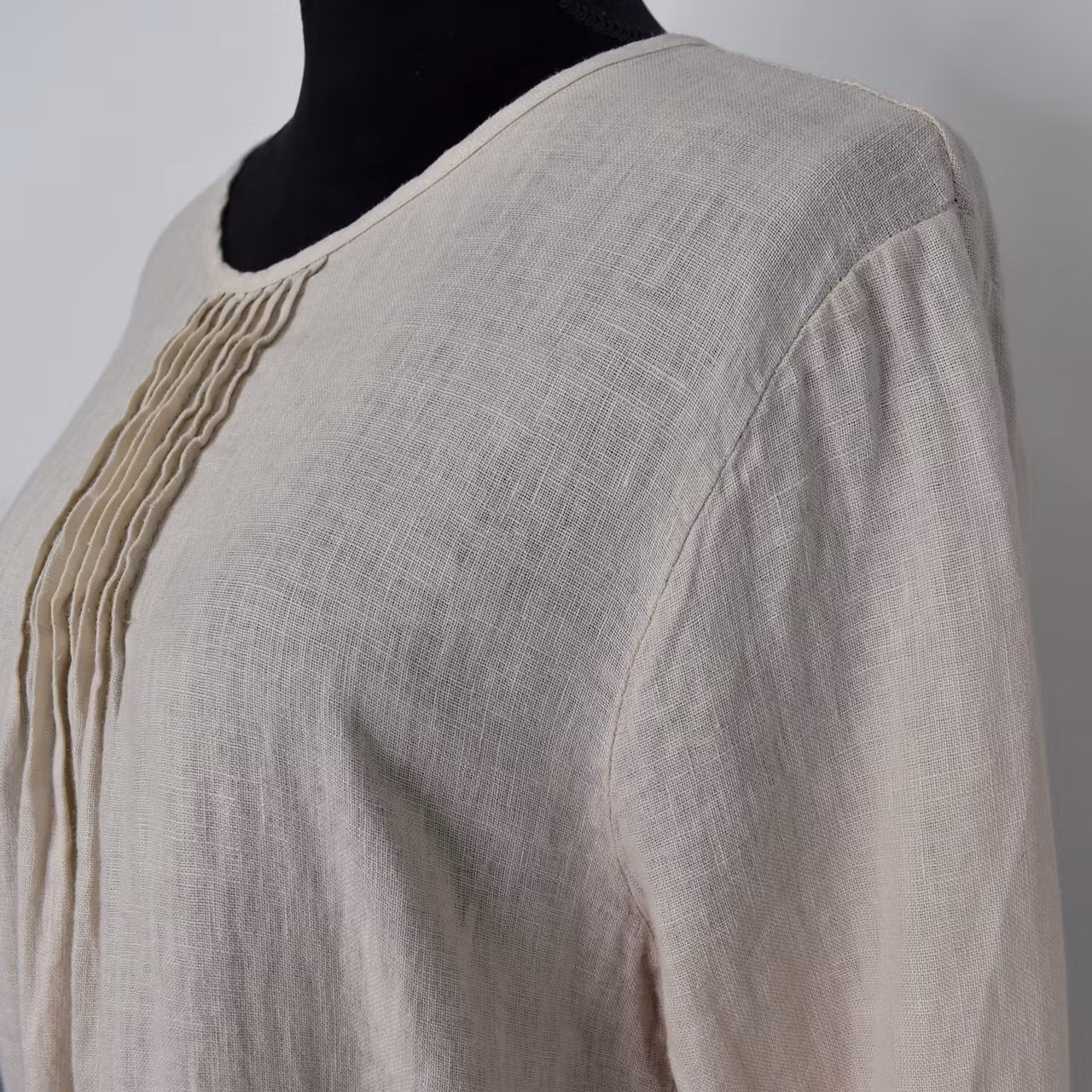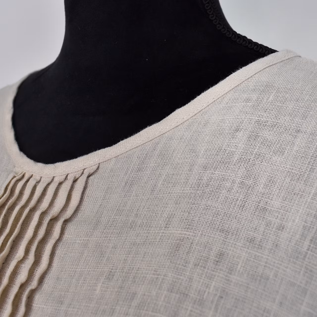 Detta är en mycket söt klänning i tunt, mjukt linnetyg. Längst ner på klänningen är där dubbel volang och under halsringningen finns dekorativa veck som ger vackert fall framtill. Halsen är enkelt rundringad. Ärmen är lång men kan vikas upp och fästas med knapp. Tänk på att klänningen inte är särskilt vid nertill (se måtten) och att vecken fram inte sitter helt centrerat.. Observera att materialet inte innehåller stretch och att tyget är något genomskinligt. Storlekar - S/M & L/XL. Då det är individuellt hur man upplever storlekar, och vi alla är olika formade, så rekommenderar vi att ta hjälp av måtten längre ner i beskrivningen för att se vilken storlek som kan passa. Modellen har en bröstvidd på cirka 88cm, är 163cm lång och bär storlek S/M. Observera att förekomsten av streck, färgskiftningar etc. inte är defekter utan en del av det som gör tyget vackert.