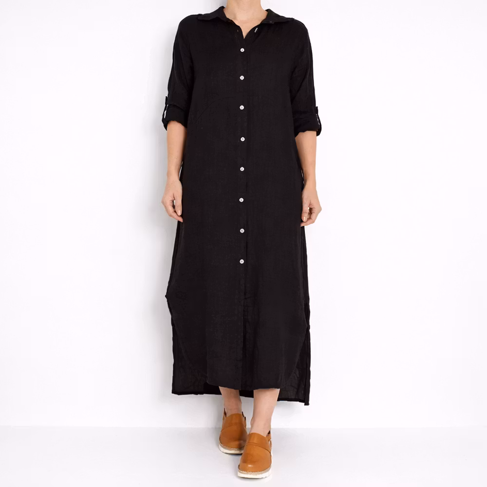 Det här är en så snygg och bekväm skjortklänning i tunt vävt linnetyg. Ärmen är lång men kan vikas upp och fästas med knapp. Det finns en rundad slits i sidan och sprund i ryggen. Klänningen är något längre baktill och där är pärlemorknappar hela vägen framtill, samt en i ärmslutet. Tyget innehåller inte stretch. Modellen har en bröstvidd på cirka 88cm och är 163cm lång. Observera att förekomsten av streck, färgskiftningar etc. inte är defekter utan en del av det som gör tyget vackert.