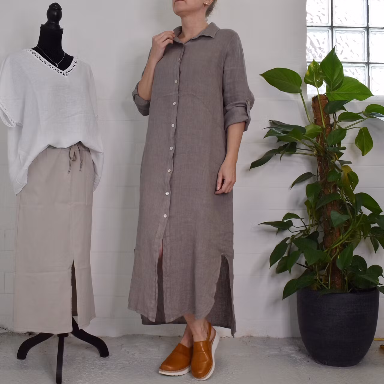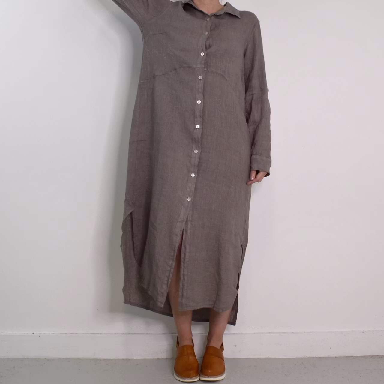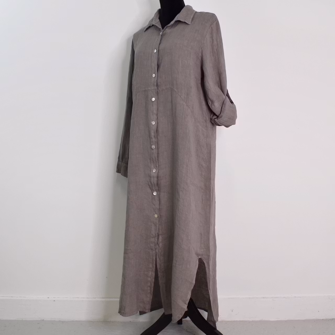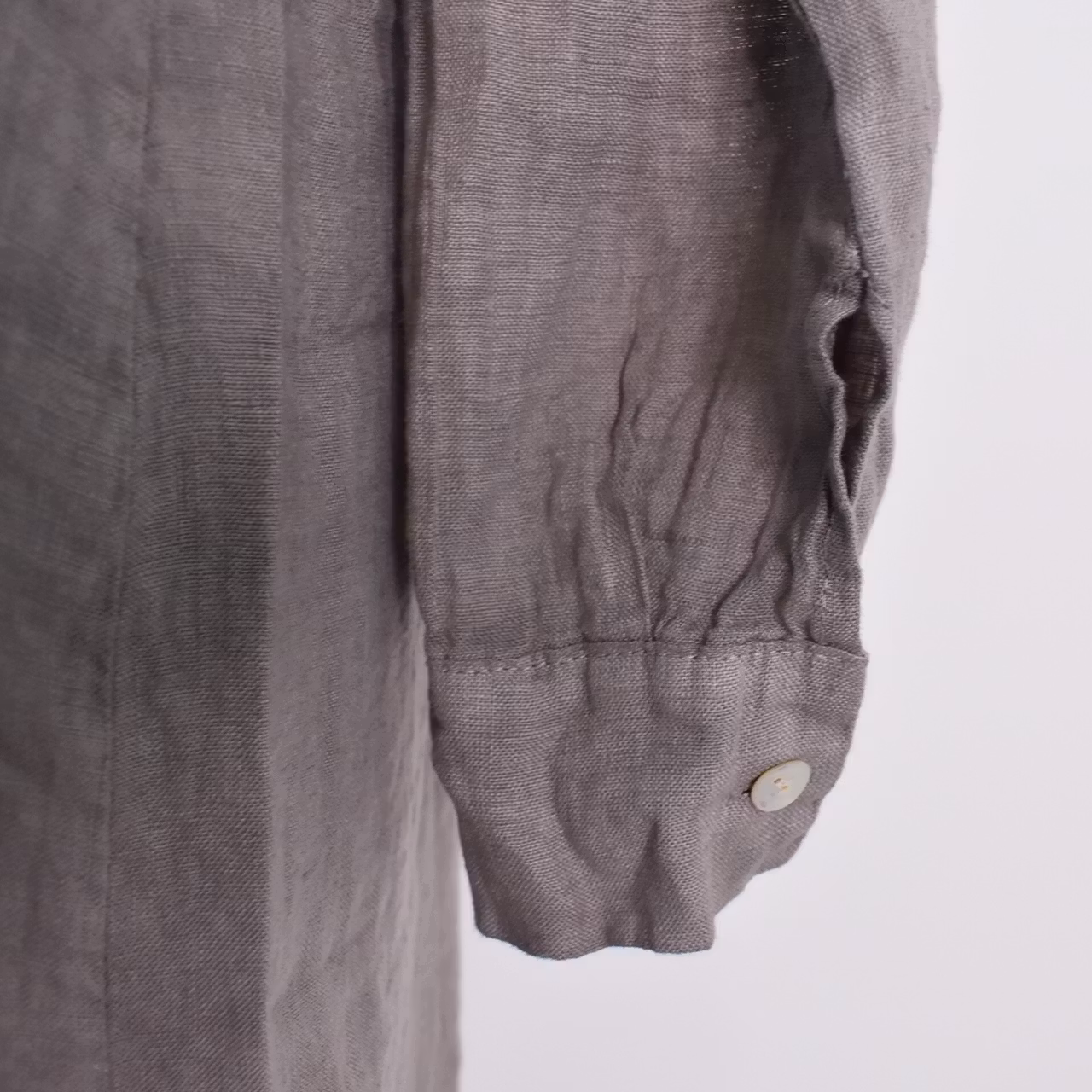 Det här är en så snygg och bekväm skjortklänning i tunt vävt linnetyg. Ärmen är lång men kan vikas upp och fästas med knapp. Det finns en rundad slits i sidan och sprund i ryggen. Klänningen är något längre baktill och där är pärlemorknappar hela vägen framtill, samt en i ärmslutet. Tyget innehåller inte stretch. Modellen har en bröstvidd på cirka 88cm och är 163cm lång. Observera att förekomsten av streck, färgskiftningar etc. inte är defekter utan en del av det som gör tyget vackert.