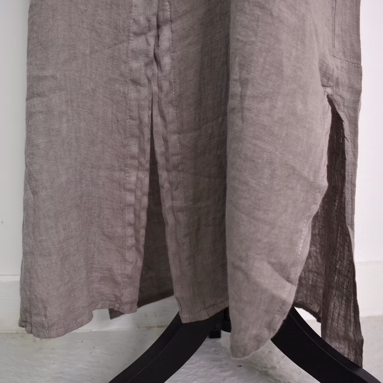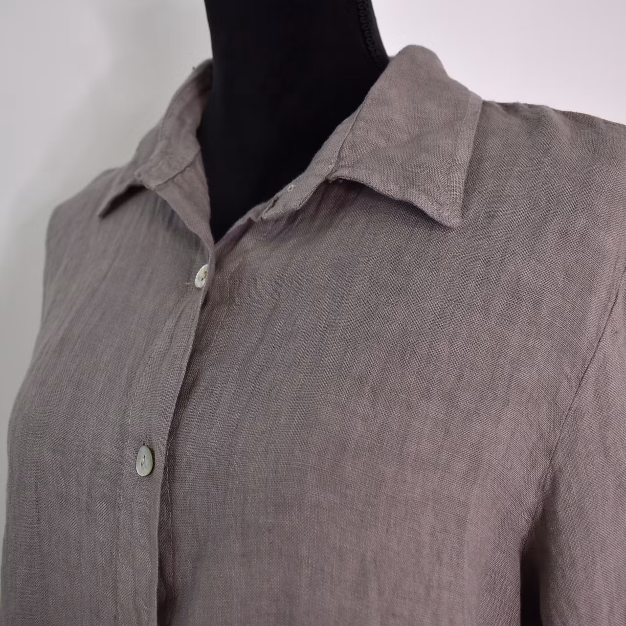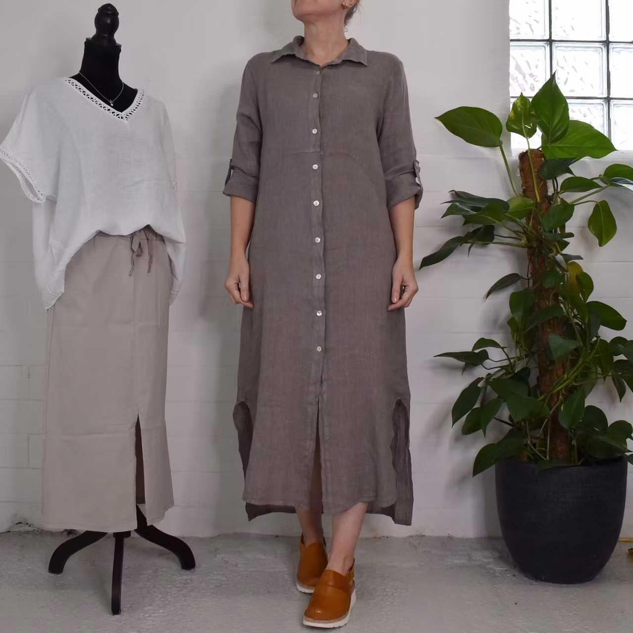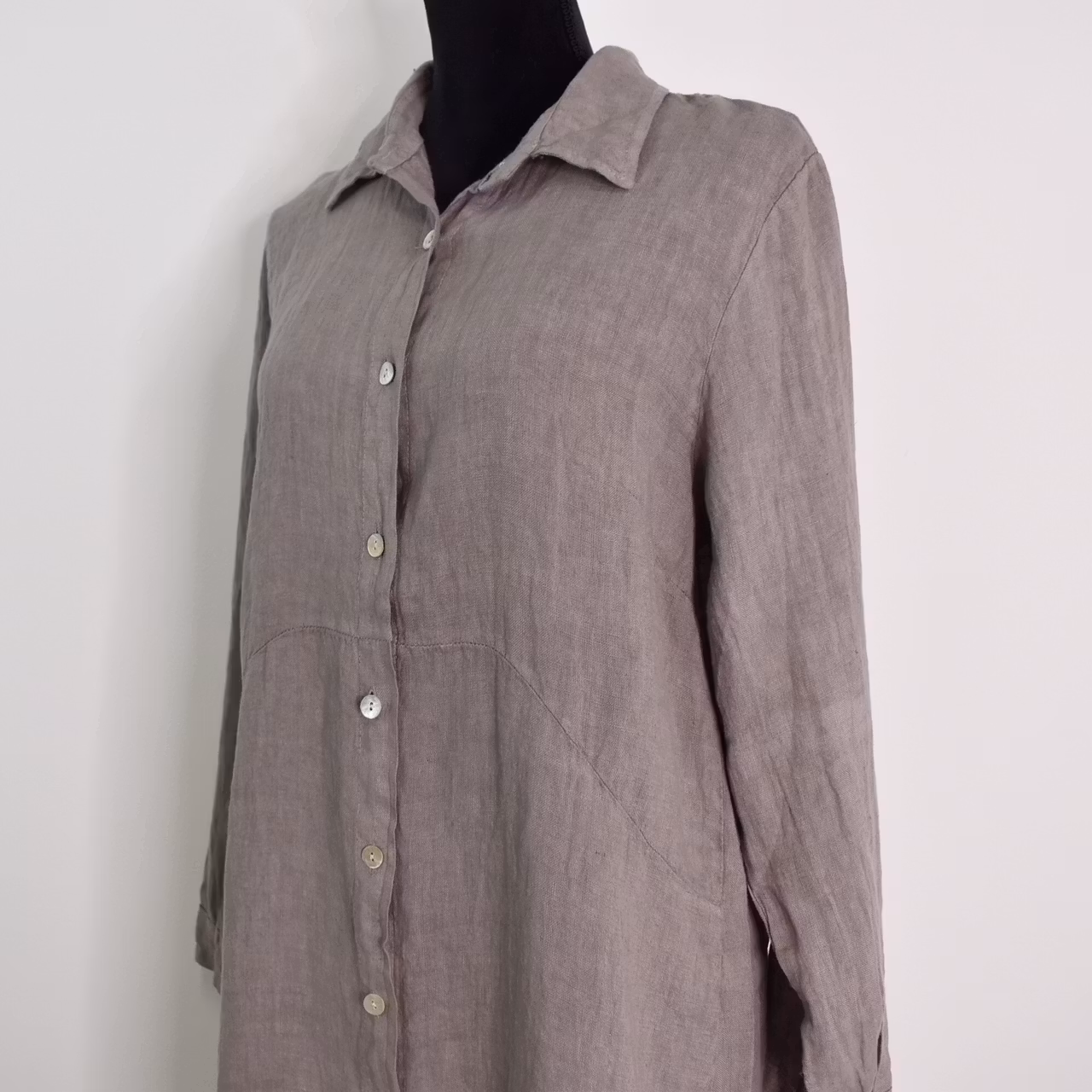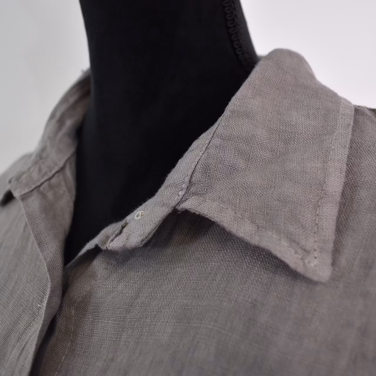 Det här är en så snygg och bekväm skjortklänning i tunt vävt linnetyg. Ärmen är lång men kan vikas upp och fästas med knapp. Det finns en rundad slits i sidan och sprund i ryggen. Klänningen är något längre baktill och där är pärlemorknappar hela vägen framtill, samt en i ärmslutet. Tyget innehåller inte stretch. Modellen har en bröstvidd på cirka 88cm och är 163cm lång. Observera att förekomsten av streck, färgskiftningar etc. inte är defekter utan en del av det som gör tyget vackert.