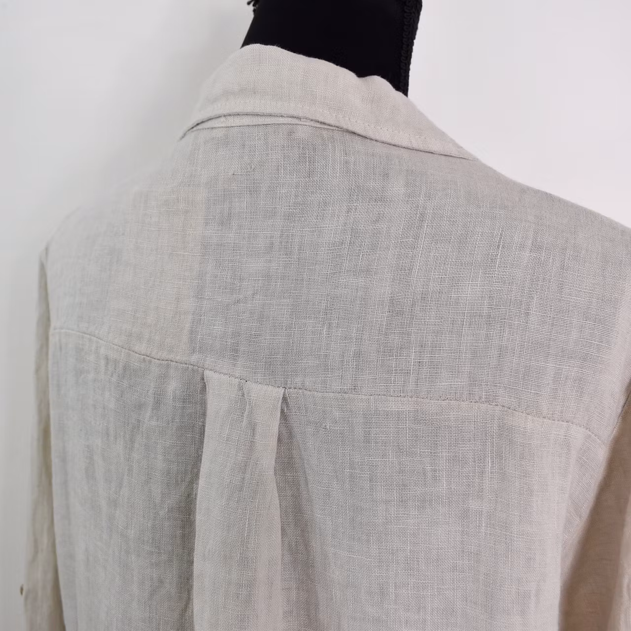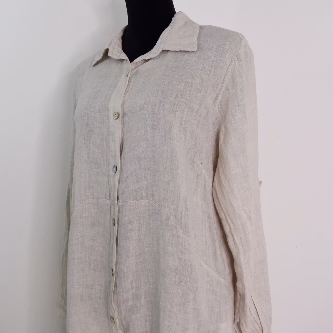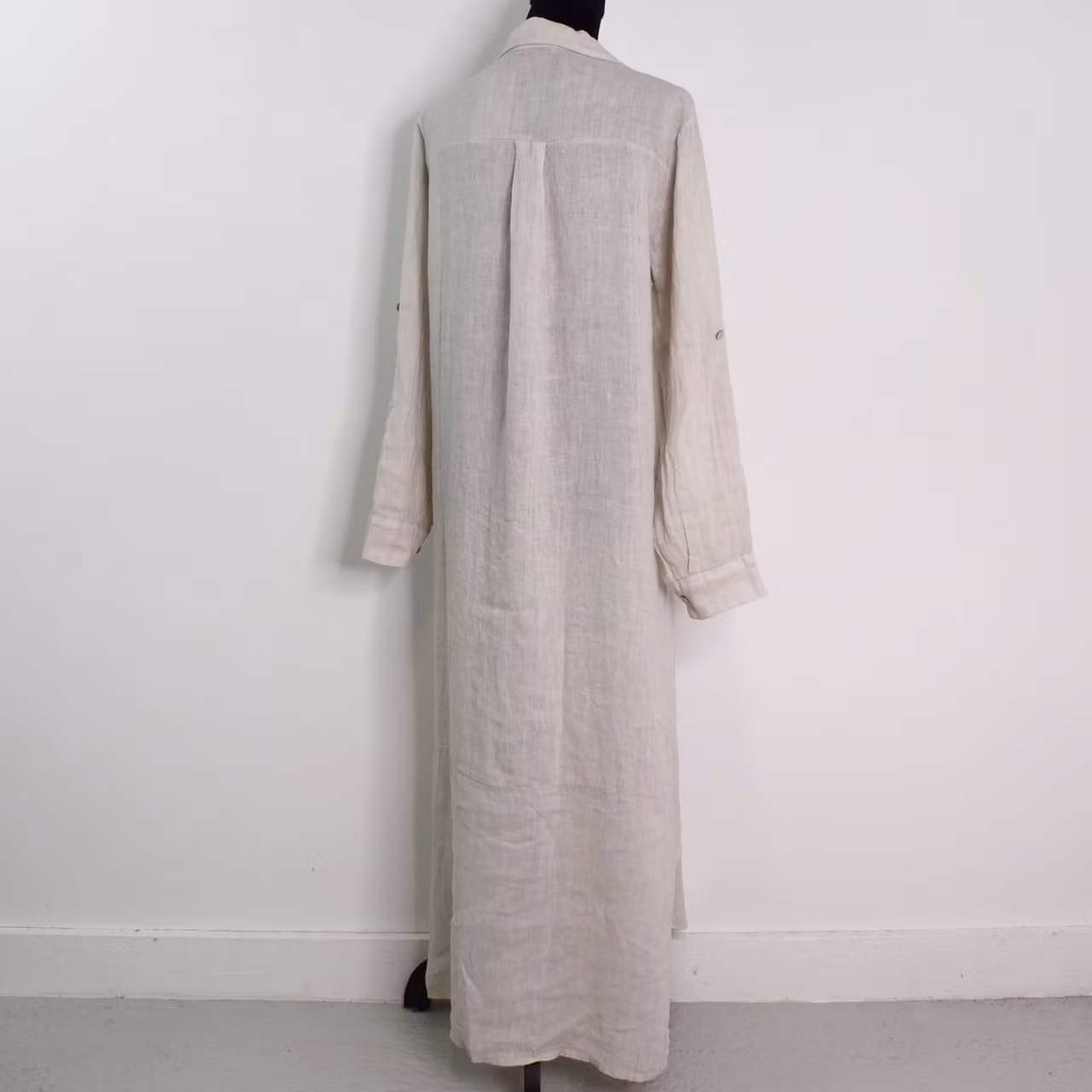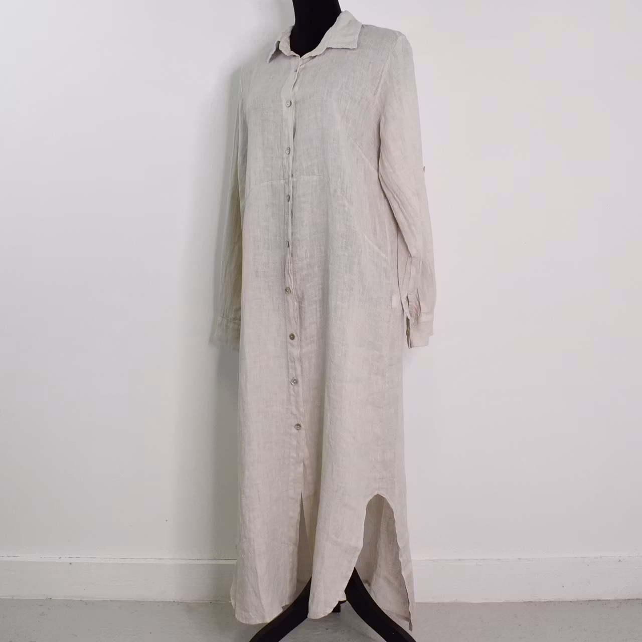 Det här är en så snygg och bekväm skjortklänning i tunt vävt linnetyg. Ärmen är lång men kan vikas upp och fästas med knapp. Det finns en rundad slits i sidan och sprund i ryggen. Klänningen är något längre baktill och där är pärlemorknappar hela vägen framtill, samt en i ärmslutet. Tyget innehåller inte stretch. Modellen har en bröstvidd på cirka 88cm och är 163cm lång. Observera att förekomsten av streck, färgskiftningar etc. inte är defekter utan en del av det som gör tyget vackert.