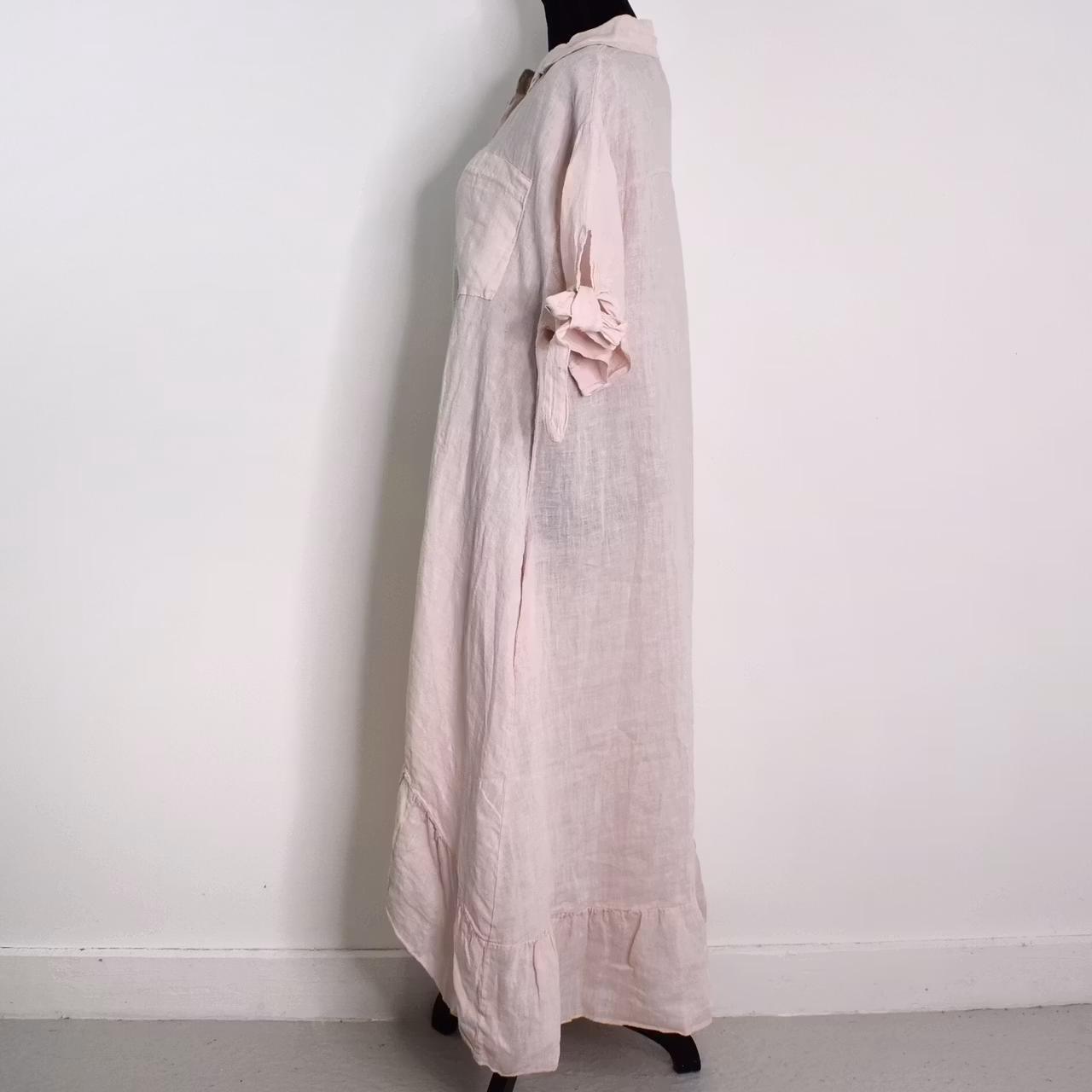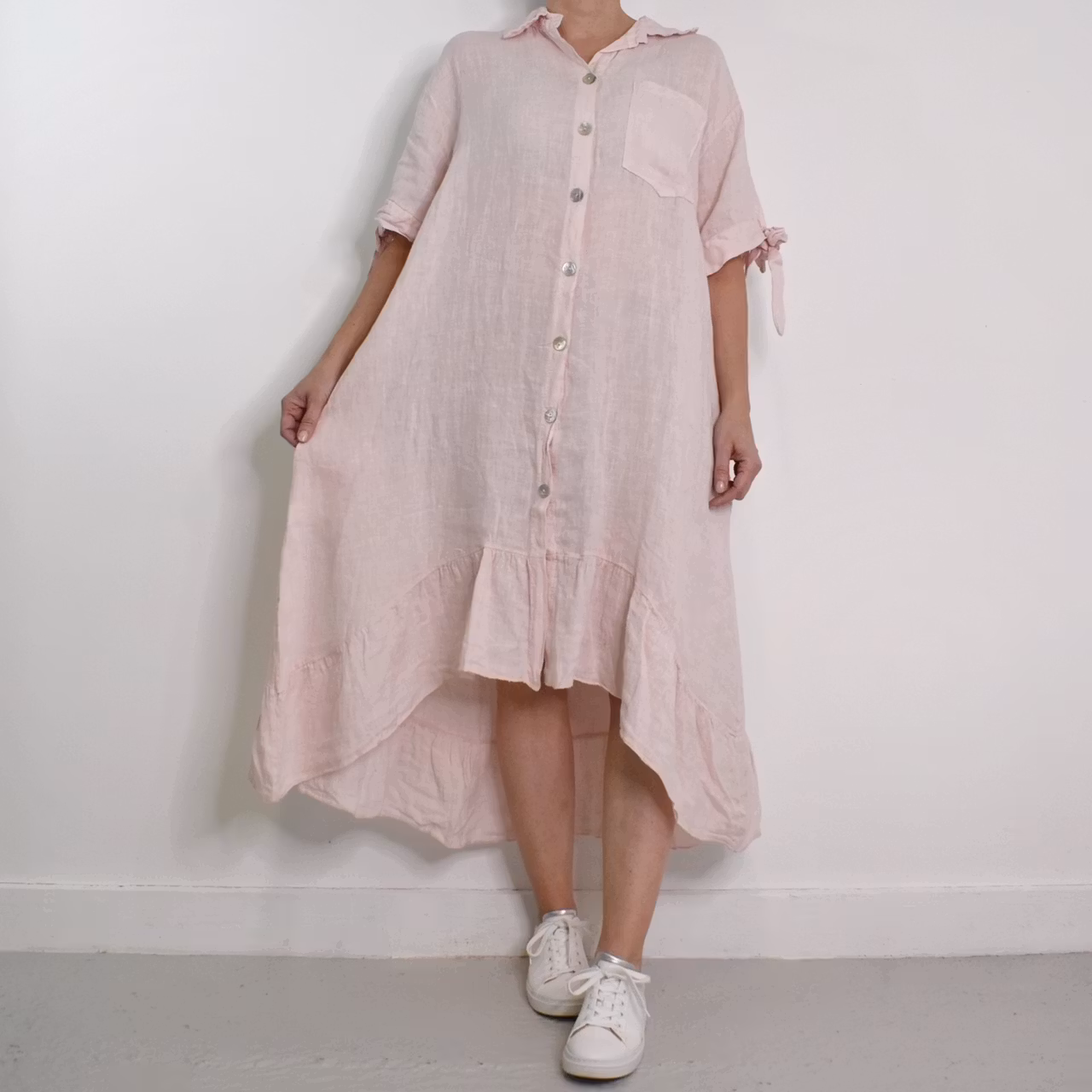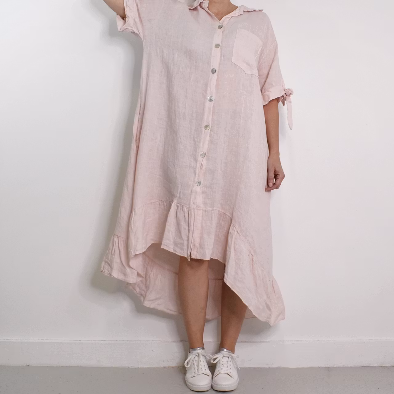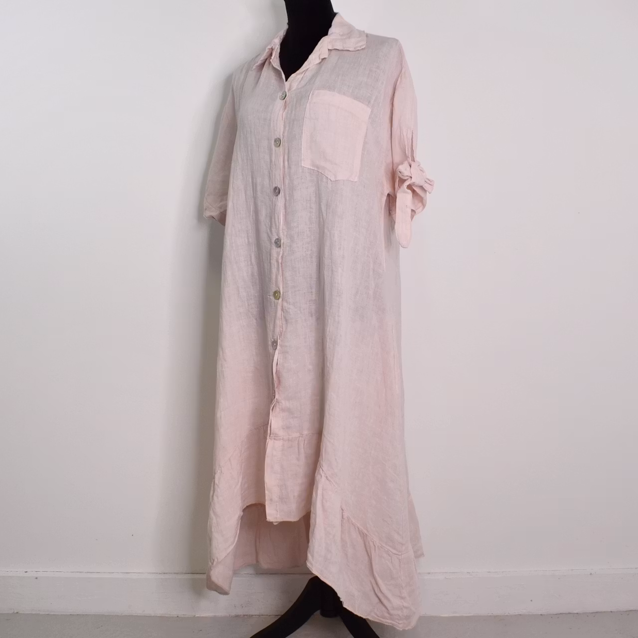 Det här är en söt linneklänning med skjortkrage, knappar hela vägen framtill samt volangkant längst ner. På vänster bröst finns en öppen ficka. Klänningen är vidare nertill och längre baktill. Det finns gömda fickor i sidorna och i slutet på den korta ärmen är där knytband. På ryggen är där ett dekorativt sprund. Materialet innehåller inte stretch. Tyget är tunt och glesvävt. Modellen har en bröstvidd på cirka 88cm och är 163cm lång. Observera att förekomsten av streck, färgskiftningar etc. inte är defekter utan en del av det som gör tyget vackert.