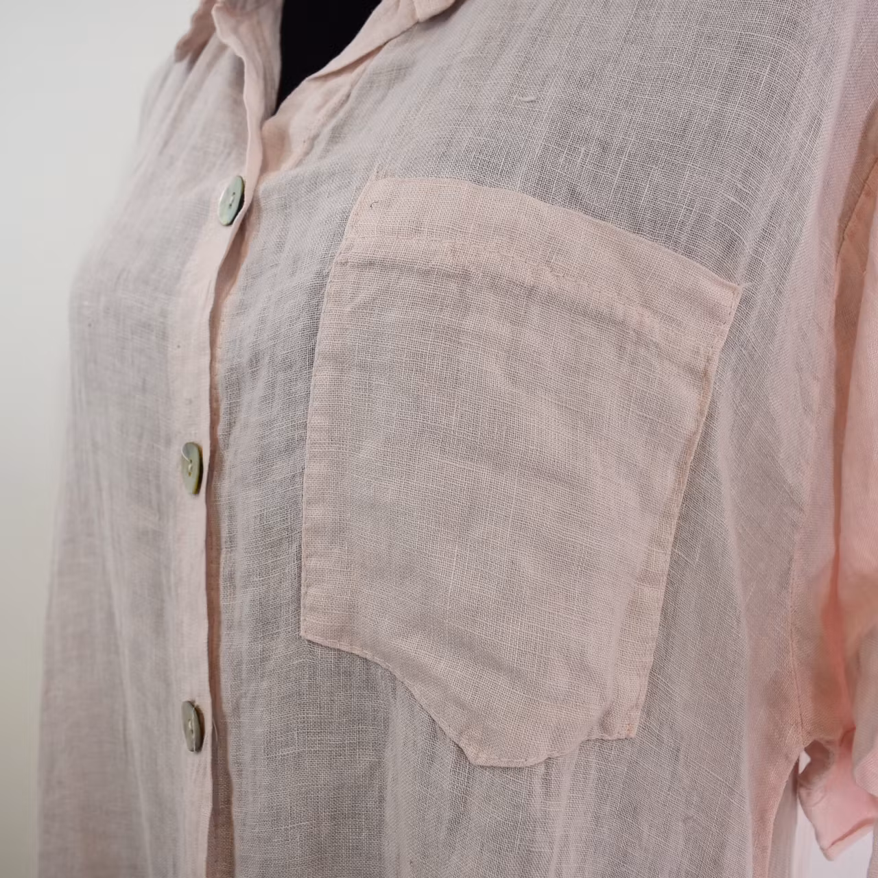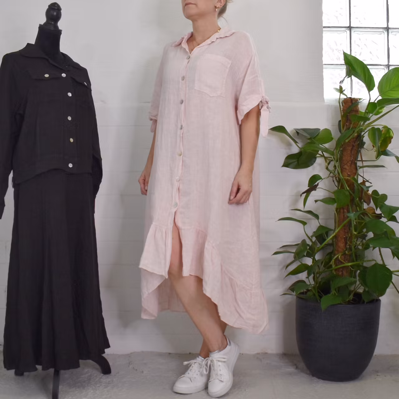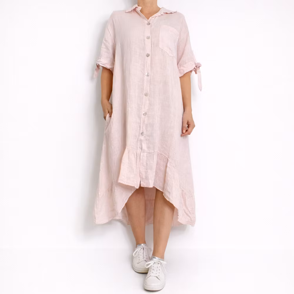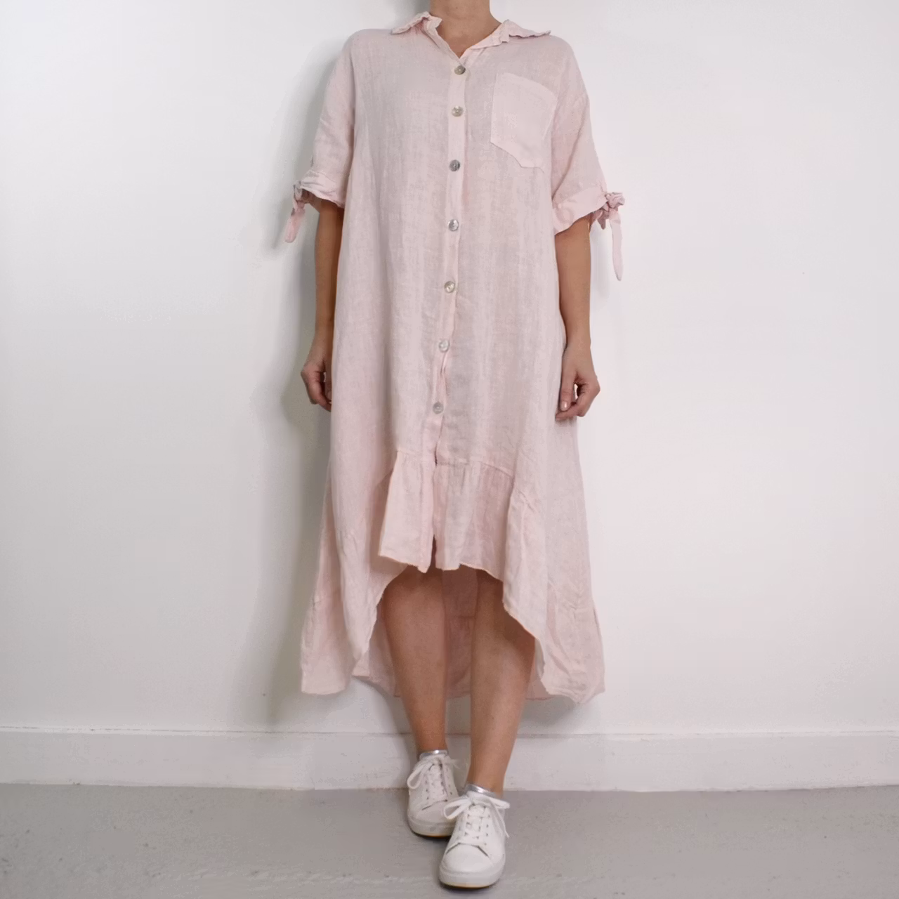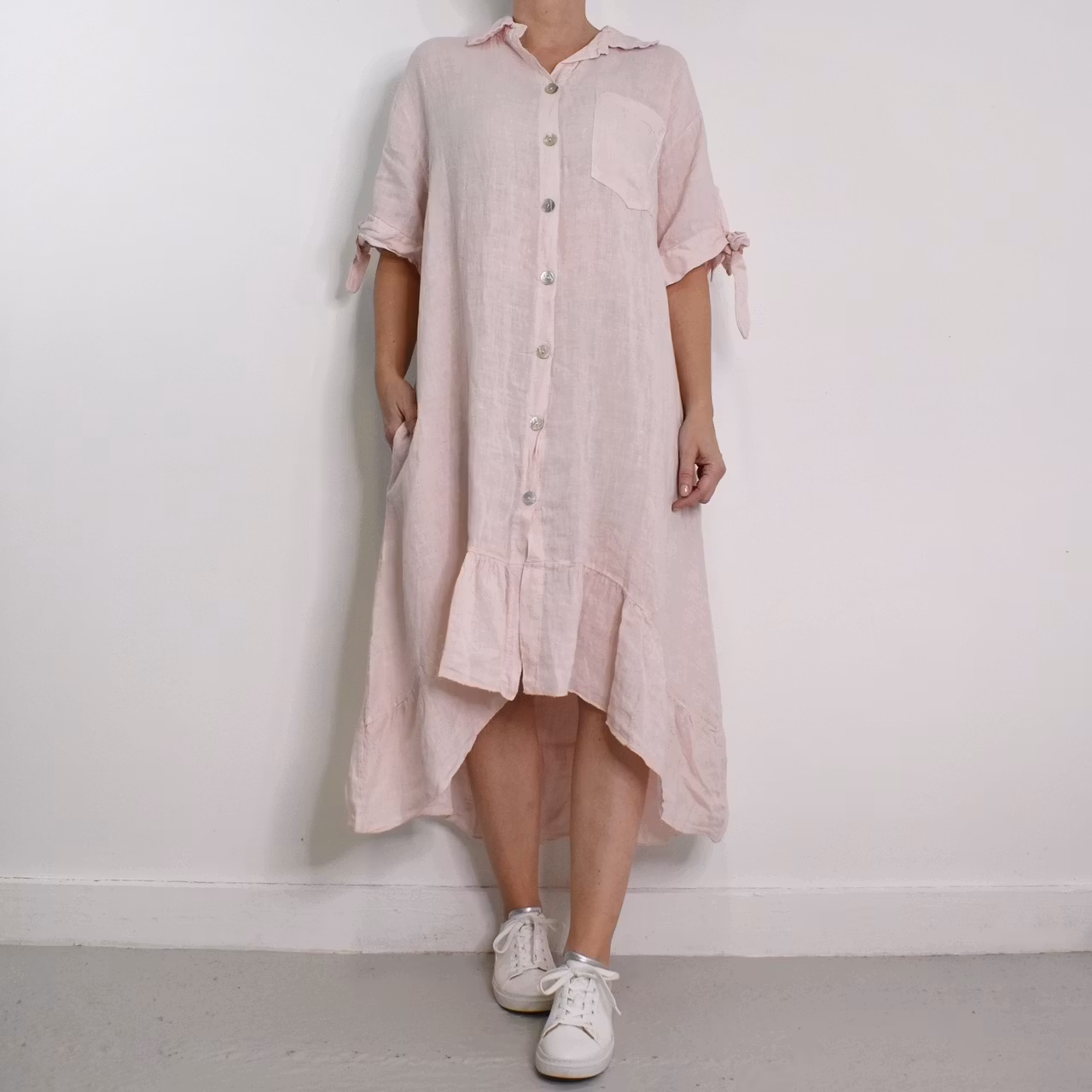 Det här är en söt linneklänning med skjortkrage, knappar hela vägen framtill samt volangkant längst ner. På vänster bröst finns en öppen ficka. Klänningen är vidare nertill och längre baktill. Det finns gömda fickor i sidorna och i slutet på den korta ärmen är där knytband. På ryggen är där ett dekorativt sprund. Materialet innehåller inte stretch. Tyget är tunt och glesvävt. Modellen har en bröstvidd på cirka 88cm och är 163cm lång. Observera att förekomsten av streck, färgskiftningar etc. inte är defekter utan en del av det som gör tyget vackert.
