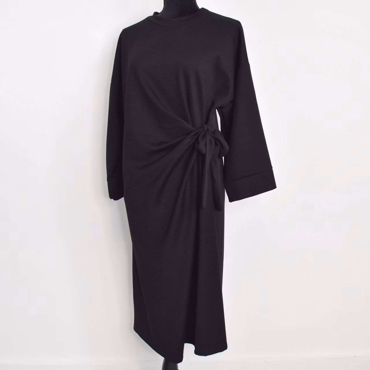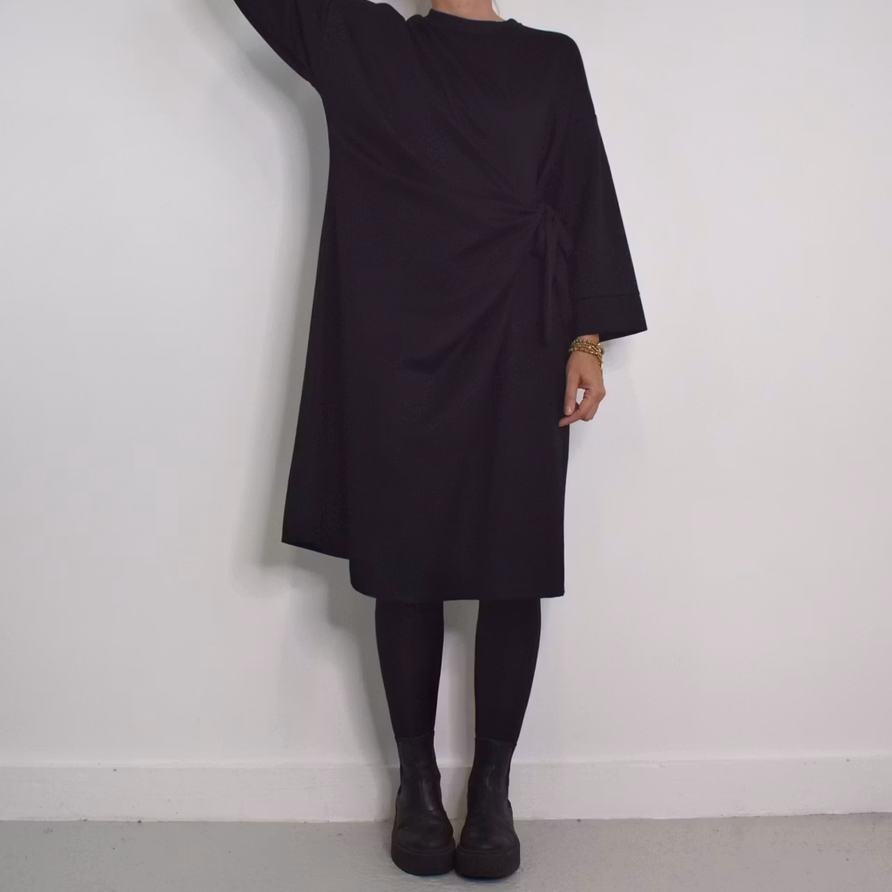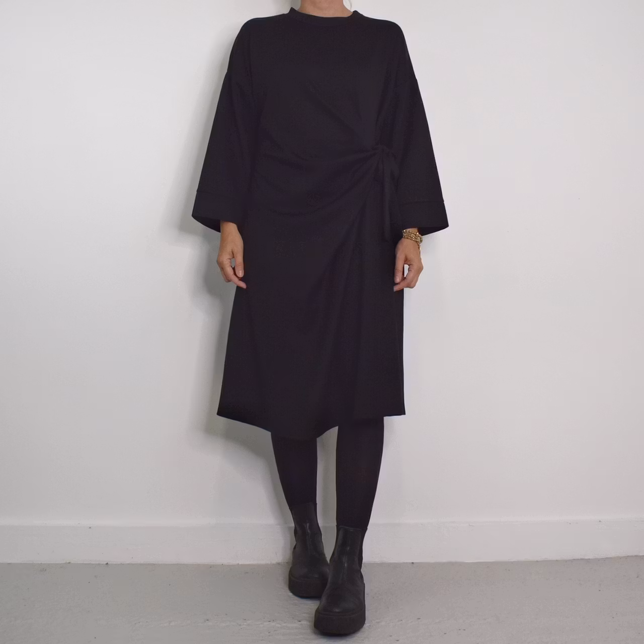 Det här är en så fin och användbar klänning i mjukt, stretchigt material. Halsen är enkelt rundringad och axeln är något nerhasad. Ärmen är vid och i midjan finns det två band som man kan knyta enligt önskemål. Tyget är något rynkat vid banden, se detaljbild. Klänningen är något vidare nertill. Modellen har en bröstvidd på cirka 88cm, är 163cm lång och bär S/M.