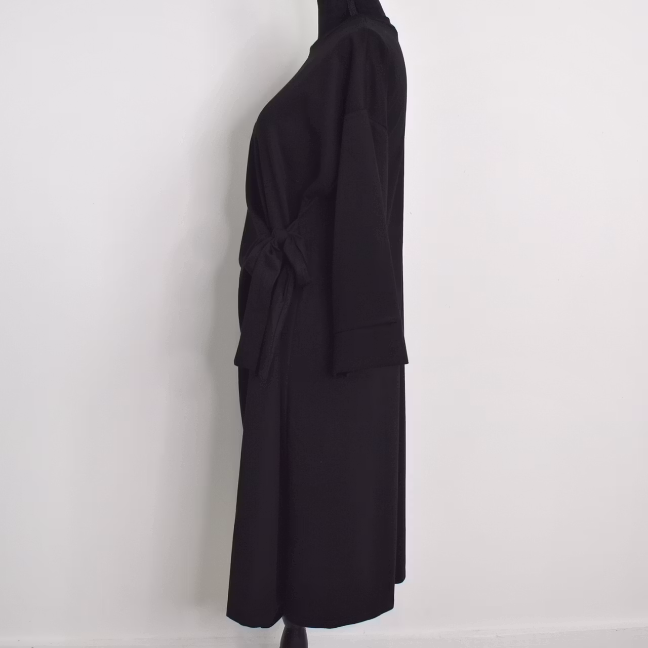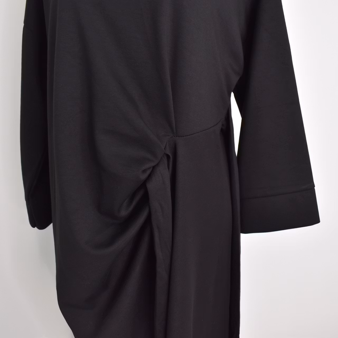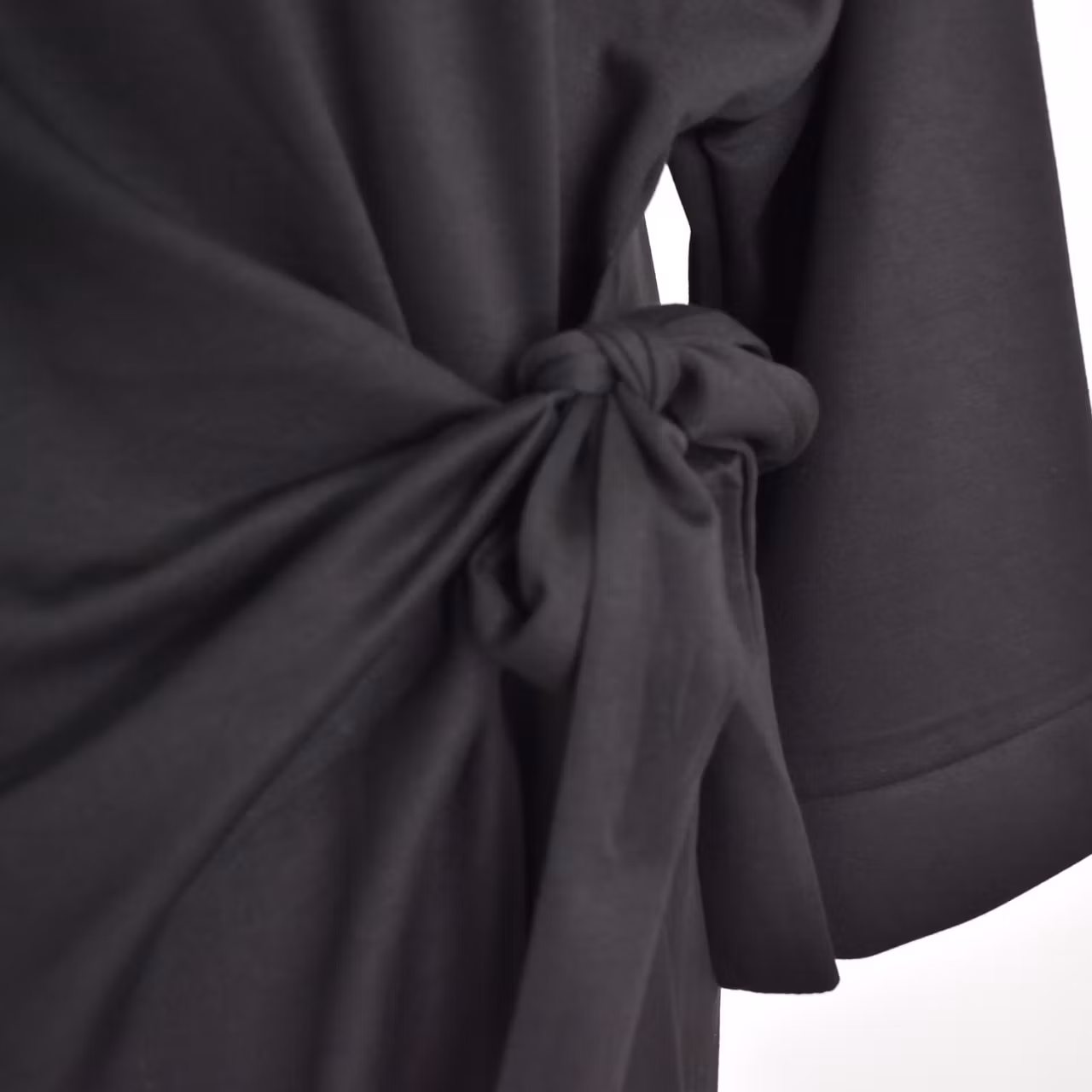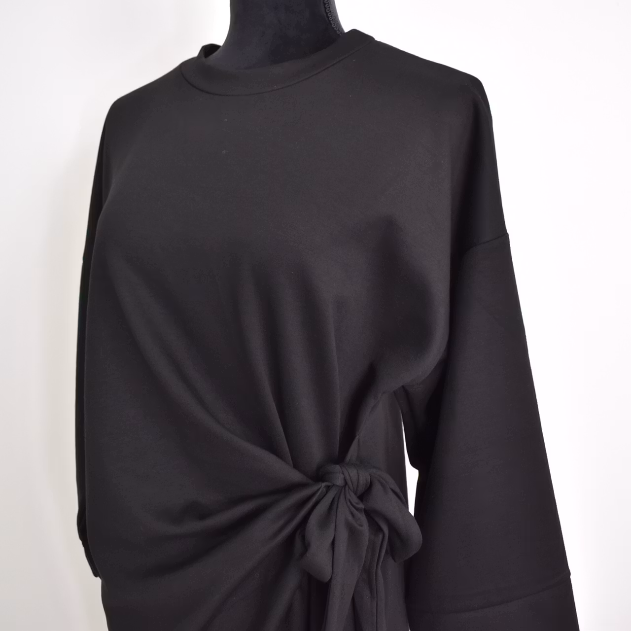 Det här är en så fin och användbar klänning i mjukt, stretchigt material. Halsen är enkelt rundringad och axeln är något nerhasad. Ärmen är vid och i midjan finns det två band som man kan knyta enligt önskemål. Tyget är något rynkat vid banden, se detaljbild. Klänningen är något vidare nertill. Modellen har en bröstvidd på cirka 88cm, är 163cm lång och bär S/M.
