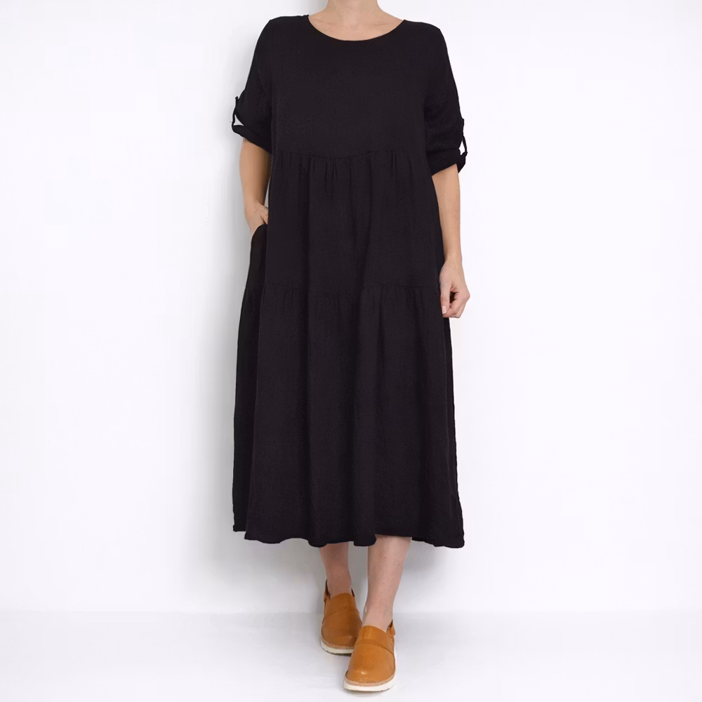 Det här är en vacker klänning i tunt vävt linnetyg. Halsen är elegant rundringad och från midjan blir klänningen vidare med breda volanger. Ärmen är halvlång men kan vikas upp och fästas med knapp. I sidorna finns gömda fickor. Tyget innehåller inte stretch. Modellen har en bröstvidd på cirka 88cm och är 163cm lång. Observera att förekomsten av streck, färgskiftningar etc. inte är defekter utan en del av det som gör tyget vackert.