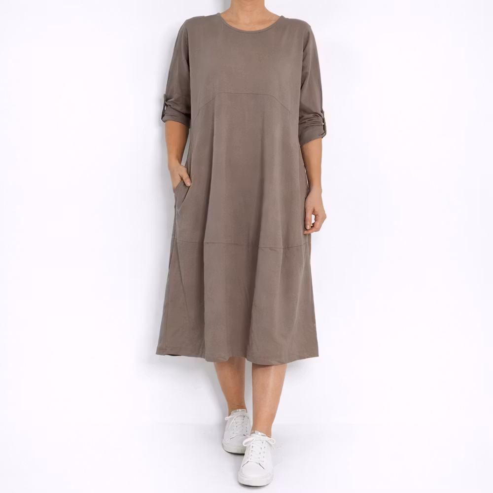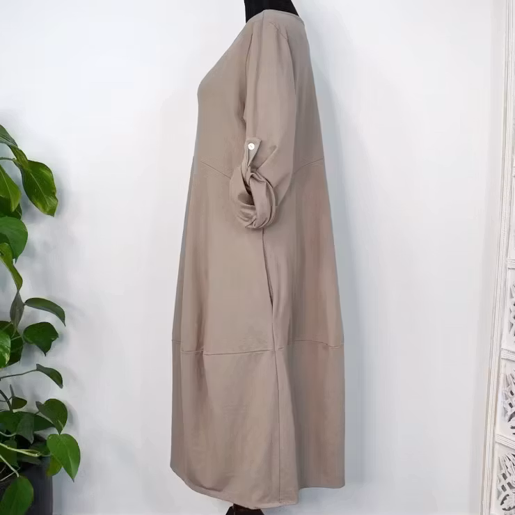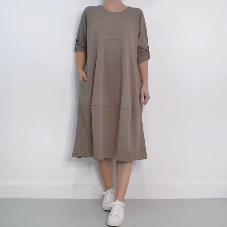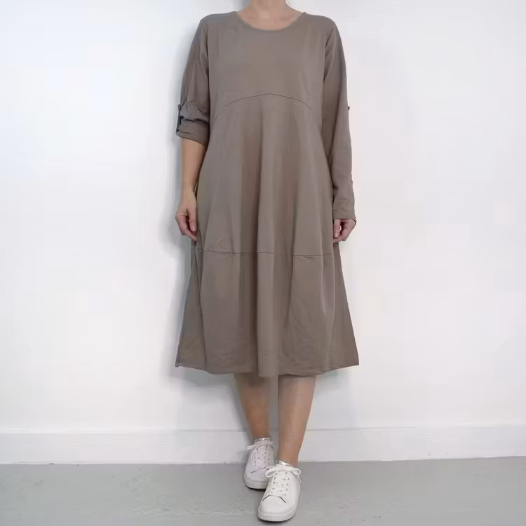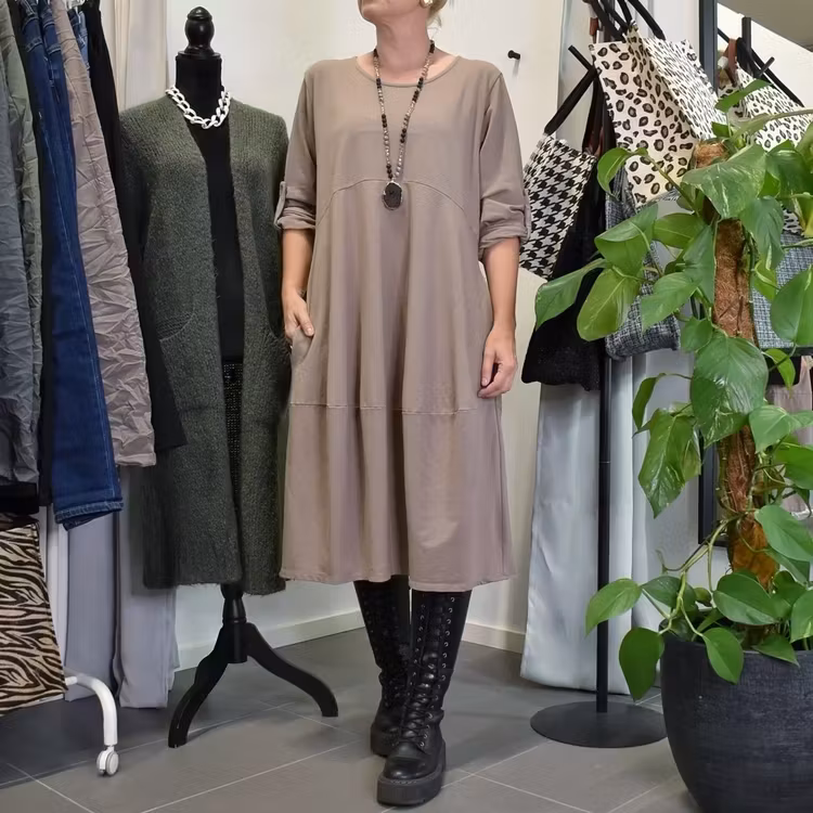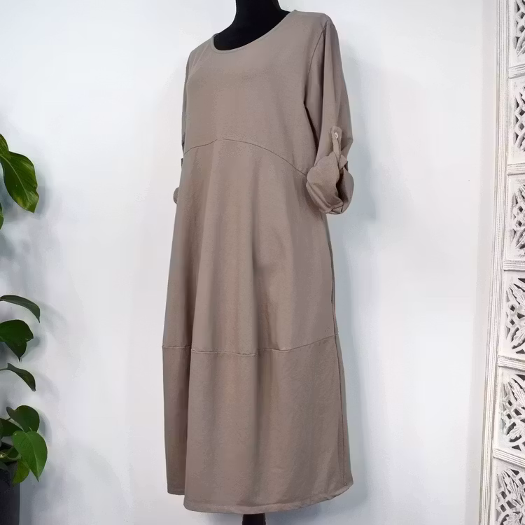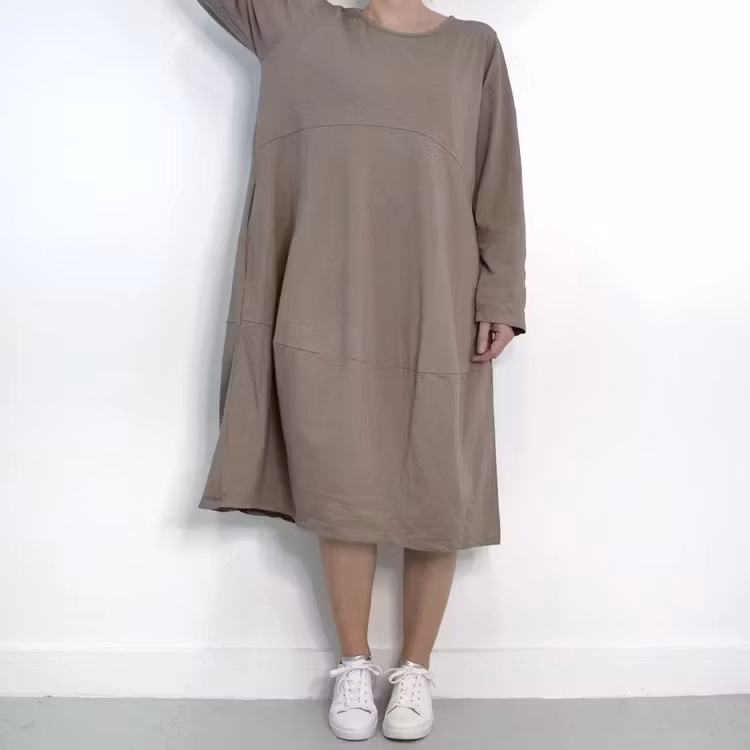 Det här är en fin och skön medellång klänning i tunt, mjukt sweatshirt-tyg. Halsen är enkelt rundad och det finns gömda fickor i sidorna. Det är en härlig vidd i den något ballongformade nederdelen och passformen är rymlig/avslappnad. Ärmen är lång men kan fästas upp. Det går en söm under bysten och på ryggen samt en nertill på klänningen. Materialet är töjbart men innehåller inte stretch. Storlekar - S/M & L/XL. Modellen har en bröstvidd på cirka 88cm, är 163cm lång och bär storlek S/M.