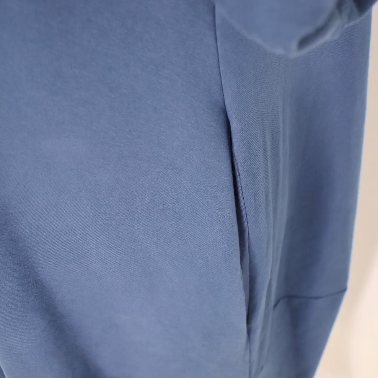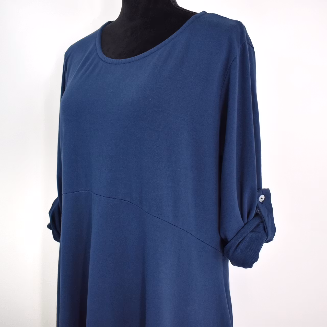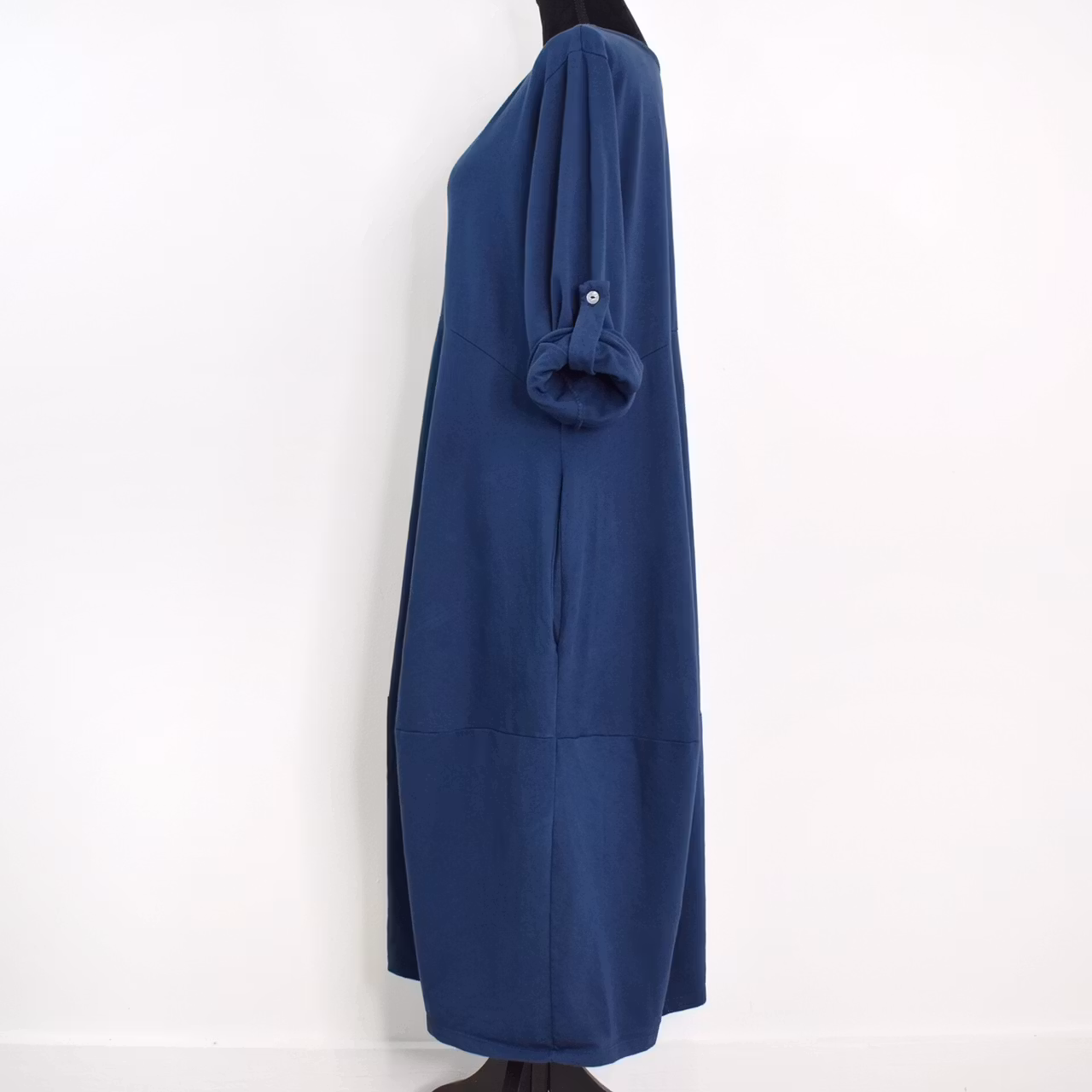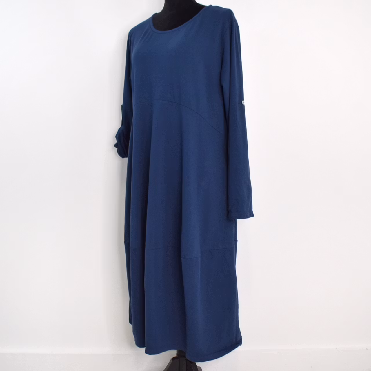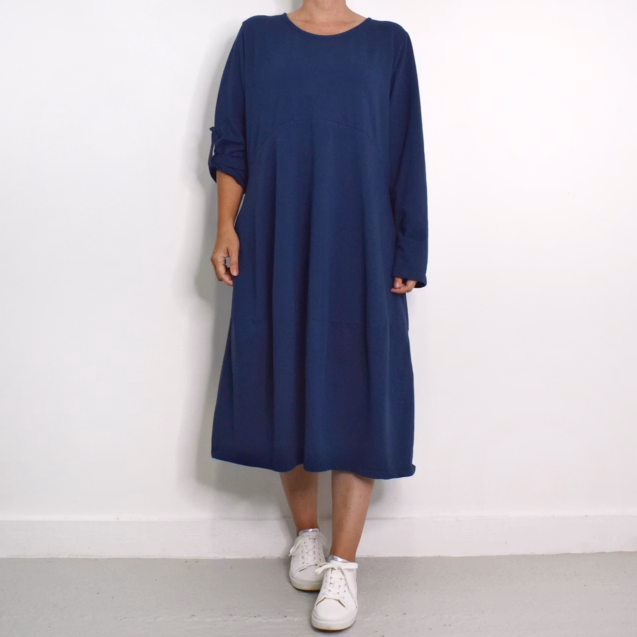 Det här är en fin och skön medellång klänning i tunt, mjukt sweatshirt-tyg. Halsen är enkelt rundad och det finns gömda fickor i sidorna. Det är en härlig vidd i den något ballongformade nederdelen och passformen är avslappnad. Ärmen är lång men kan fästas upp. Det går en söm under bysten och på ryggen samt en nertill på klänningen. Materialet är töjbart men innehåller inte stretch. Storlekar - S/M & L/XL. Modellen har en bröstvidd på cirka 88cm, är 163cm lång och bär storlek S/M.