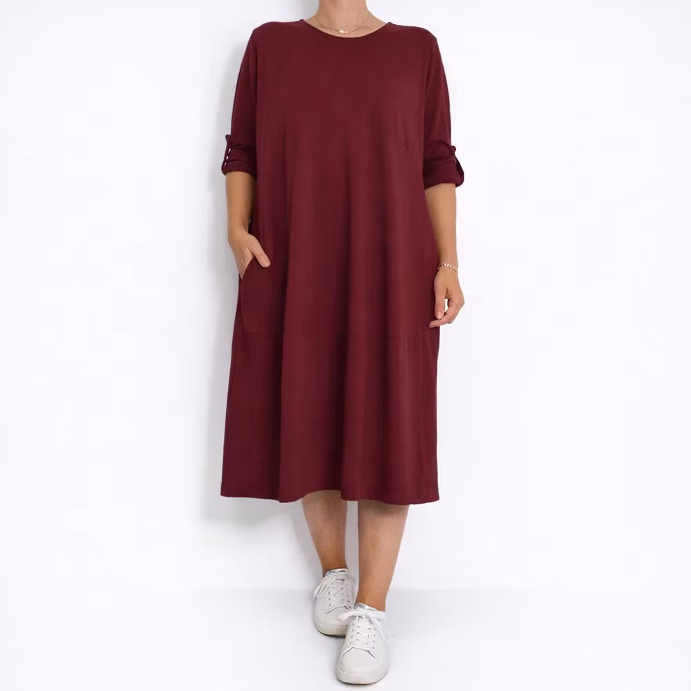 Det här är en fin och skön medellång klänning i tunt, mjukt sweatshirt-tyg. Halsen är enkelt rundad och det finns gömda fickor i sidorna. Det är en härlig vidd i den något ballongformade nederdelen och passformen är rymlig/avslappnad. Ärmen är lång men kan fästas upp. Det går en söm under bysten och på ryggen samt en nertill på klänningen. Färgen är svår att fånga på bild men det är en mörk vinröd kulör som drar lite åt plommonlila. Materialet är töjbart men innehåller inte stretch. Storlekar - S/M & L/XL. Modellen har en bröstvidd på cirka 88cm, är 163cm lång och bär storlek S/M.