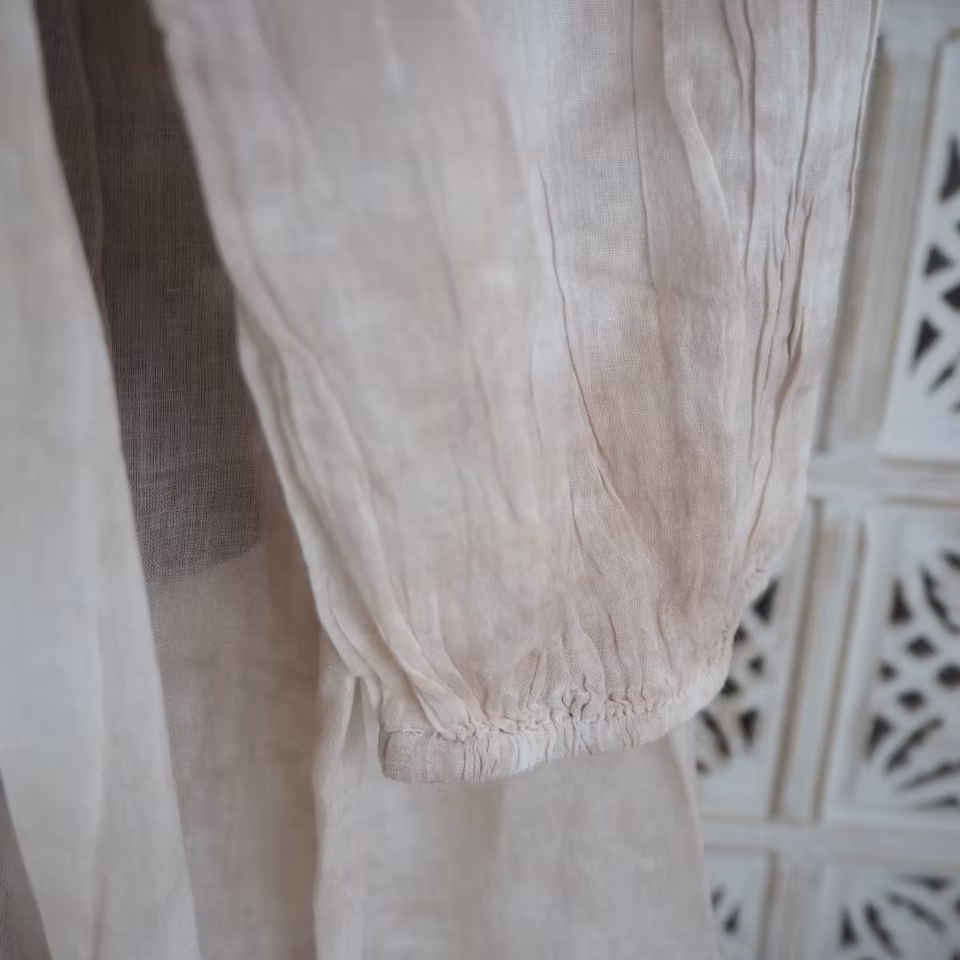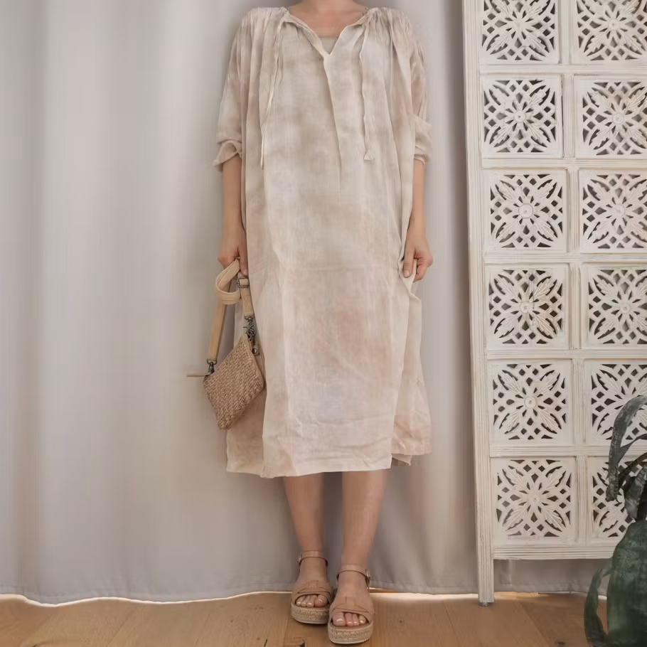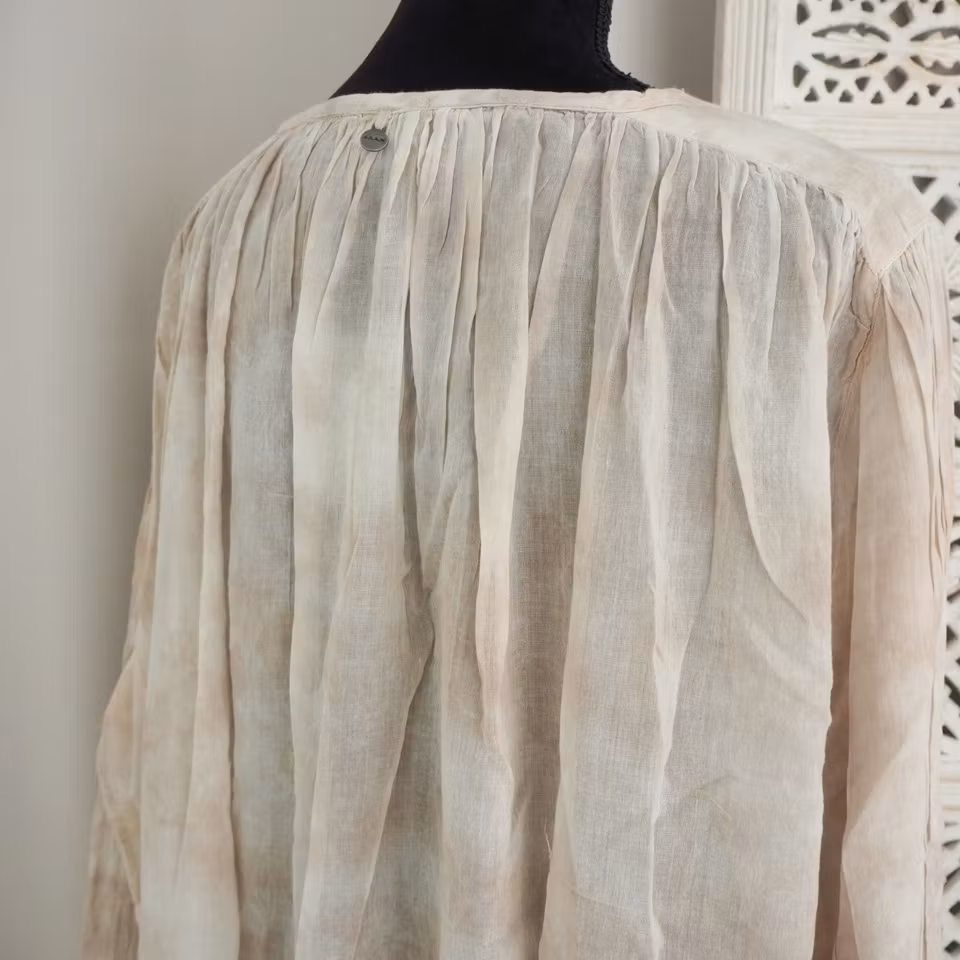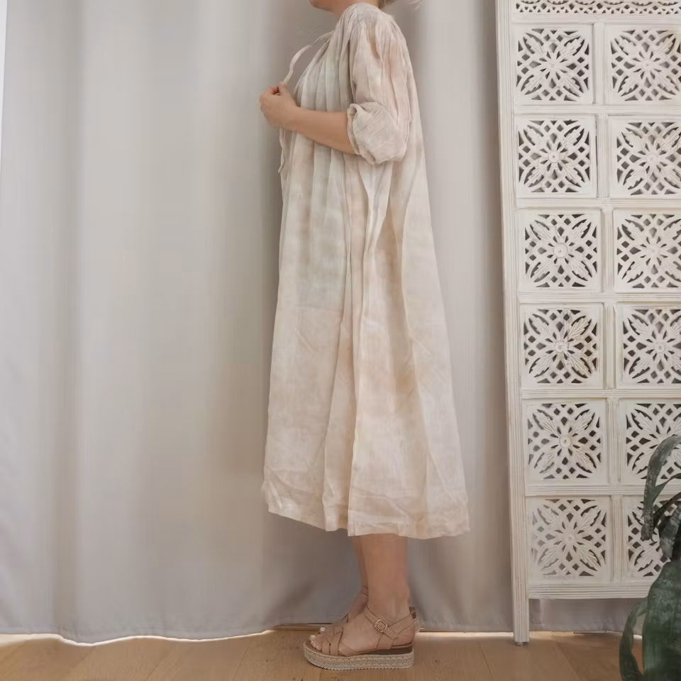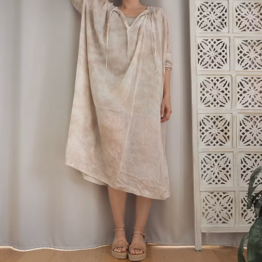 Detta är en helt underbar klänning i vackert batikmönster. Det är en rymlig modell i otroligt härligt material! Framtill finns knytband och i nacken finns ett AJLAJK-coin som fin detalj. I ärmslutet finns en skön resår så att man kan dra upp ärmen om man vill. Detta är en perfekt strand/poolklänning! Tänk på att tyget är tunt och genomskinligt. Två storlekar - S/M & L/XL. Modellen är stl S, har en bröstvidd på 88cm, är 163cm lång och bär storlek S/M. Se ungefärliga mått i beskrivningen. Storlekar: S/M-L/XL