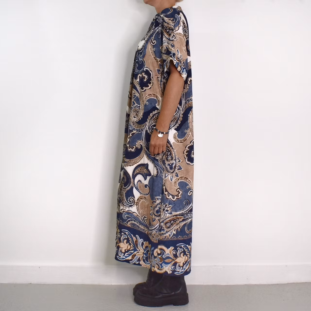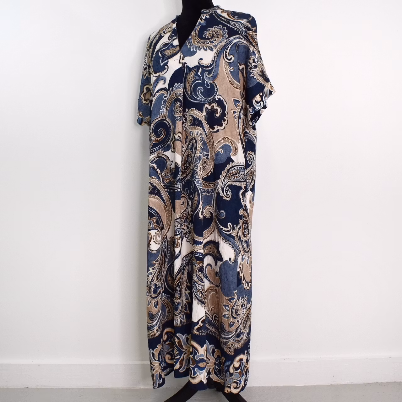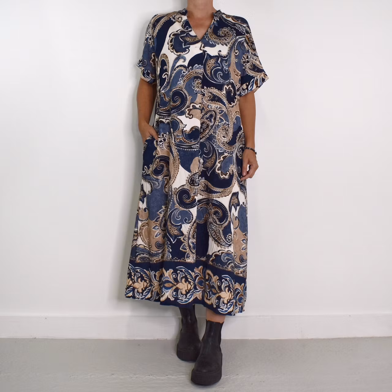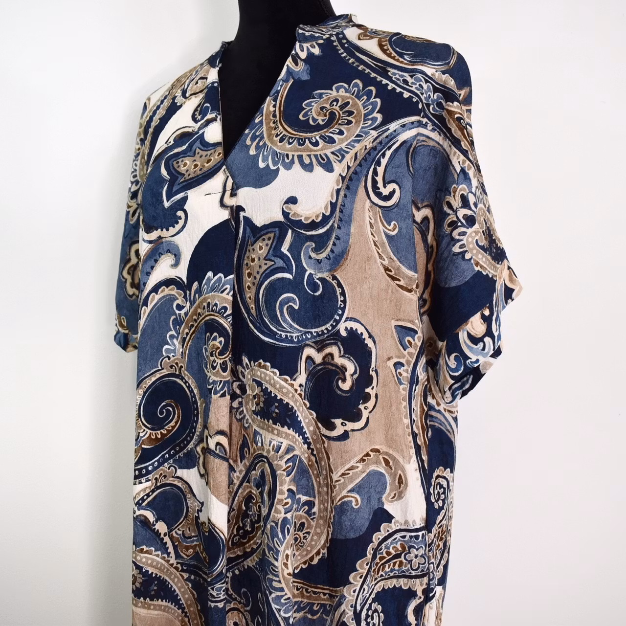 Det här är en snygg mönstrad klänning med liten ståkrage och dekorativt sprund under v-ringningen. Ärmen är kort och sidorna finns gömda fickor. Observera att materialet inte innehåller stretch och att tyget är tunt. Då vi alla är olika formade rekommenderar vi att man tar hjälp av måtten nedan för att bedöma om plagget kan passa. Modellen har en bröstvidd på cirka 88cm, är 163cm lång, och bär storlek S/M.