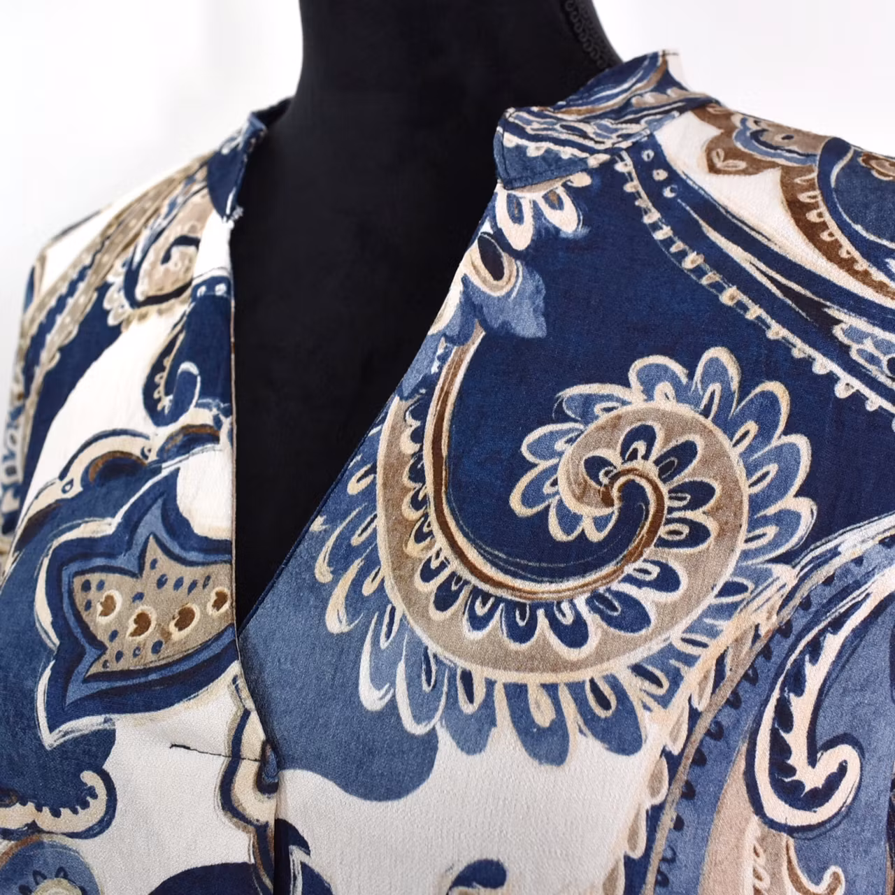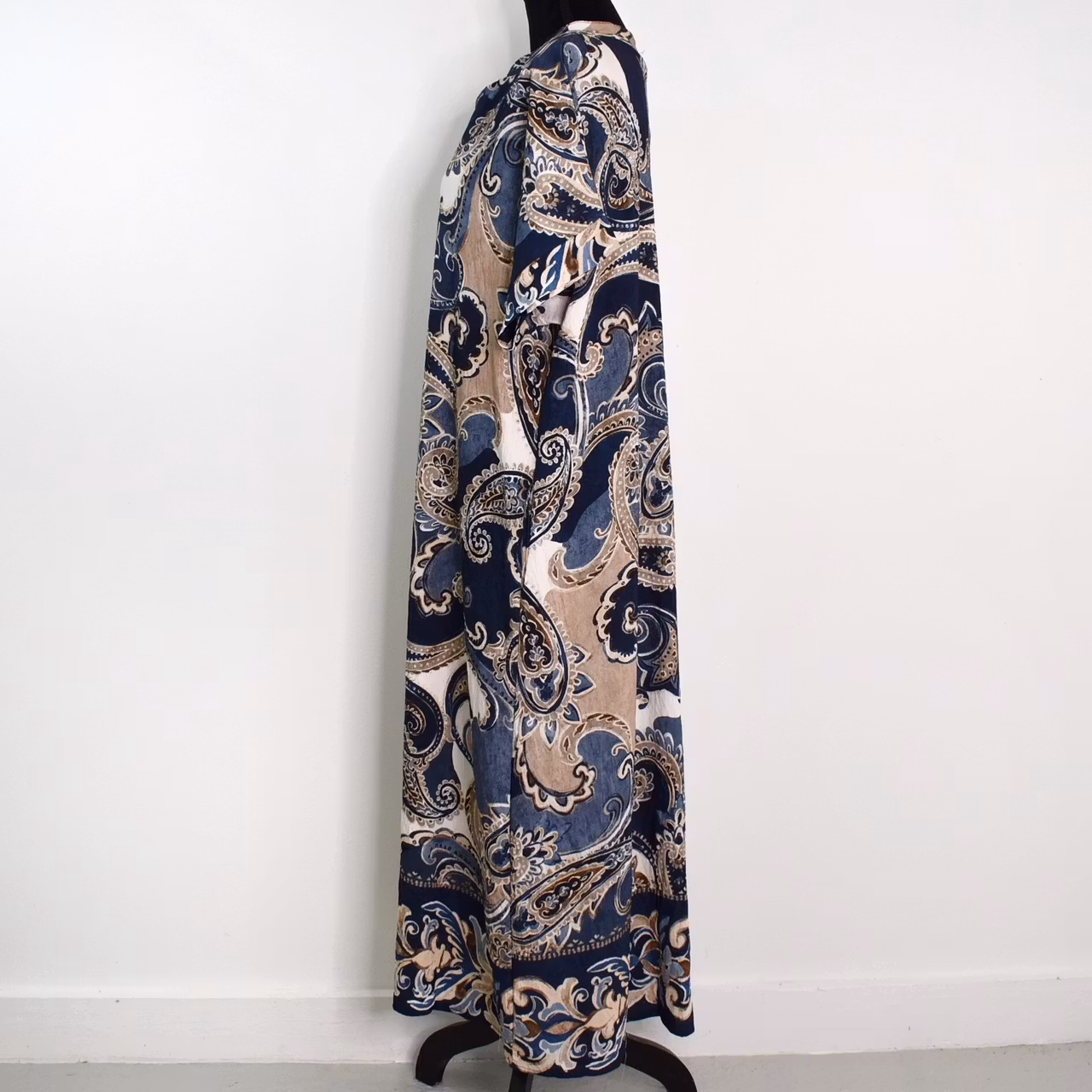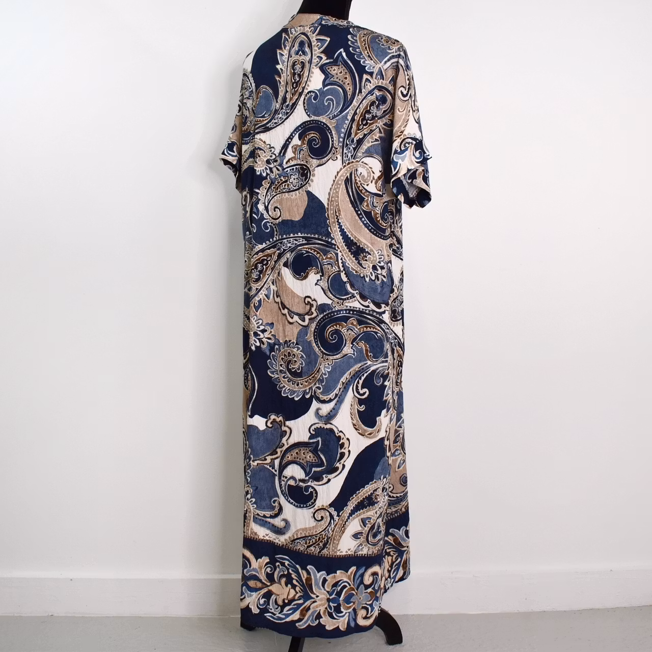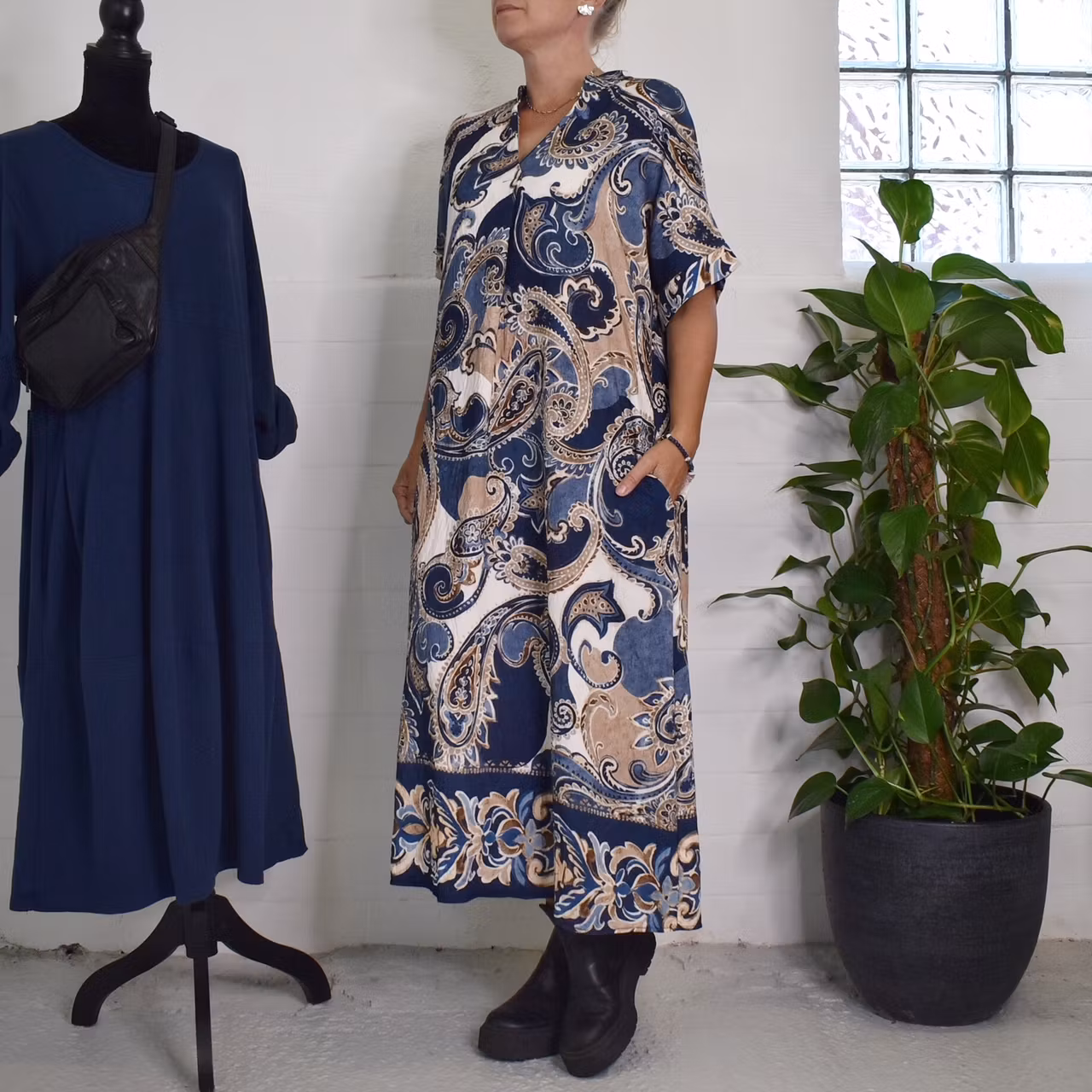 Det här är en snygg mönstrad klänning med liten ståkrage och dekorativt sprund under v-ringningen. Ärmen är kort och sidorna finns gömda fickor. Observera att materialet inte innehåller stretch och att tyget är tunt. Då vi alla är olika formade rekommenderar vi att man tar hjälp av måtten nedan för att bedöma om plagget kan passa. Modellen har en bröstvidd på cirka 88cm, är 163cm lång, och bär storlek S/M.