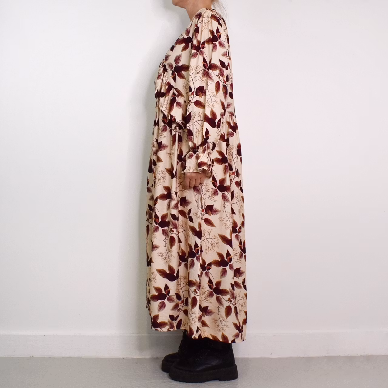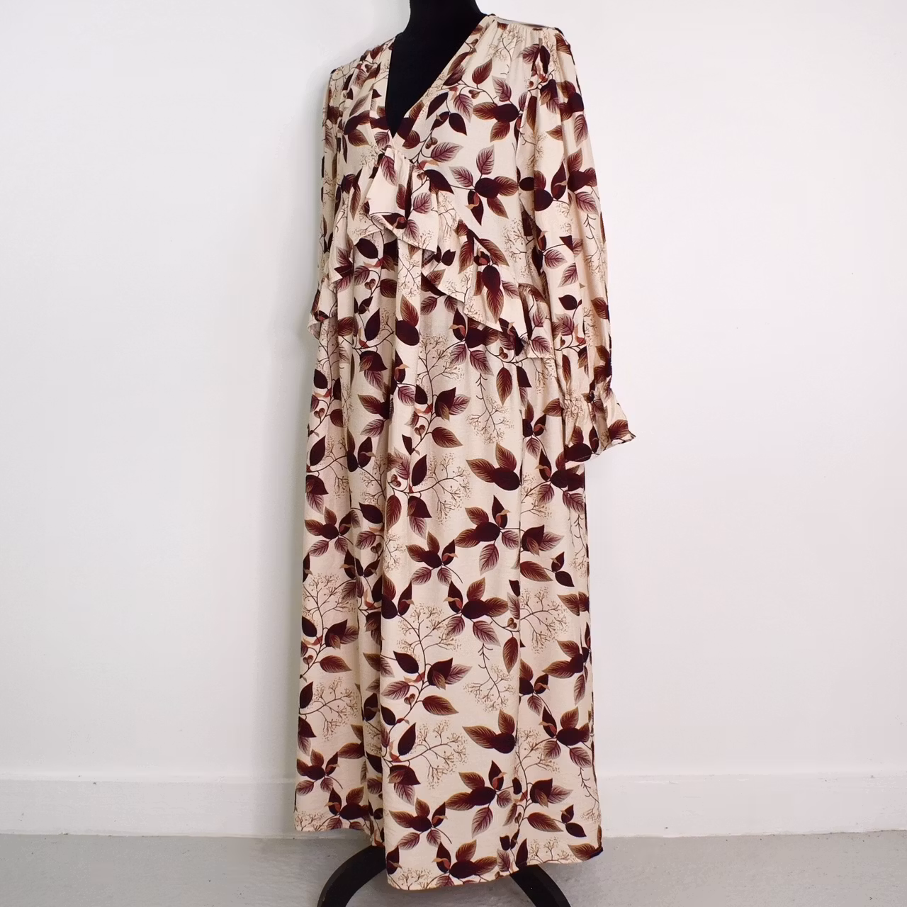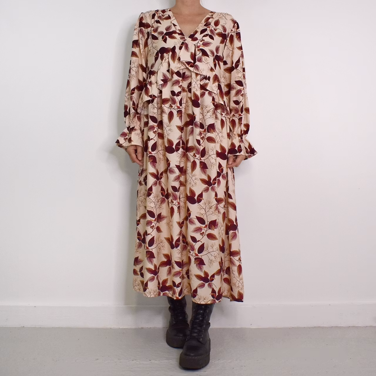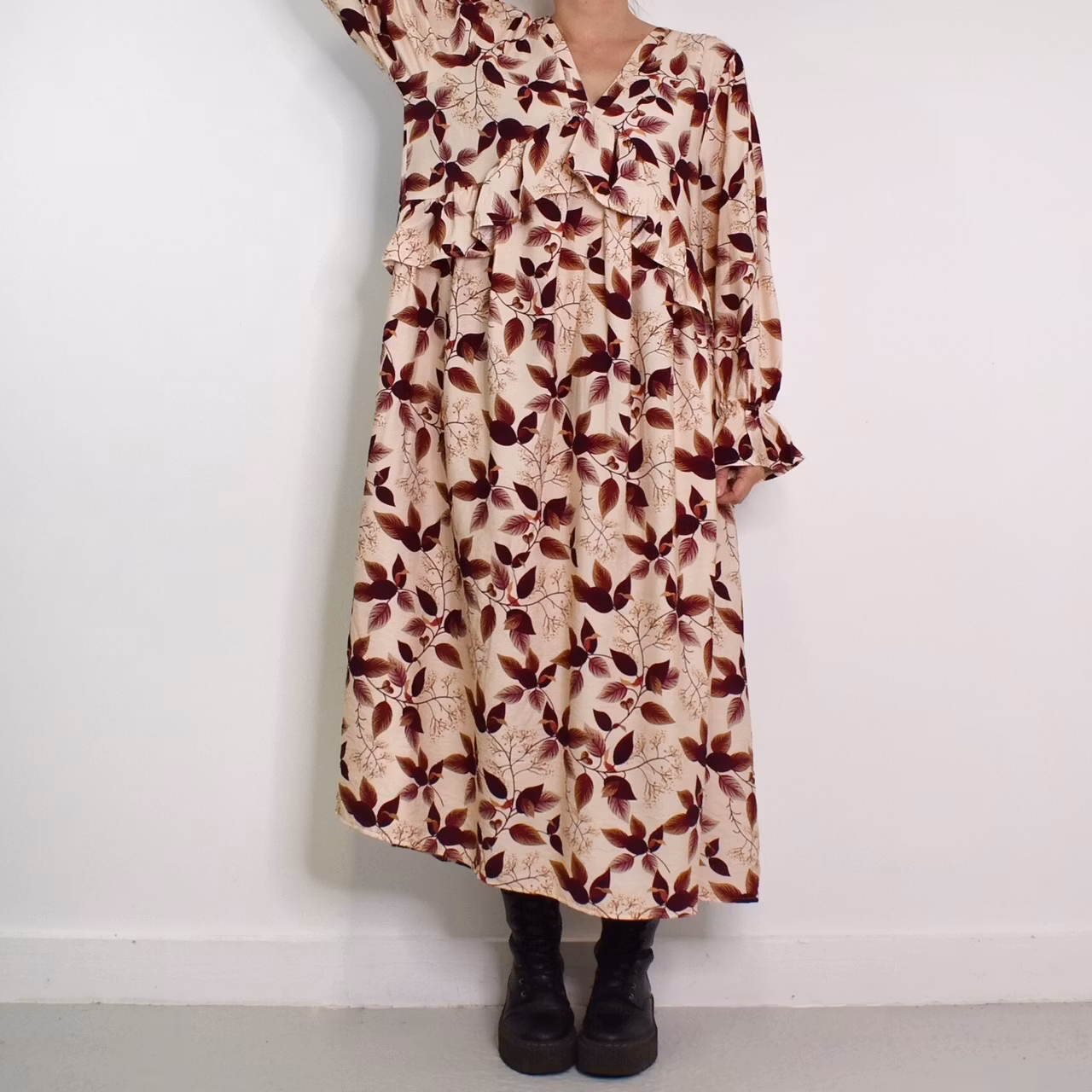 Det här är en underbar klänning med vackert mönster och härligt material. Klänningen har en djup v-ringning och nedanför den finns en bred volang som går ner mot sidorna. I ärmslutet finns en stretchig volang. Tyget är läckert rynkat vid axlarna samt på ryggen från den horistontella sömmen. Tyget innehåller inte strech. Modellen har en bröstvidd på cirka 88cm, är 163cm lång och bär S/M.