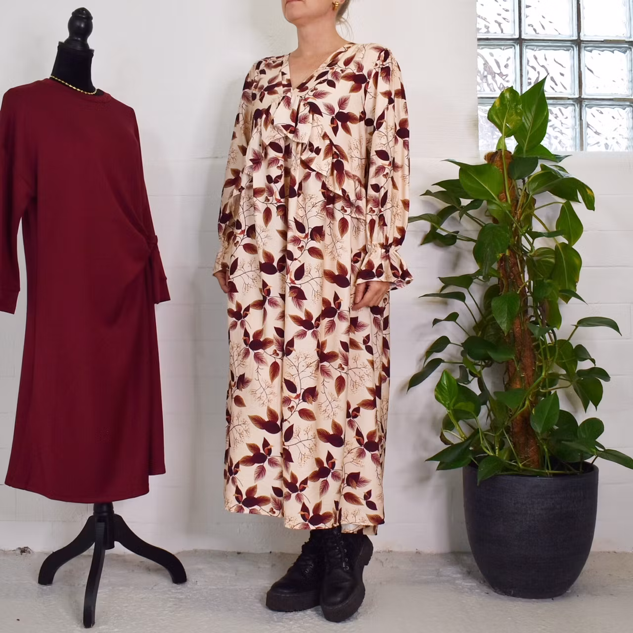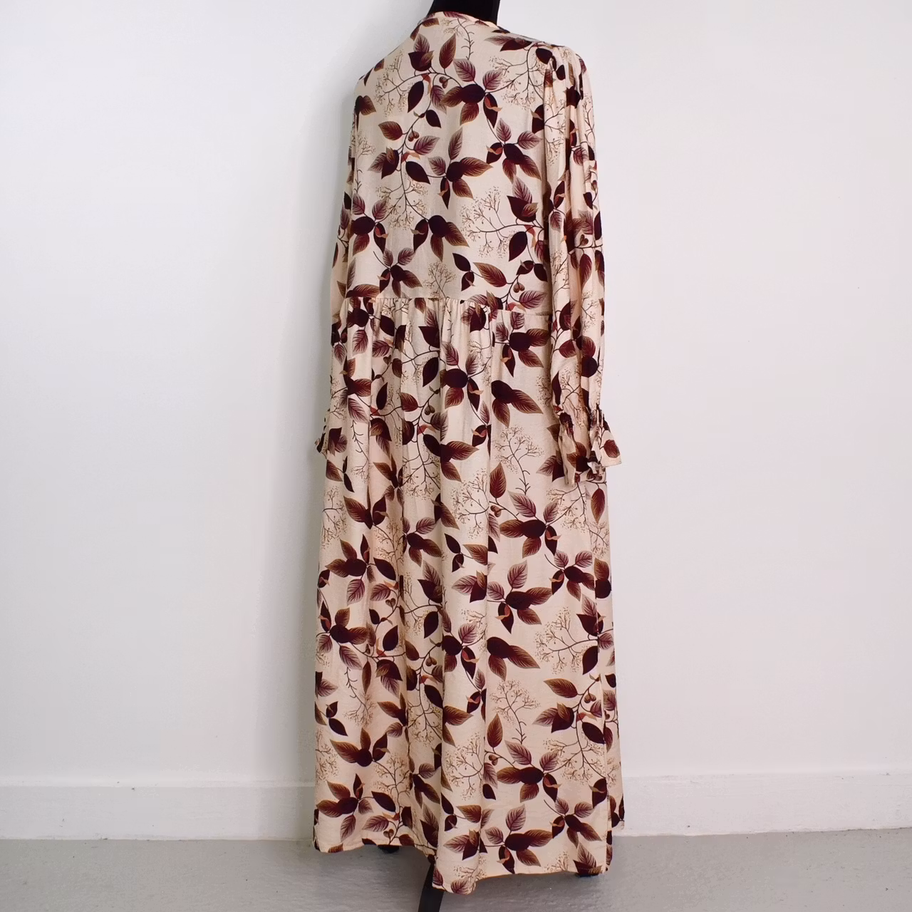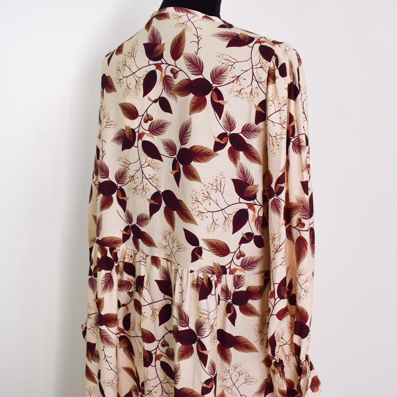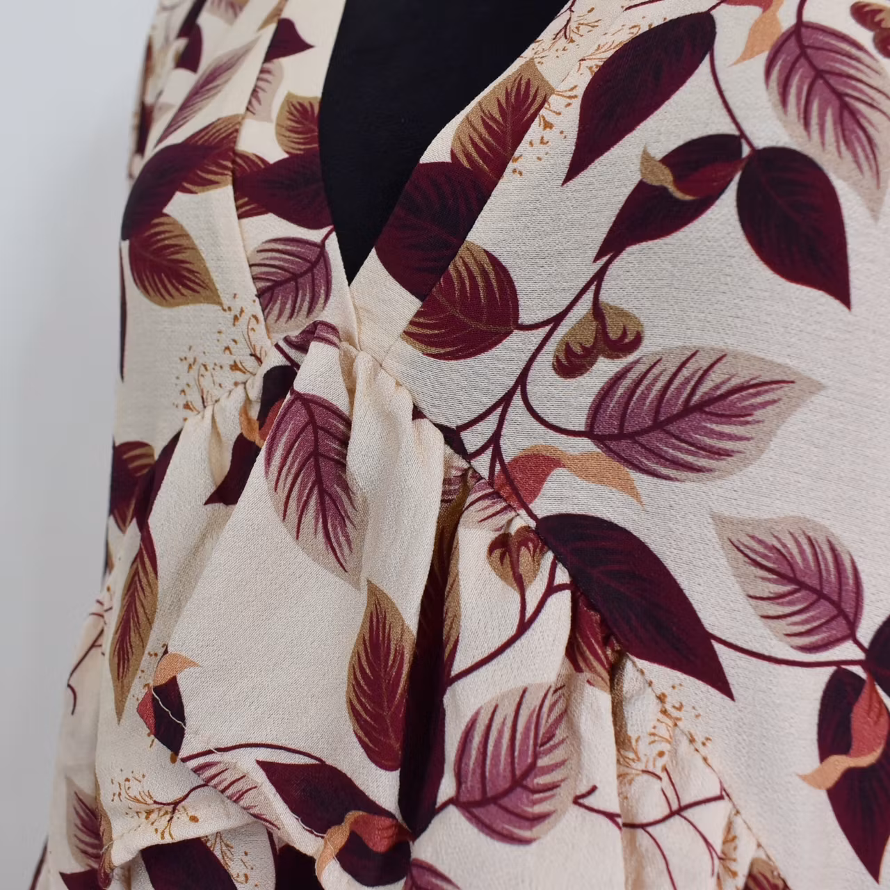 Det här är en underbar klänning med vackert mönster och härligt material. Klänningen har en djup v-ringning och nedanför den finns en bred volang som går ner mot sidorna. I ärmslutet finns en stretchig volang. Tyget är läckert rynkat vid axlarna samt på ryggen från den horistontella sömmen. Tyget innehåller inte strech. Modellen har en bröstvidd på cirka 88cm, är 163cm lång och bär S/M.