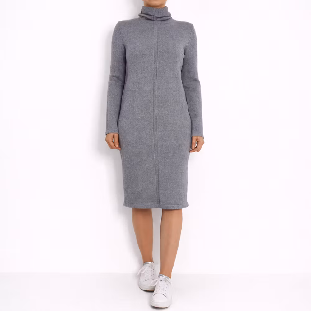 Det här är en underbar finstickad klänning med snygg hög krage som kan formas eller vikas som man önskar. Framtill går en lodrät rand. Materialet är supermjukt och följsamt. Passformen är rak och något snäv. Modellen har en bröstvidd på cirka 88cm, en midjevidd på cirka 78cm och är 163cm lång.