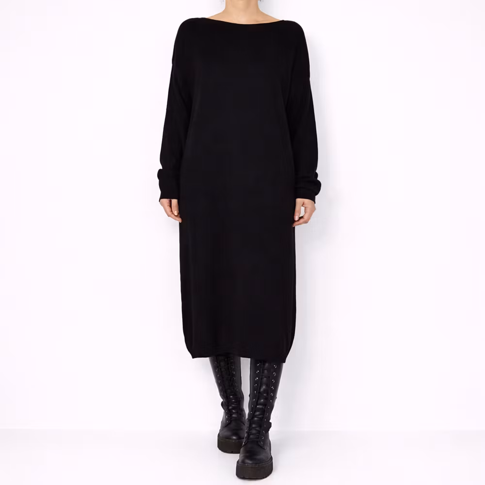 Det här är en underbar finstickad klänning med elegant halsringning. Axeln är rejält nerhasad. Materialet är mjukt och följsamt. One Size - passar uppskattningsvis upp till 40/42. Då vi alla är olika formade rekommenderar vi att man tar hjälp av måtten nedan för att bedöma om plagget kan passa. Modellen har en bröstvidd på cirka 88cm och är 163cm lång.