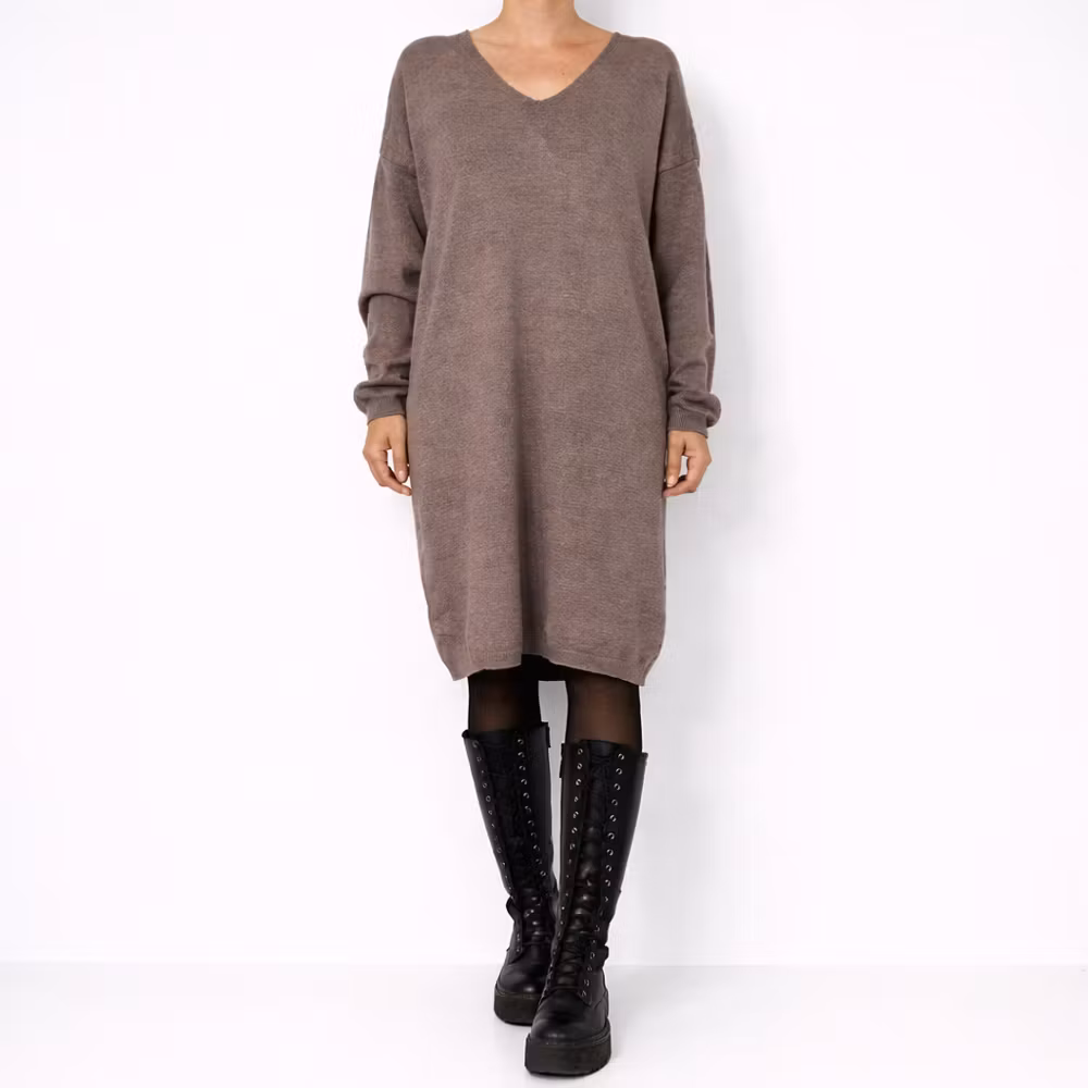 Finstickad klänning V-ringad TAUPE