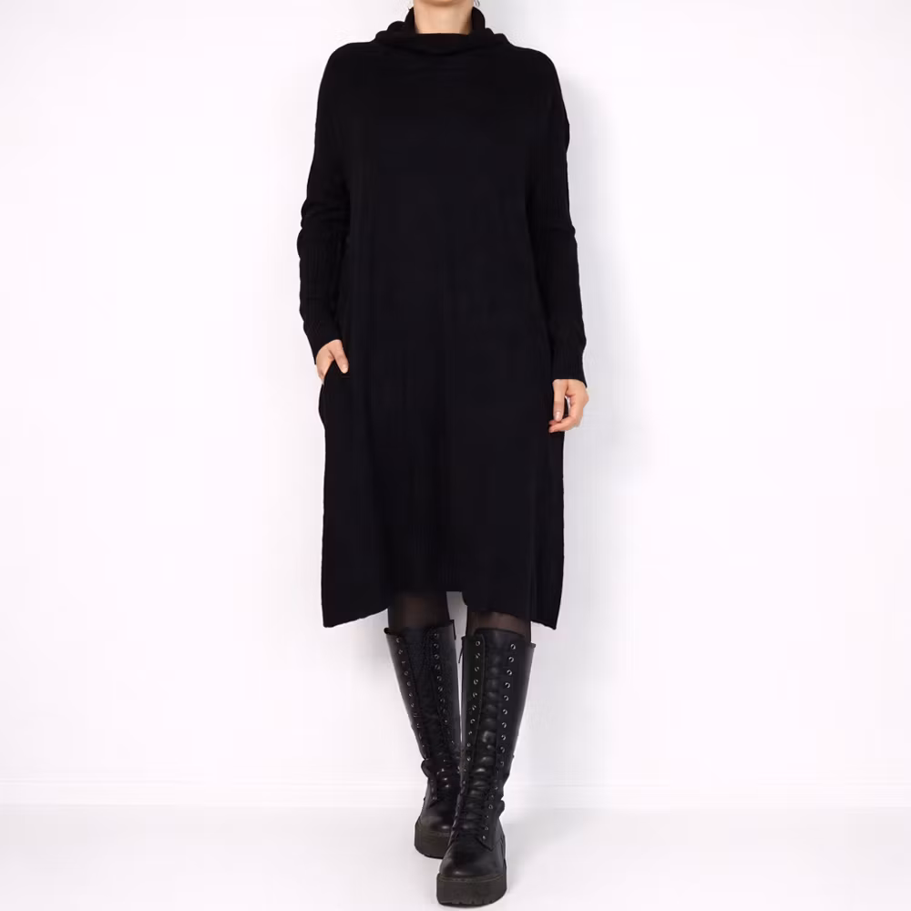 Det här är en underbar finstickad klänning med snygg lös ståkrage. Axeln är nerhasad och i sidorna är där gömda fickor (tänk på att fickorna bygger på omfånget något). I ärmslutet och nertill är det ribbstickat. Garnet är något luddigt och ner över ryggen går en dekorativ söm. Klänningen är vidare nertill. Materialet är mjukt och stretchigt. Vi upplever inte denna som sticksig men det beror på hur känslig man är. One Size - passar uppskattningsvis upp till L/XL. Då vi alla är olika formade rekommenderar vi att man tar hjälp av måtten nedan för att bedöma om plagget kan passa. Modellen har en bröstvidd på cirka 88cm och är 163cm lång.