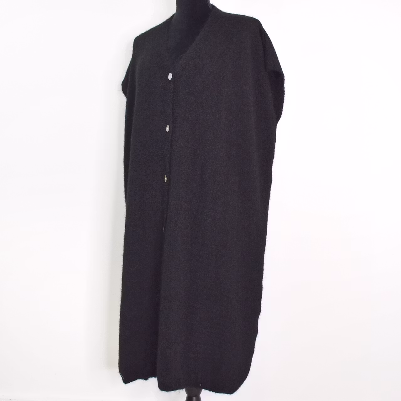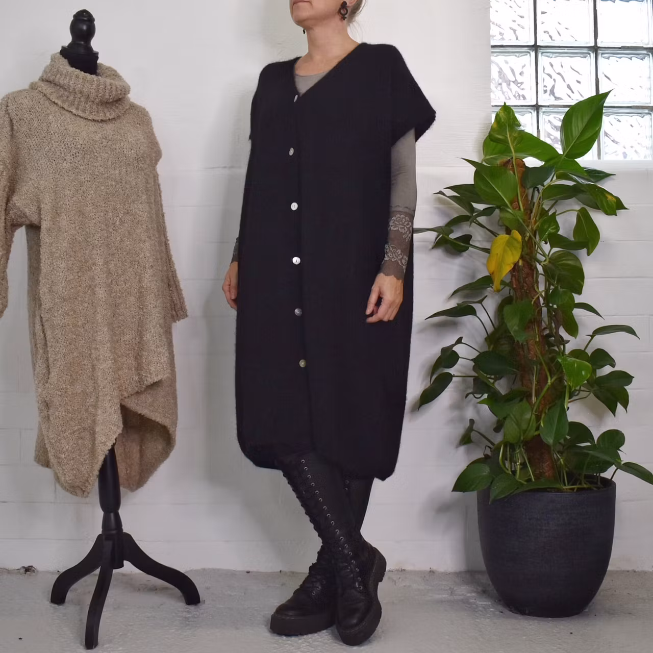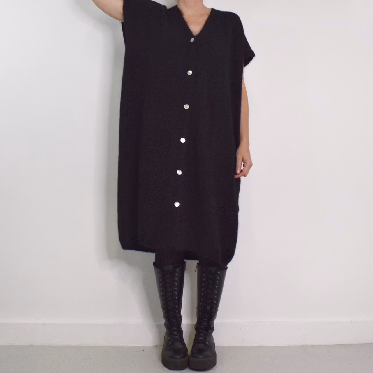 Det här är en fin och härlig stickad klänning/långväst med v-ringning och stora knappar hela vägen fram. Ärmen är kort. Materialet är något stretchigt. Rymlig One Size - passar uppskattningsvis upp till storlek 42 (XL). Modellen har en bröstvidd på cirka 88cm och är 163cm lång.