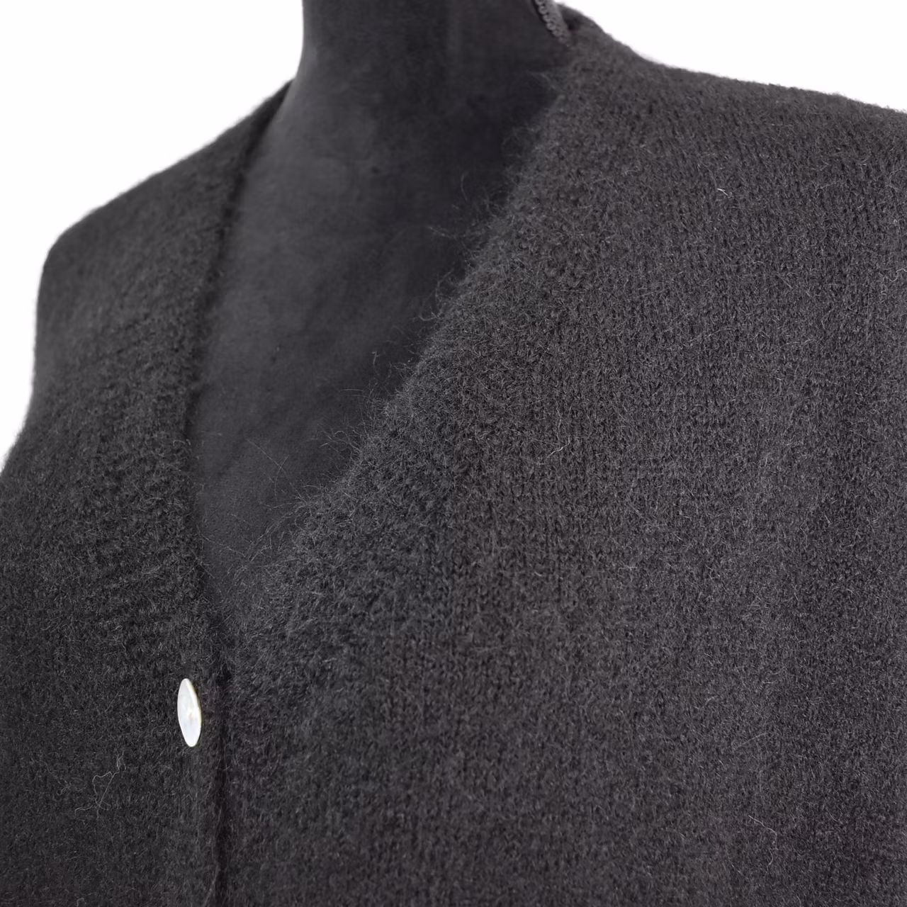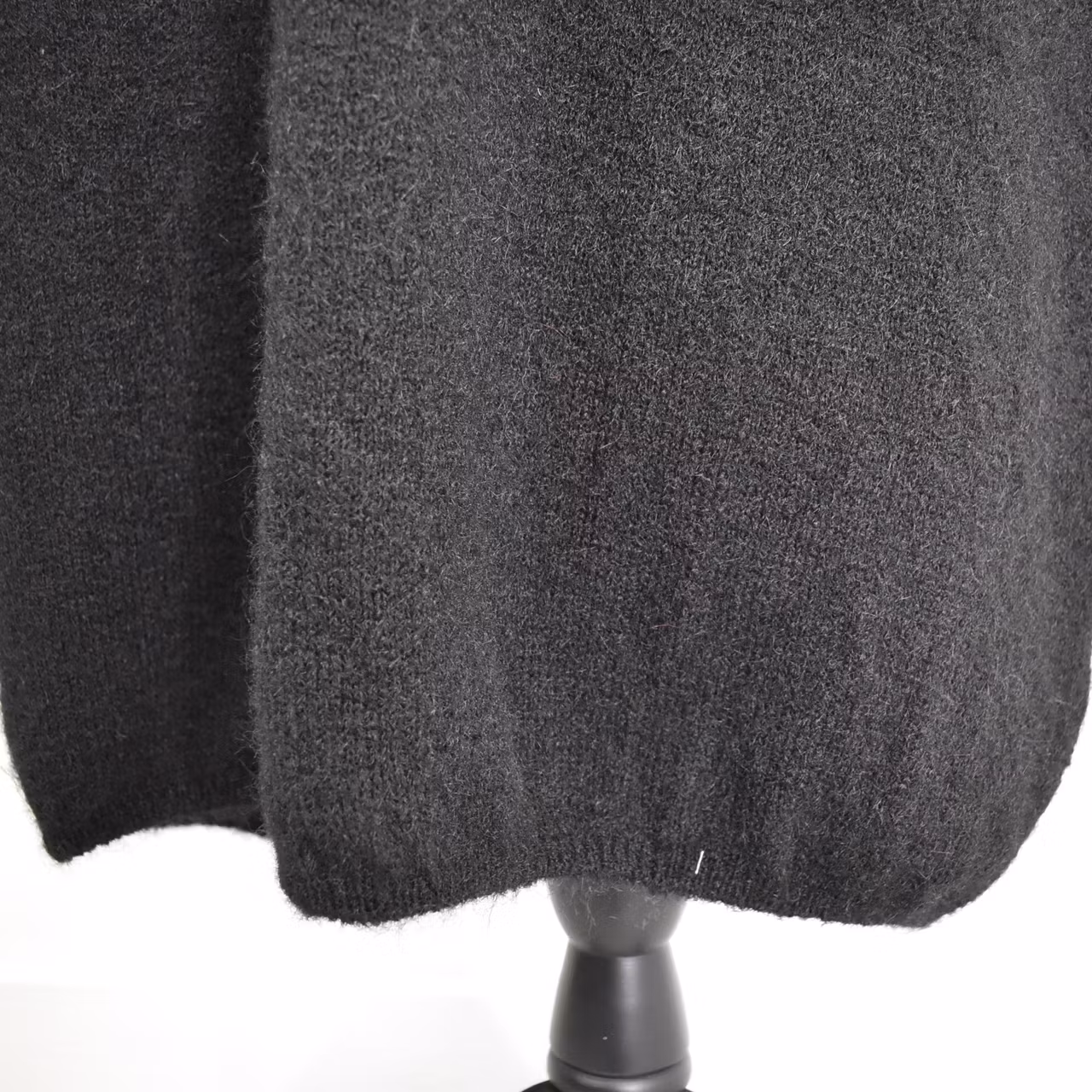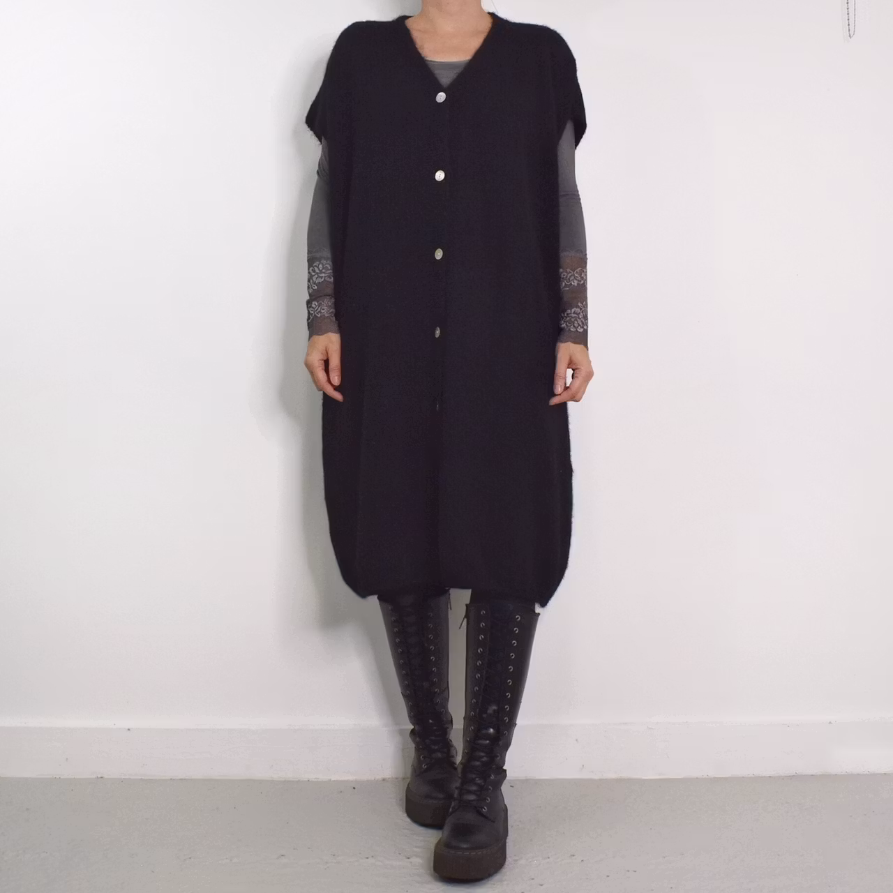 Det här är en fin och härlig stickad klänning/långväst med v-ringning och stora knappar hela vägen fram. Ärmen är kort. Materialet är något stretchigt. Rymlig One Size - passar uppskattningsvis upp till storlek 42 (XL). Modellen har en bröstvidd på cirka 88cm och är 163cm lång.