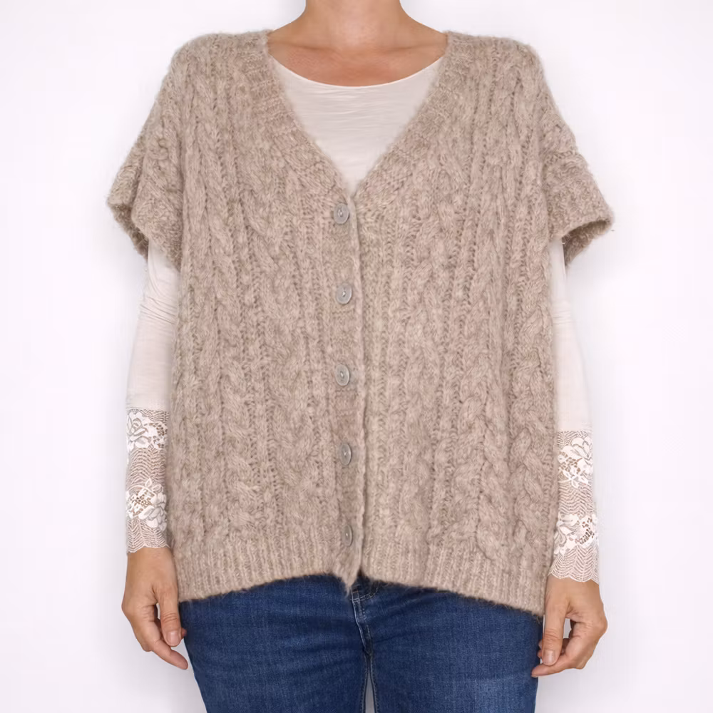 Det här är en stilig och skön kort kofta med kabelstickning fram. Koftan har kort ärm, en djup v-ringning och stora pärlemorskimrande knappar fram. Passformen är avslappnad. Garnet är mjukt och vi upplever inte det som sticksigt (det kan dock variera beroende på hur känslig man är). Rymlig One Size - passar uppskattningsvis upp till storlek 42 (XL). Då vi alla är olika formade rekommenderar vi att man tar hjälp av måtten nedan för att bedöma om plagget kan passa. Modellen har en bröstvidd på cirka 88cm och är 163cm lång.