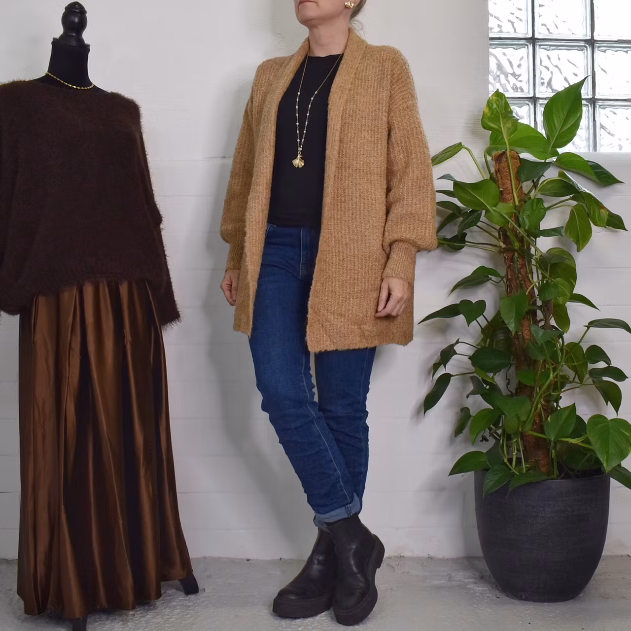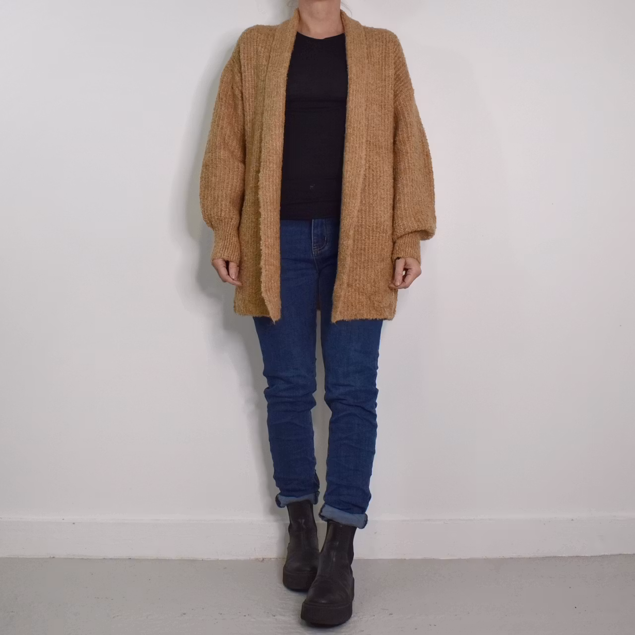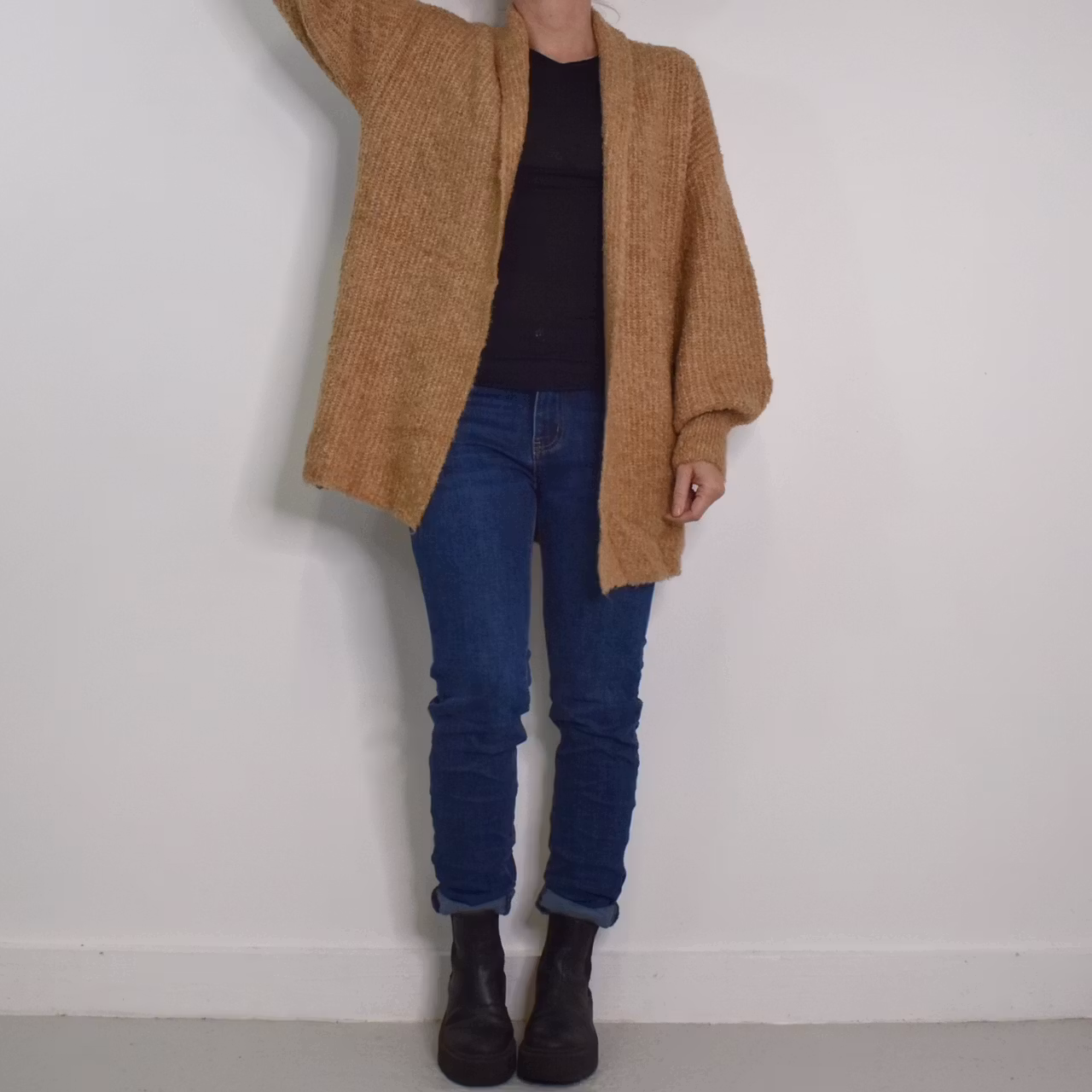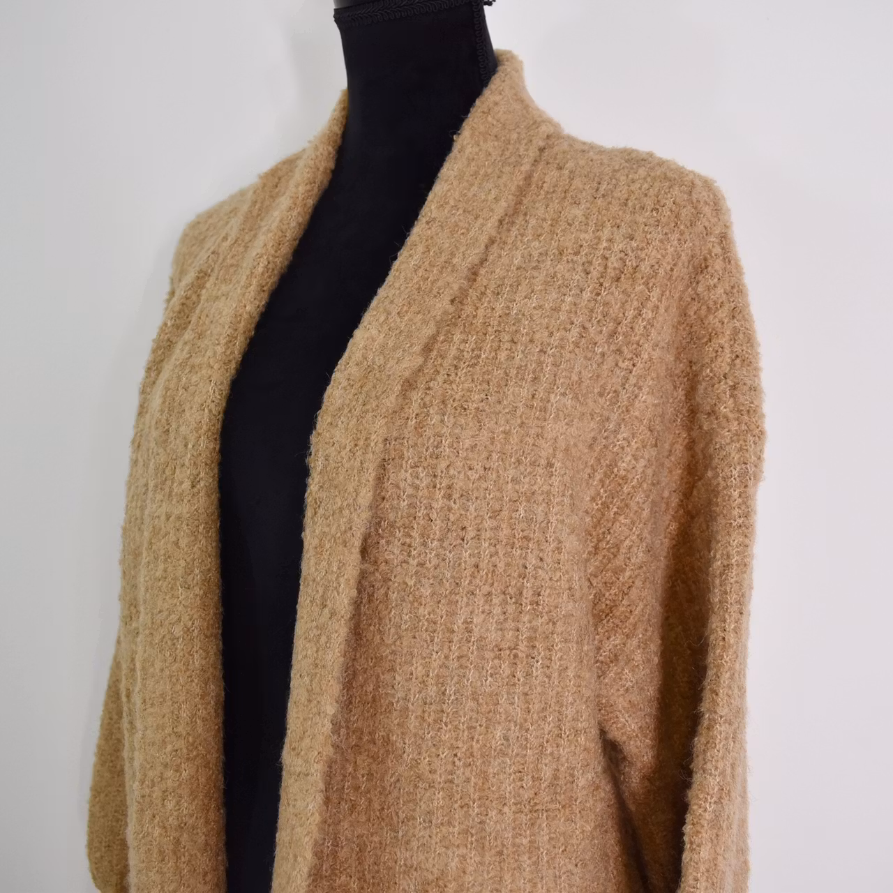 Det här är en härlig kofta stickad i läckert bouclé-garn. Axeln är nerhasad och i ärmslutet är där en stretchig mudd. Materialet innehåller 28% återvunnet material. Det kan vara en liten skillnad i längden där koftan är delad framtill. One Size - passar uppskattningsvis upp till L-L/XL (40-40/42). Då vi alla är olika formade rekommenderar vi att man tar hjälp av måtten nedan för att bedöma om plagget kan passa. Modellen har en bröstvidd på cirka 88cm och är 163cm lång.