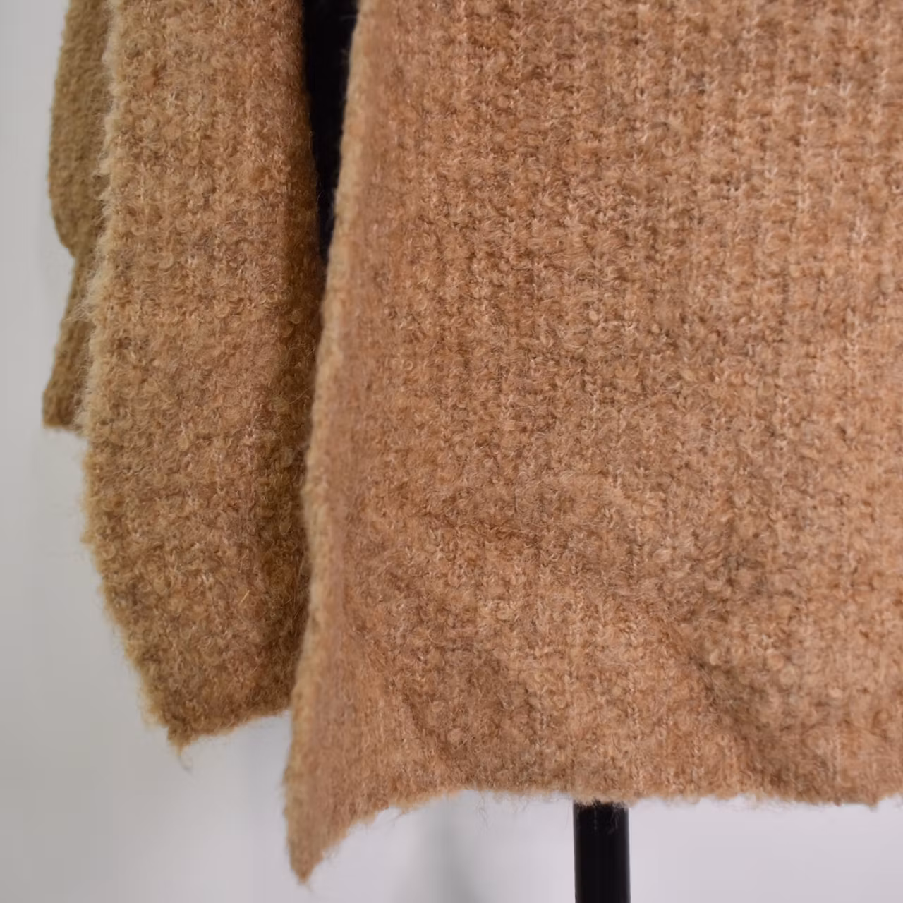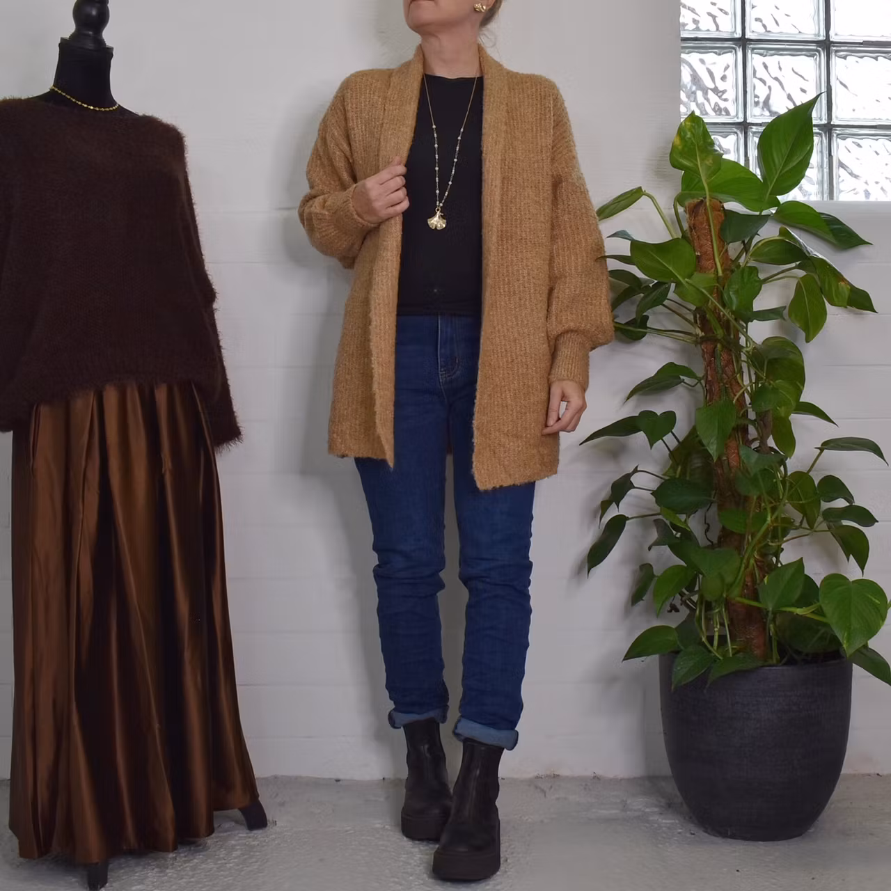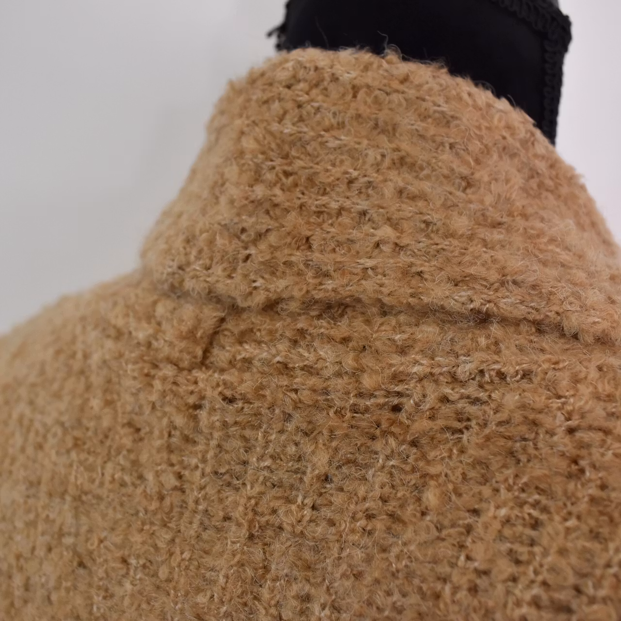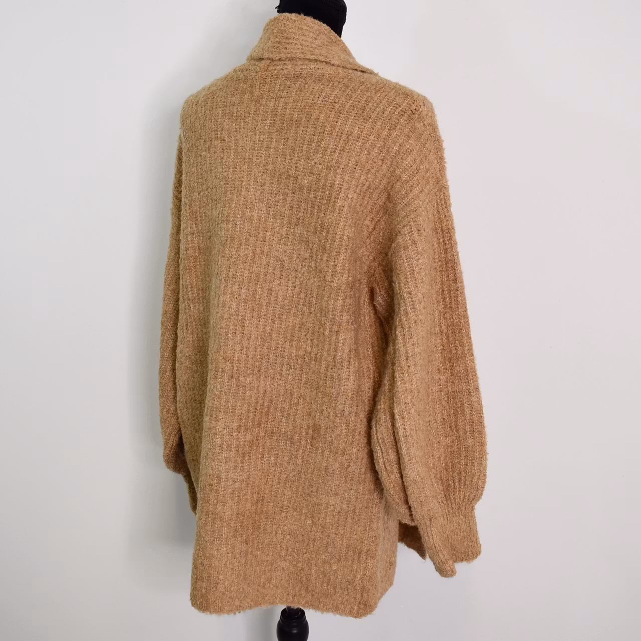 Det här är en härlig kofta stickad i läckert bouclé-garn. Axeln är nerhasad och i ärmslutet är där en stretchig mudd. Materialet innehåller 28% återvunnet material. Det kan vara en liten skillnad i längden där koftan är delad framtill. One Size - passar uppskattningsvis upp till L-L/XL (40-40/42). Då vi alla är olika formade rekommenderar vi att man tar hjälp av måtten nedan för att bedöma om plagget kan passa. Modellen har en bröstvidd på cirka 88cm och är 163cm lång.
