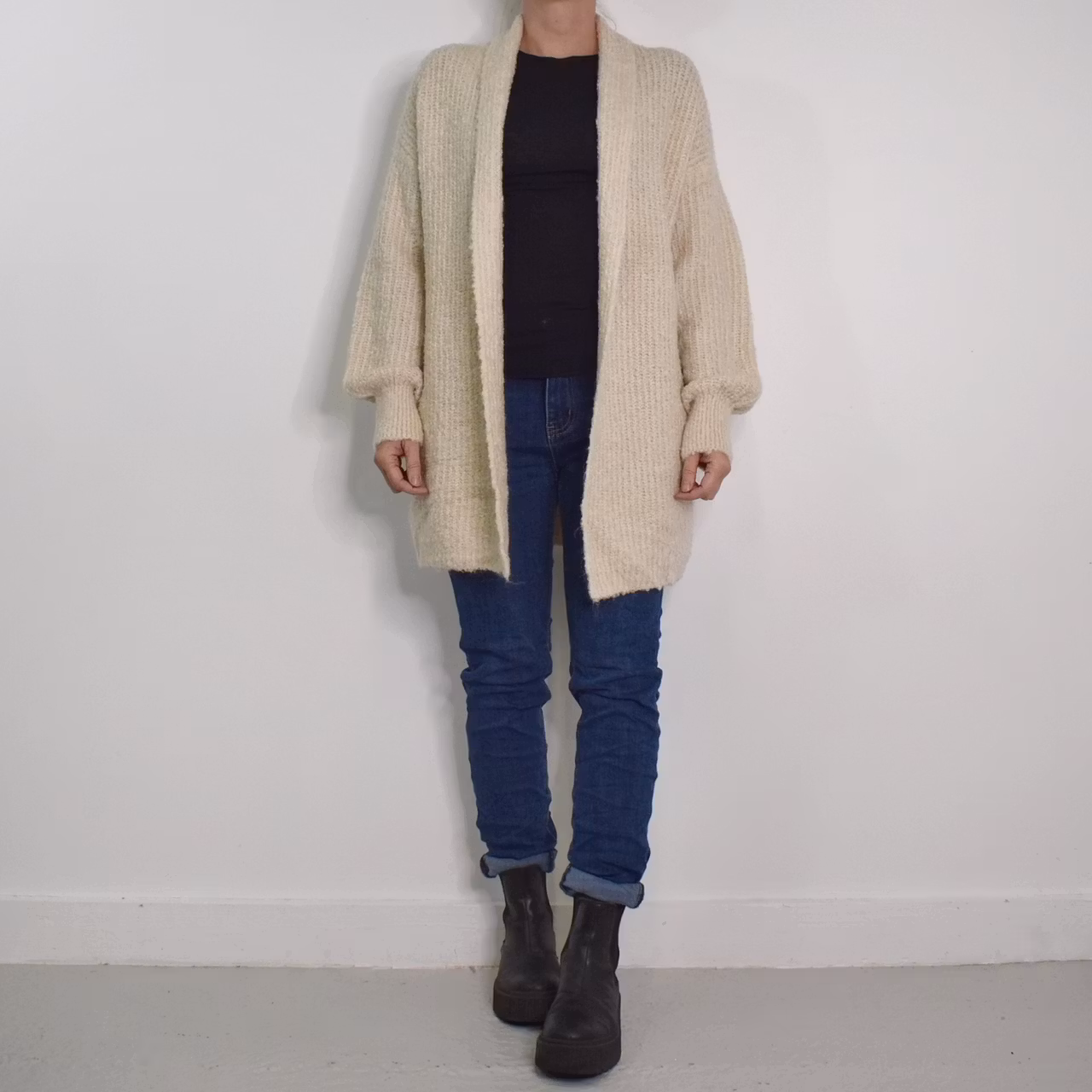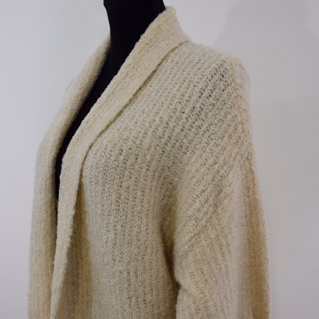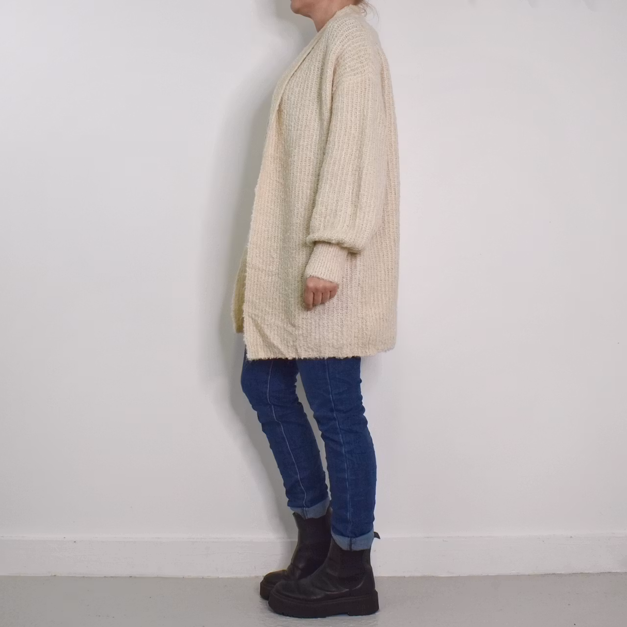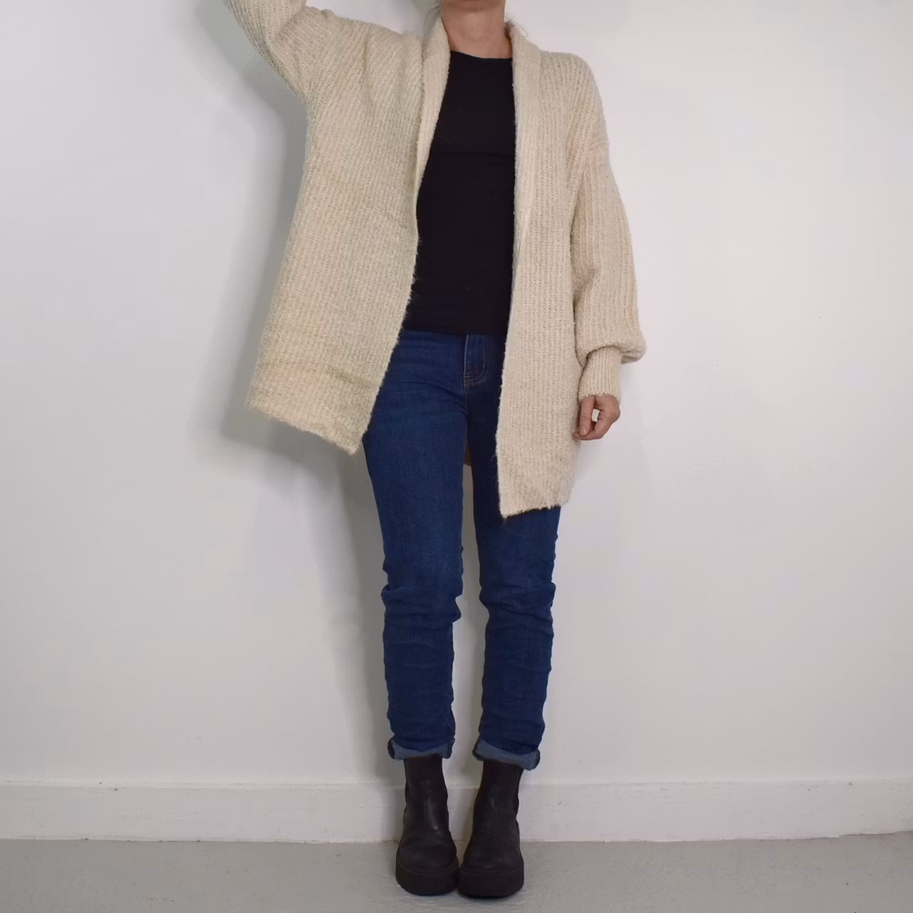 Det här är en härlig kofta stickad i läckert bouclé-garn. Axeln är nerhasad och i ärmslutet är där en stretchig mudd. Materialet innehåller 28% återvunnet material. Det kan vara en liten skillnad i längden där koftan är delad framtill. One Size - passar uppskattningsvis upp till L-L/XL (40-40/42). Då vi alla är olika formade rekommenderar vi att man tar hjälp av måtten nedan för att bedöma om plagget kan passa. Modellen har en bröstvidd på cirka 88cm och är 163cm lång.