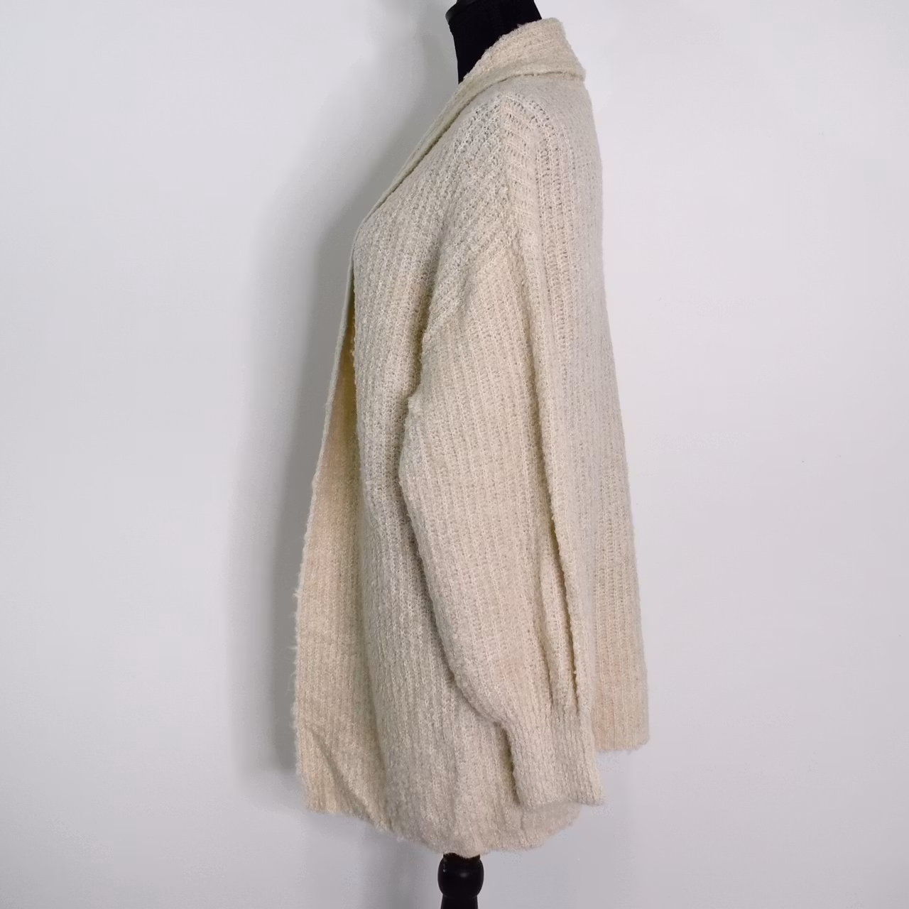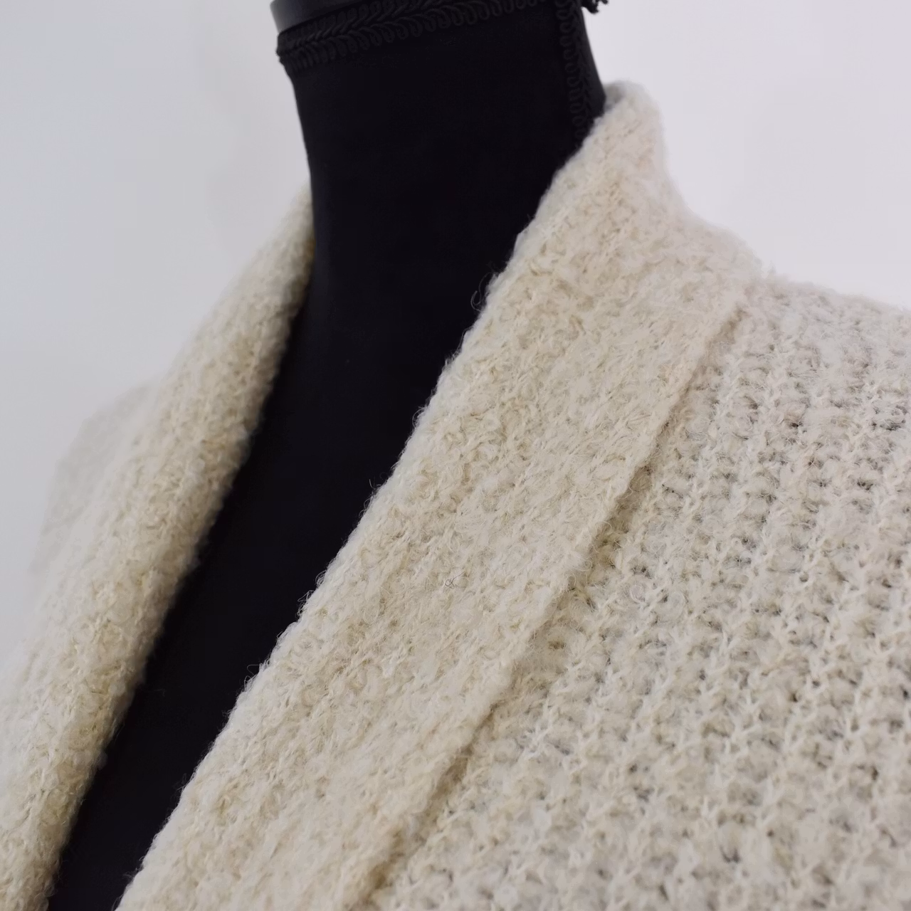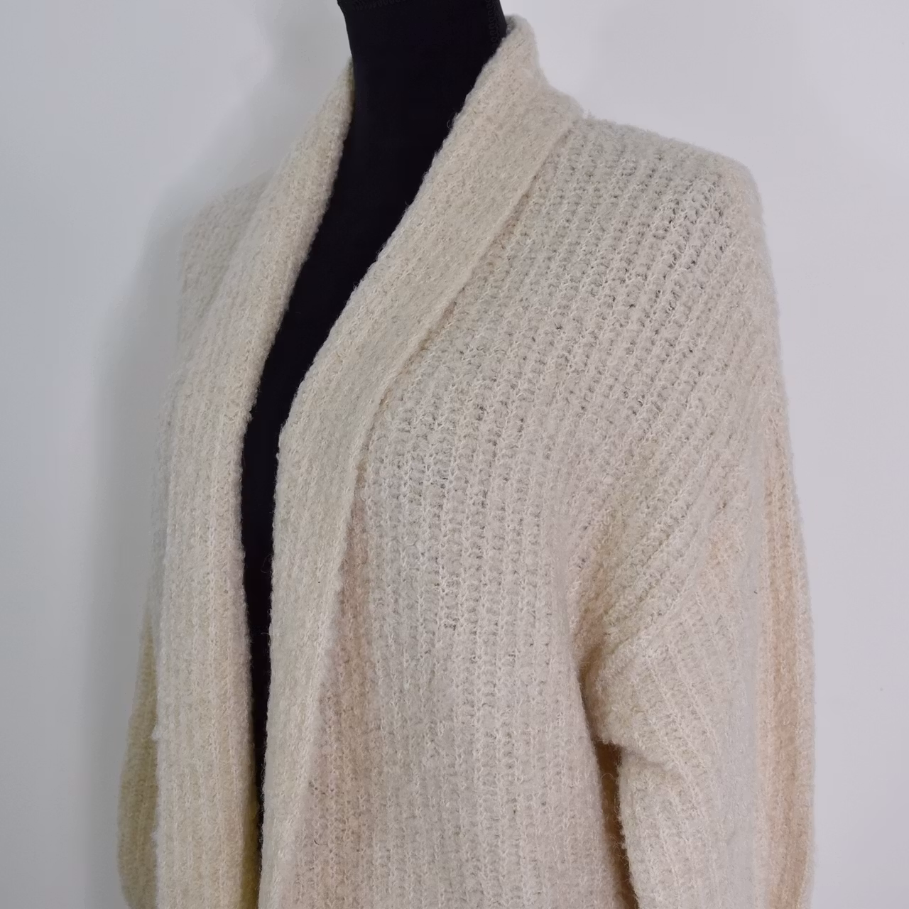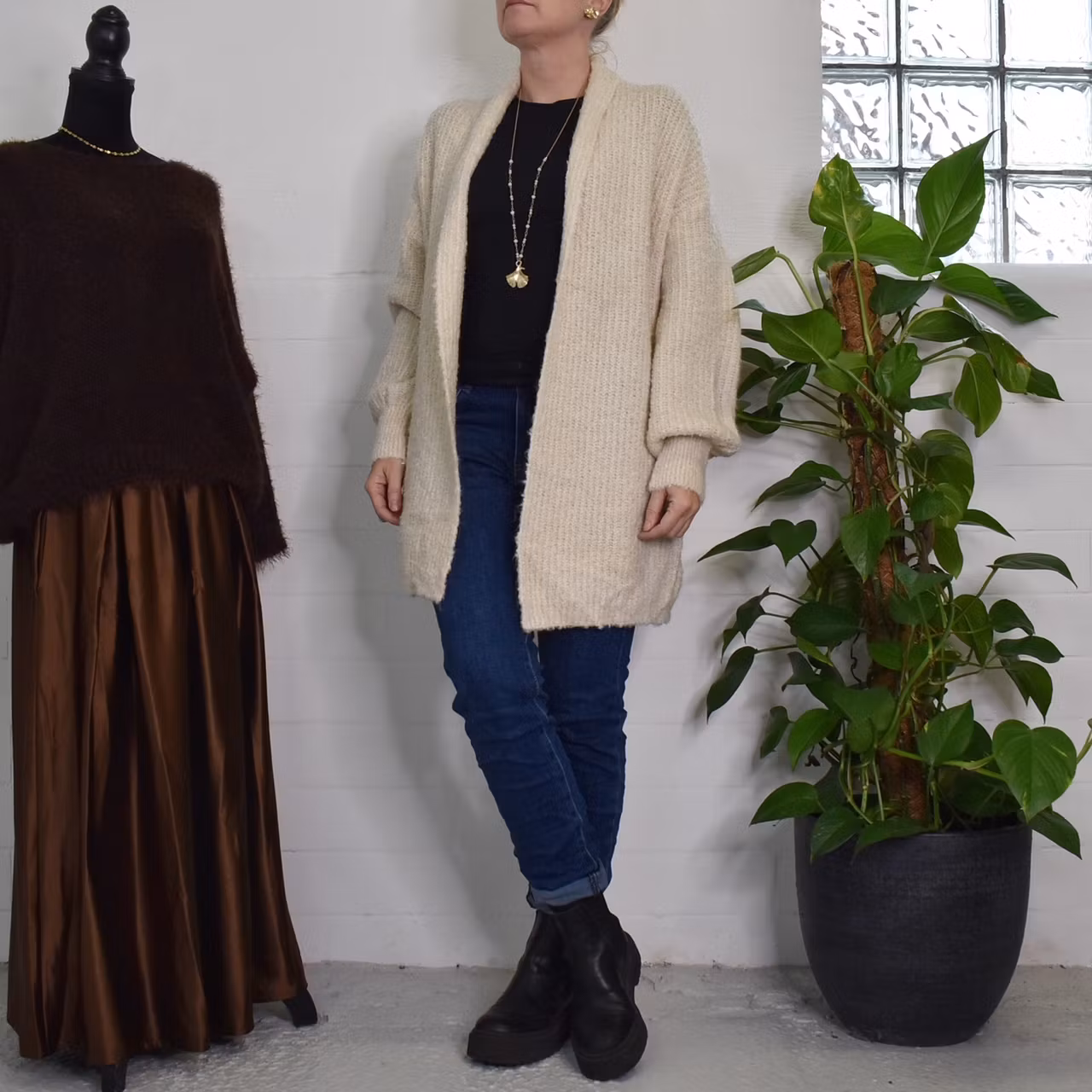 Det här är en härlig kofta stickad i läckert bouclé-garn. Axeln är nerhasad och i ärmslutet är där en stretchig mudd. Materialet innehåller 28% återvunnet material. Det kan vara en liten skillnad i längden där koftan är delad framtill. One Size - passar uppskattningsvis upp till L-L/XL (40-40/42). Då vi alla är olika formade rekommenderar vi att man tar hjälp av måtten nedan för att bedöma om plagget kan passa. Modellen har en bröstvidd på cirka 88cm och är 163cm lång.