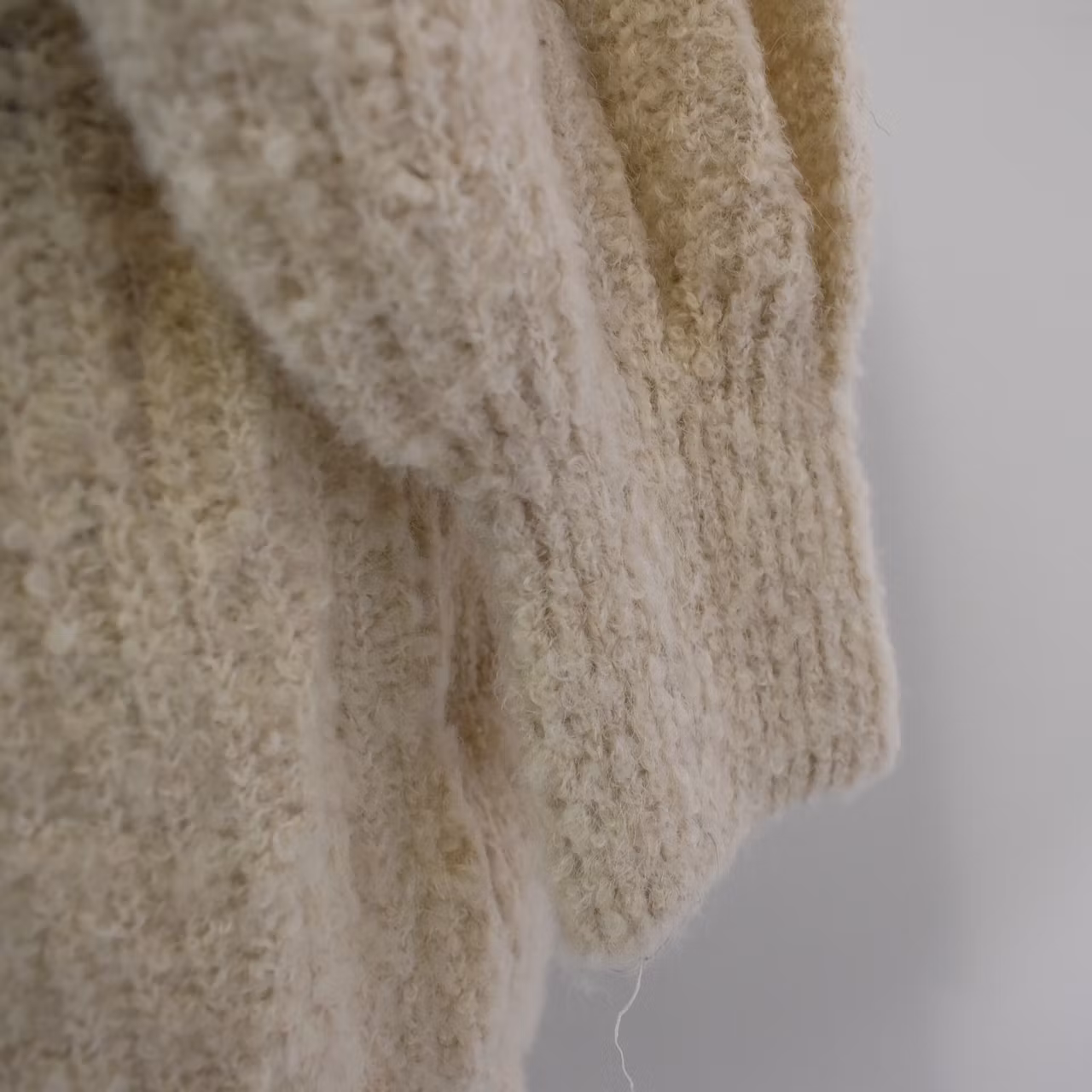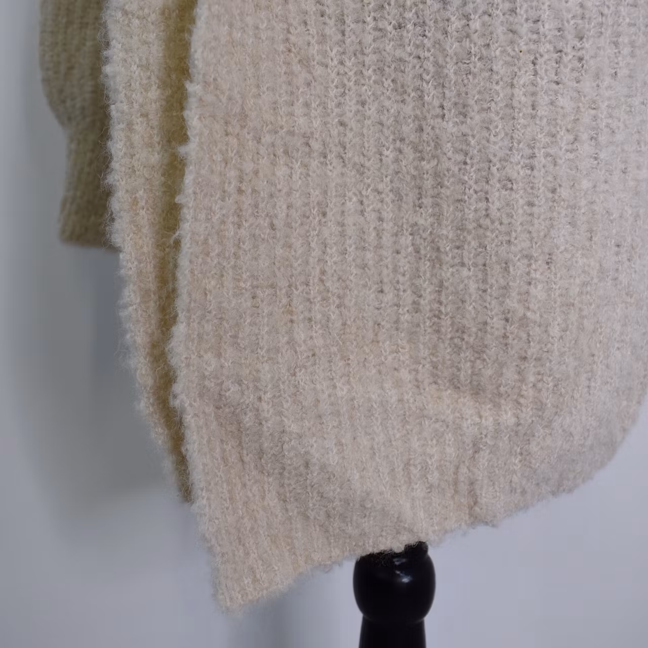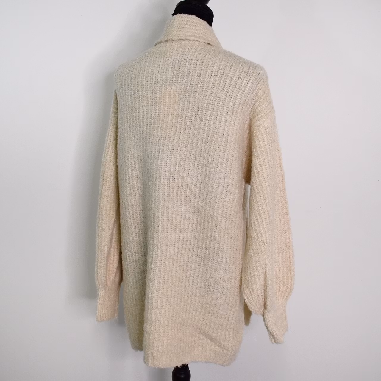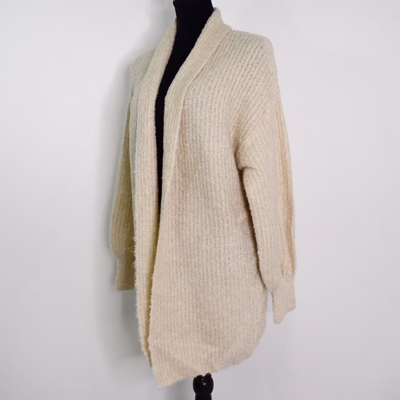 Det här är en härlig kofta stickad i läckert bouclé-garn. Axeln är nerhasad och i ärmslutet är där en stretchig mudd. Materialet innehåller 28% återvunnet material. Det kan vara en liten skillnad i längden där koftan är delad framtill. One Size - passar uppskattningsvis upp till L-L/XL (40-40/42). Då vi alla är olika formade rekommenderar vi att man tar hjälp av måtten nedan för att bedöma om plagget kan passa. Modellen har en bröstvidd på cirka 88cm och är 163cm lång.