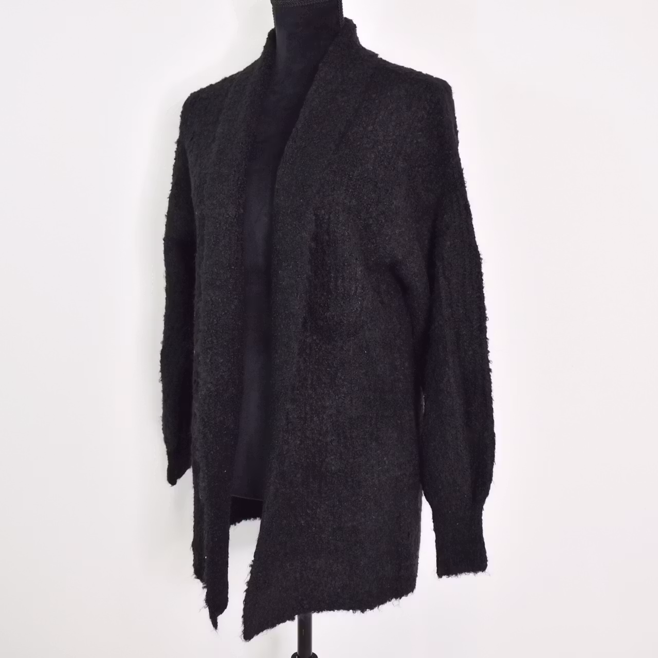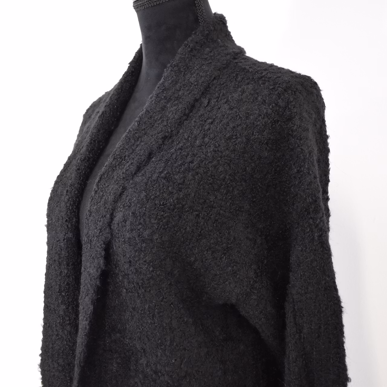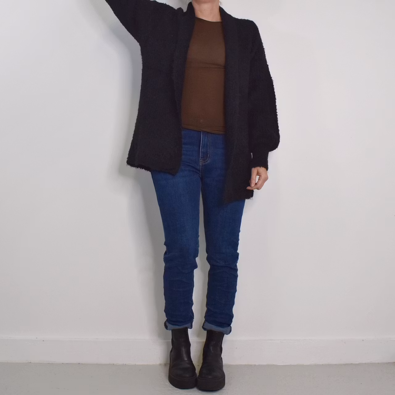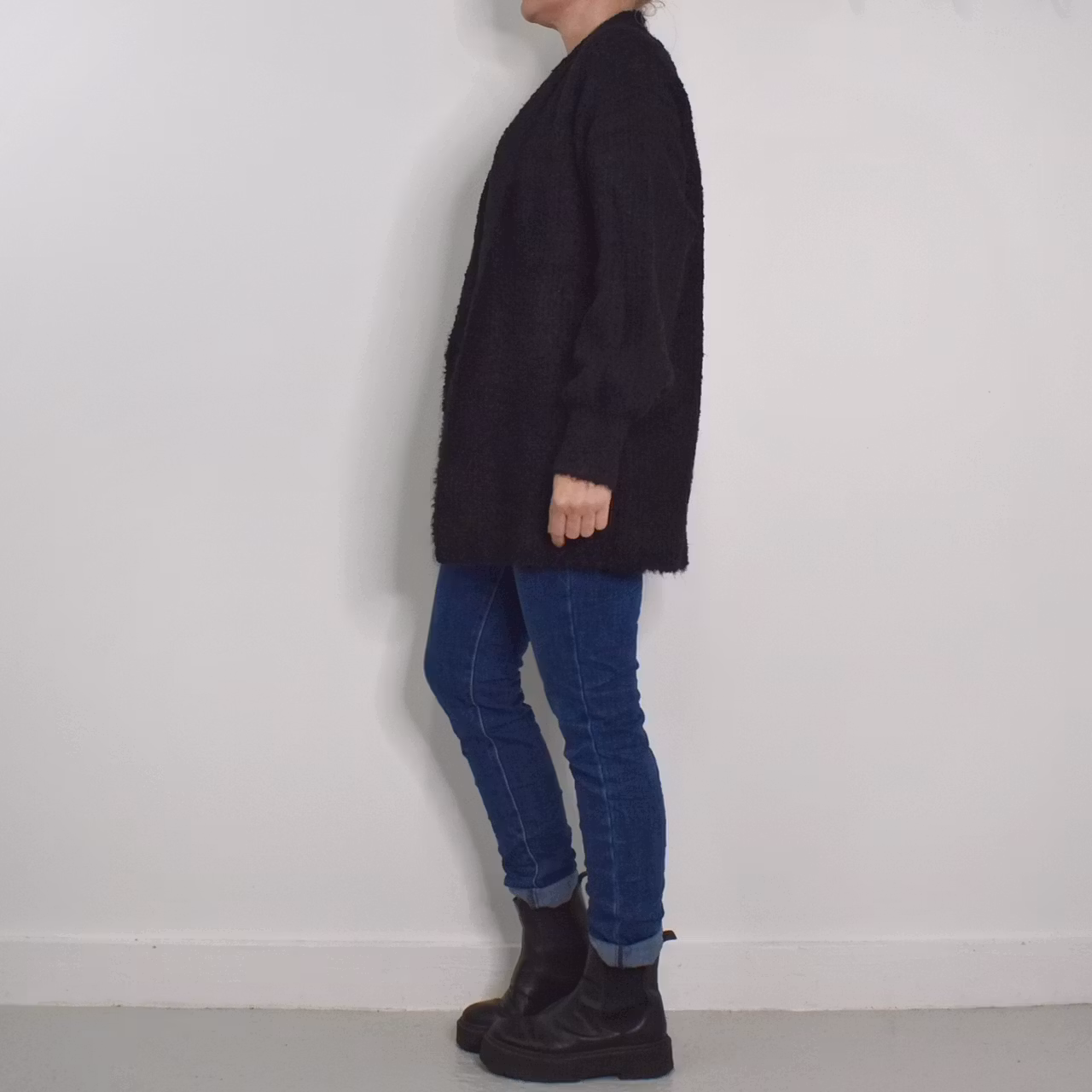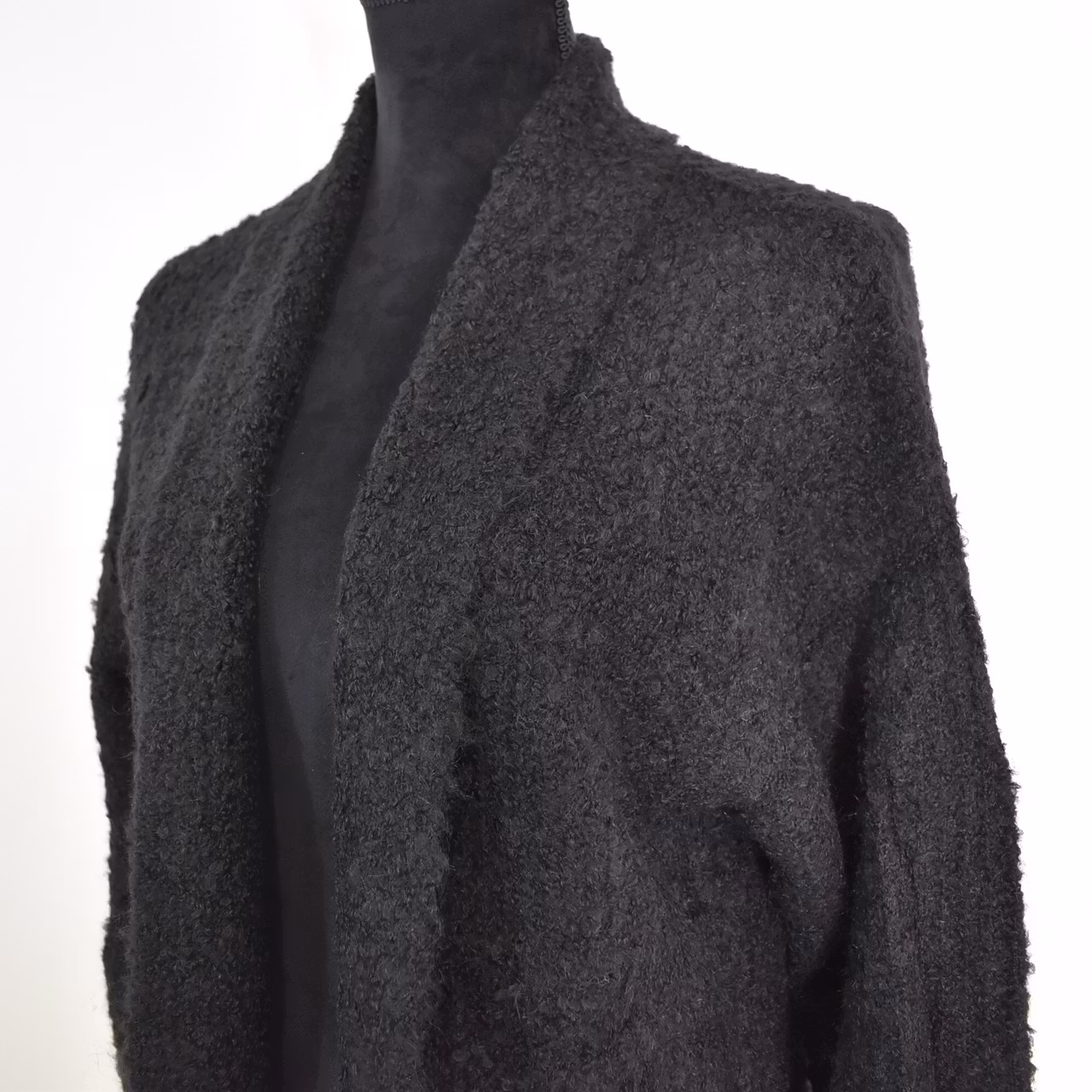 Det här är en härlig kofta stickad i läckert bouclé-garn. Axeln är nerhasad och i ärmslutet är där en stretchig mudd. Materialet innehåller 28% återvunnet material. Det kan vara en liten skillnad i längden där koftan är delad framtill. One Size - passar uppskattningsvis upp till L-L/XL (40-40/42). Då vi alla är olika formade rekommenderar vi att man tar hjälp av måtten nedan för att bedöma om plagget kan passa. Modellen har en bröstvidd på cirka 88cm och är 163cm lång.