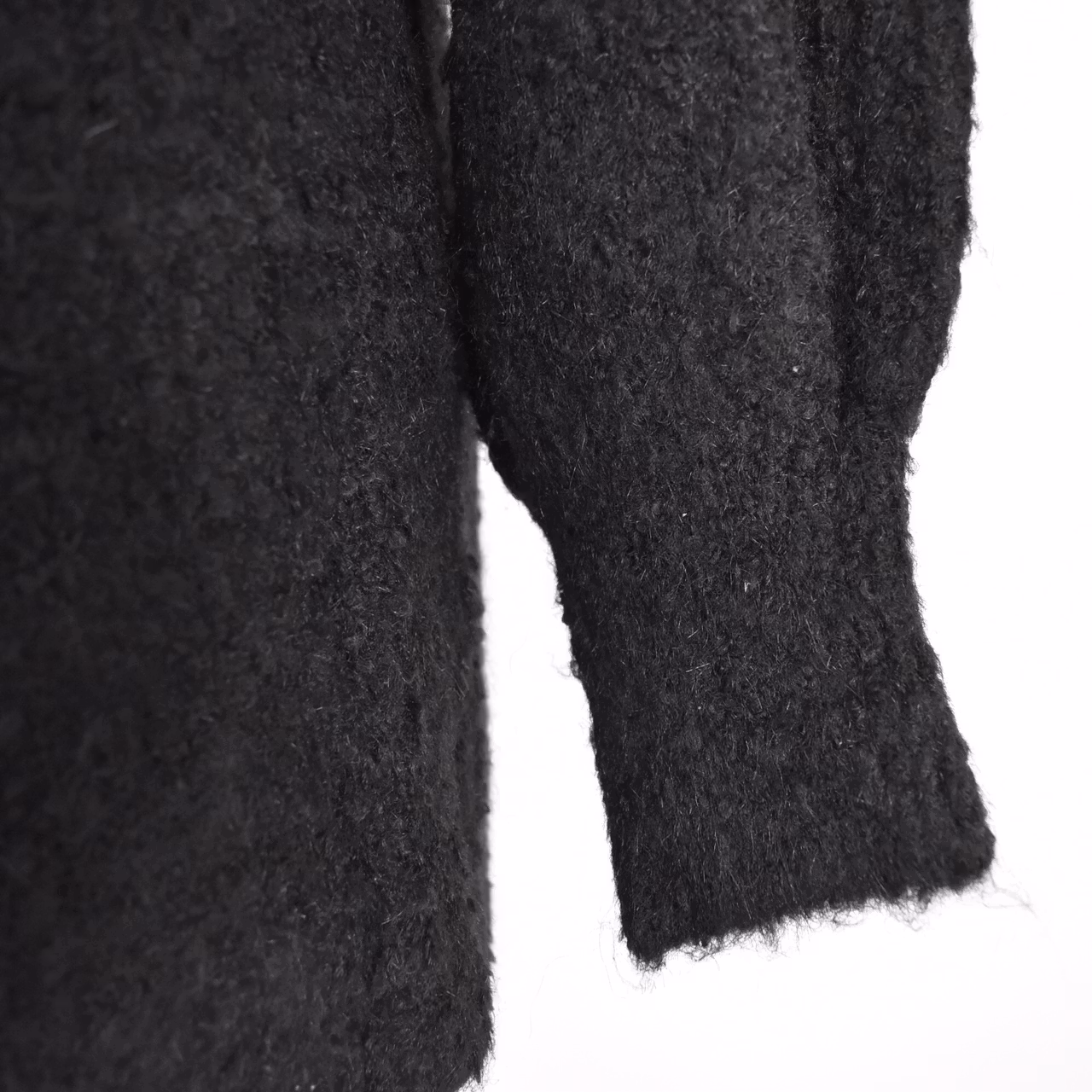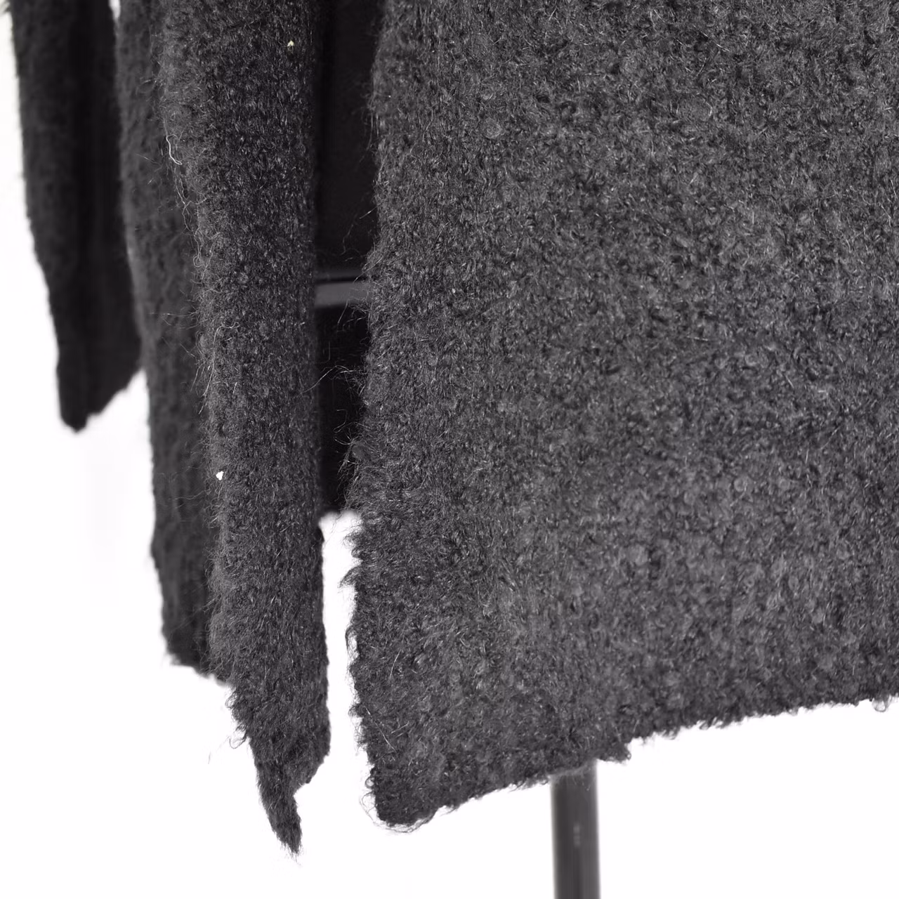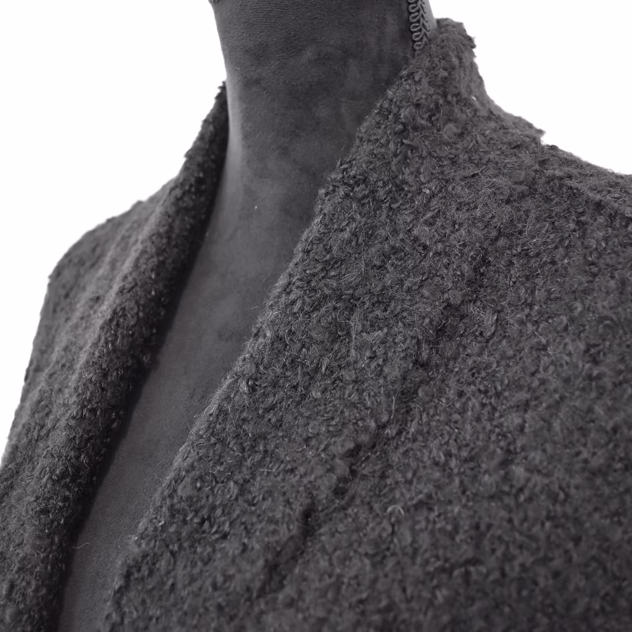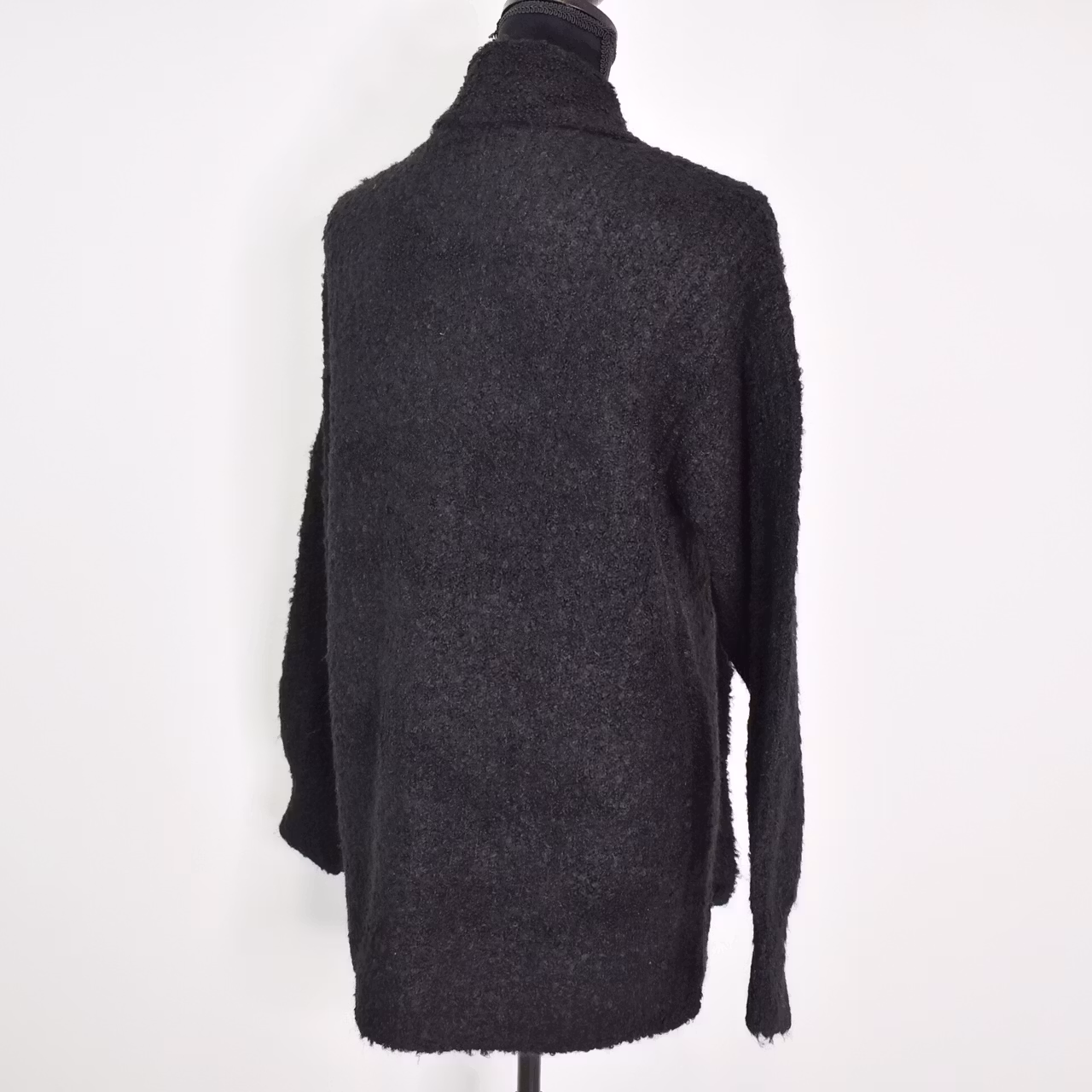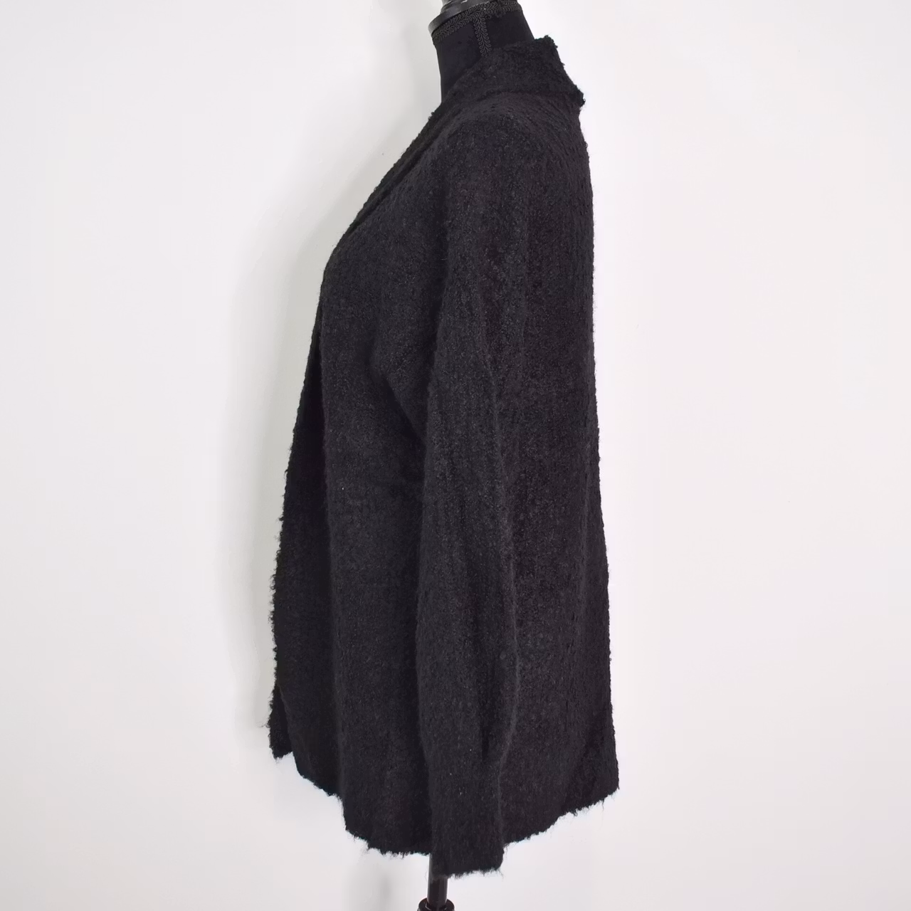 Det här är en härlig kofta stickad i läckert bouclé-garn. Axeln är nerhasad och i ärmslutet är där en stretchig mudd. Materialet innehåller 28% återvunnet material. Det kan vara en liten skillnad i längden där koftan är delad framtill. One Size - passar uppskattningsvis upp till L-L/XL (40-40/42). Då vi alla är olika formade rekommenderar vi att man tar hjälp av måtten nedan för att bedöma om plagget kan passa. Modellen har en bröstvidd på cirka 88cm och är 163cm lång.