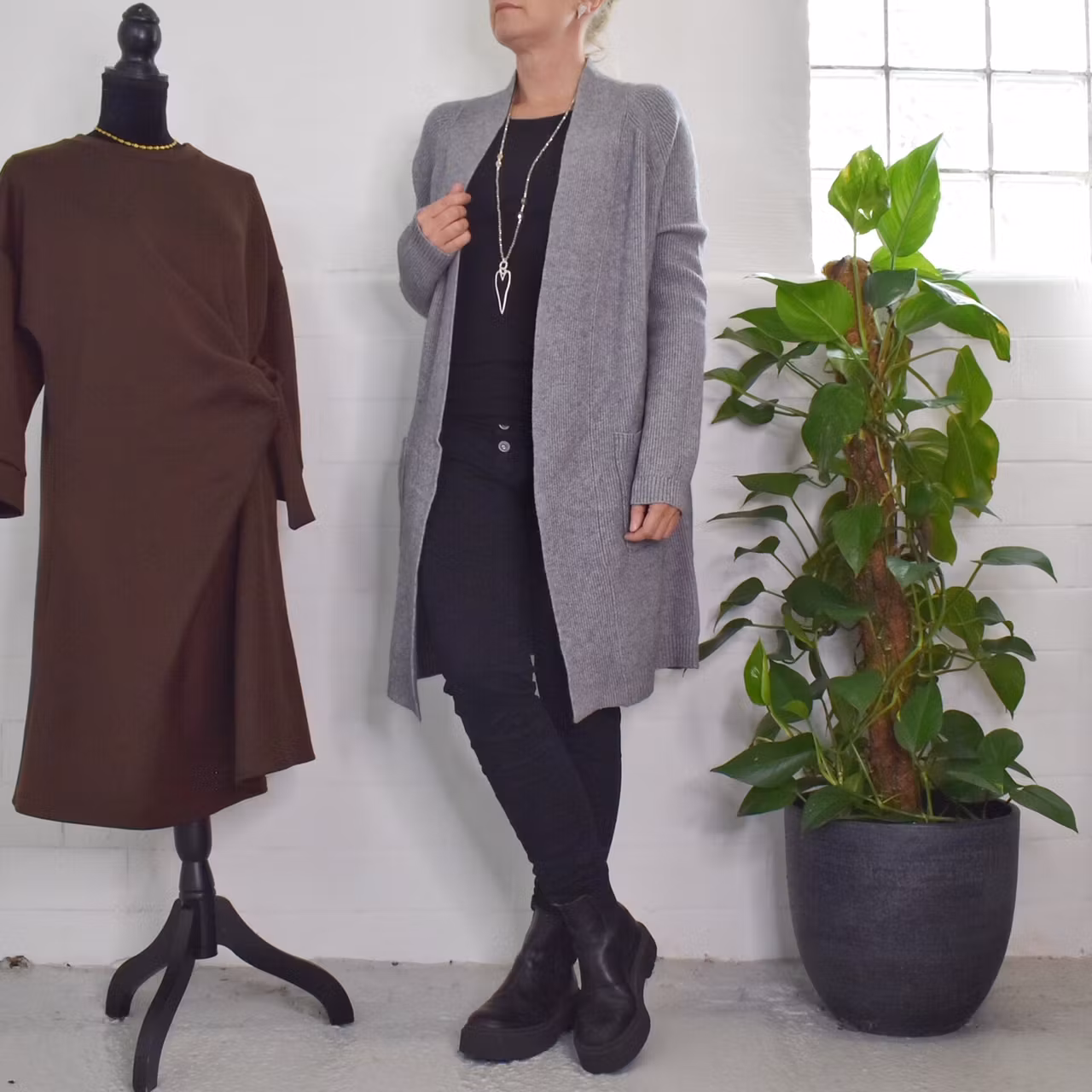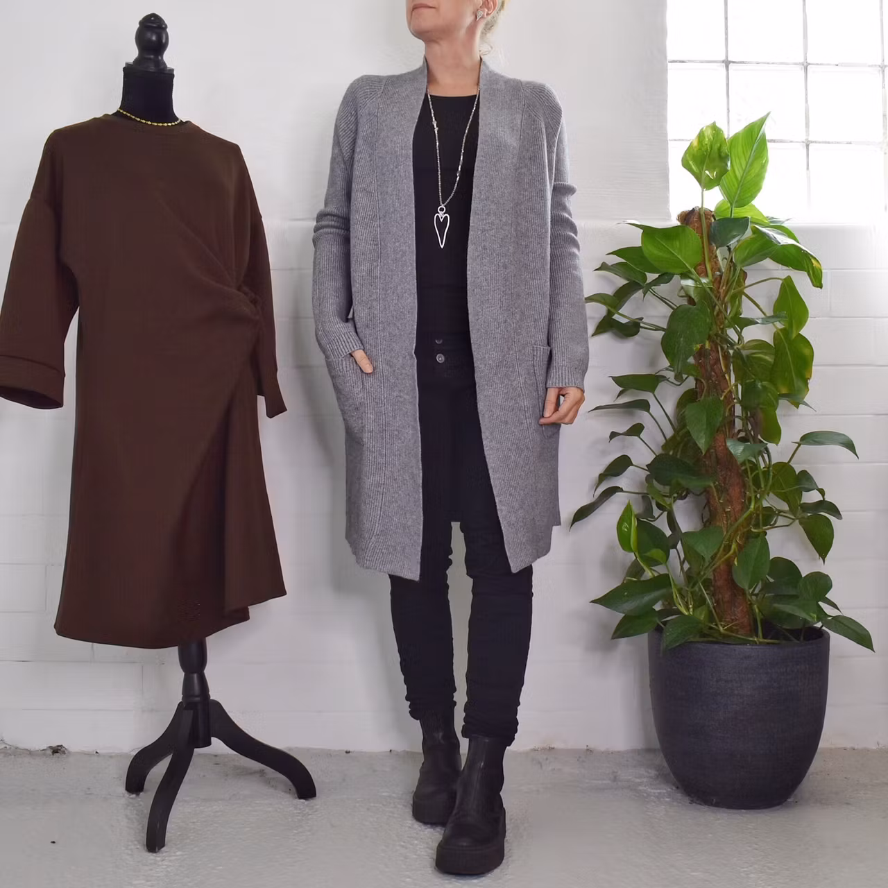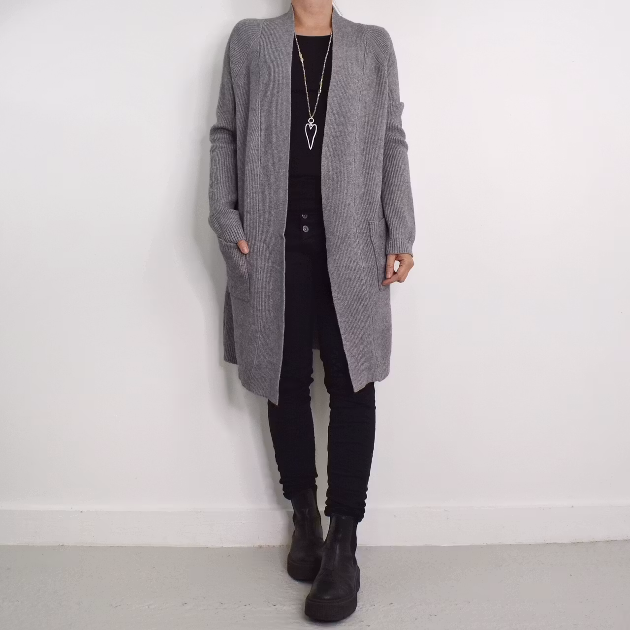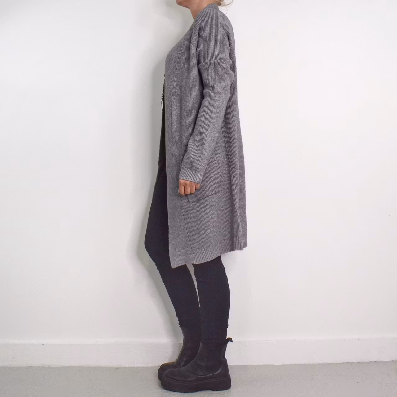 Det här är en underbar ribbstickad halvlång kofta i mjukt härligt material och med två fickor fram. One Size - passar uppskattningsvis upp till L/XL (40/42). Då vi alla är olika formade rekommenderar vi att man tar hjälp av måtten nedan för att bedöma om plagget kan passa. Modellen har en bröstvidd på cirka 88cm och är 163cm lång.