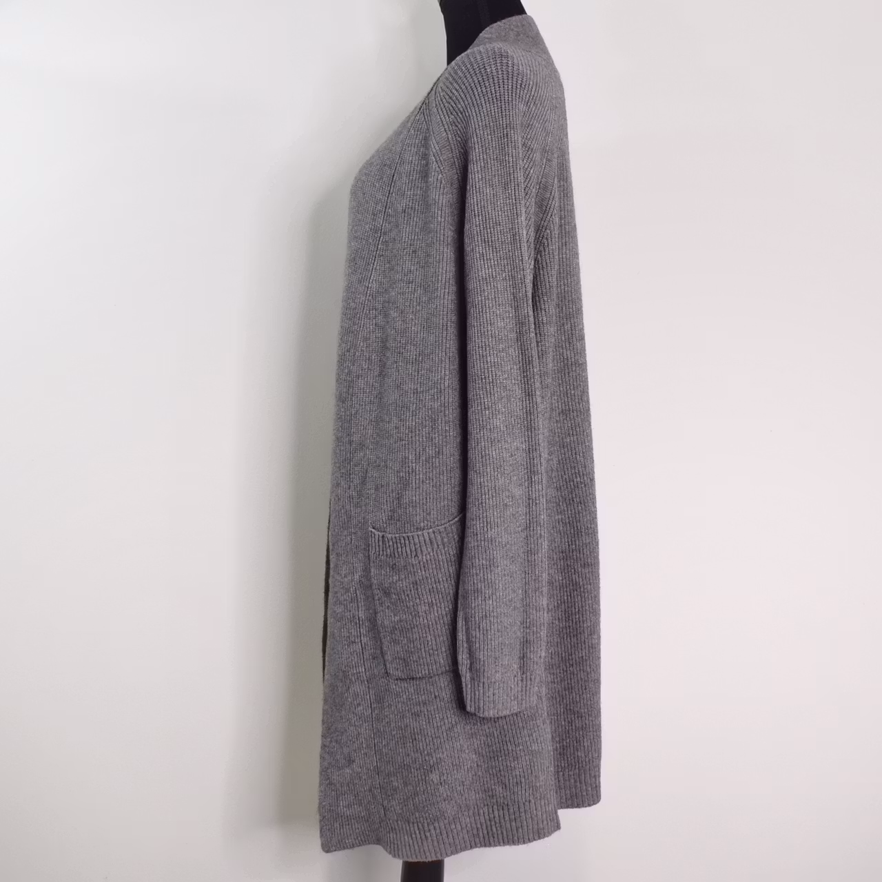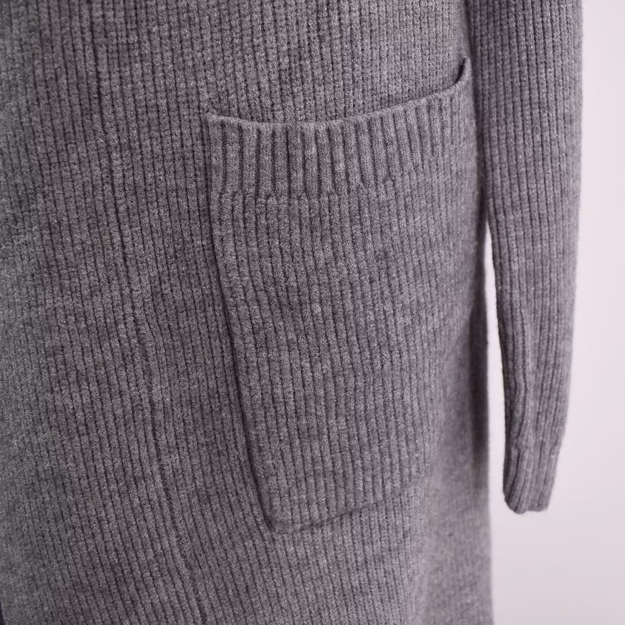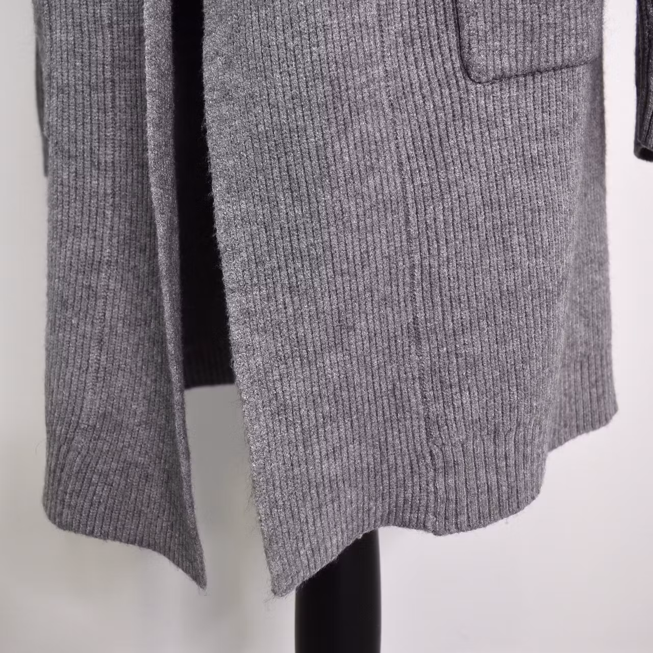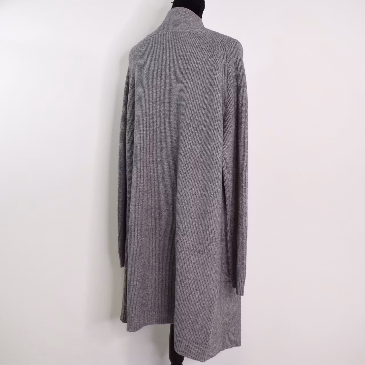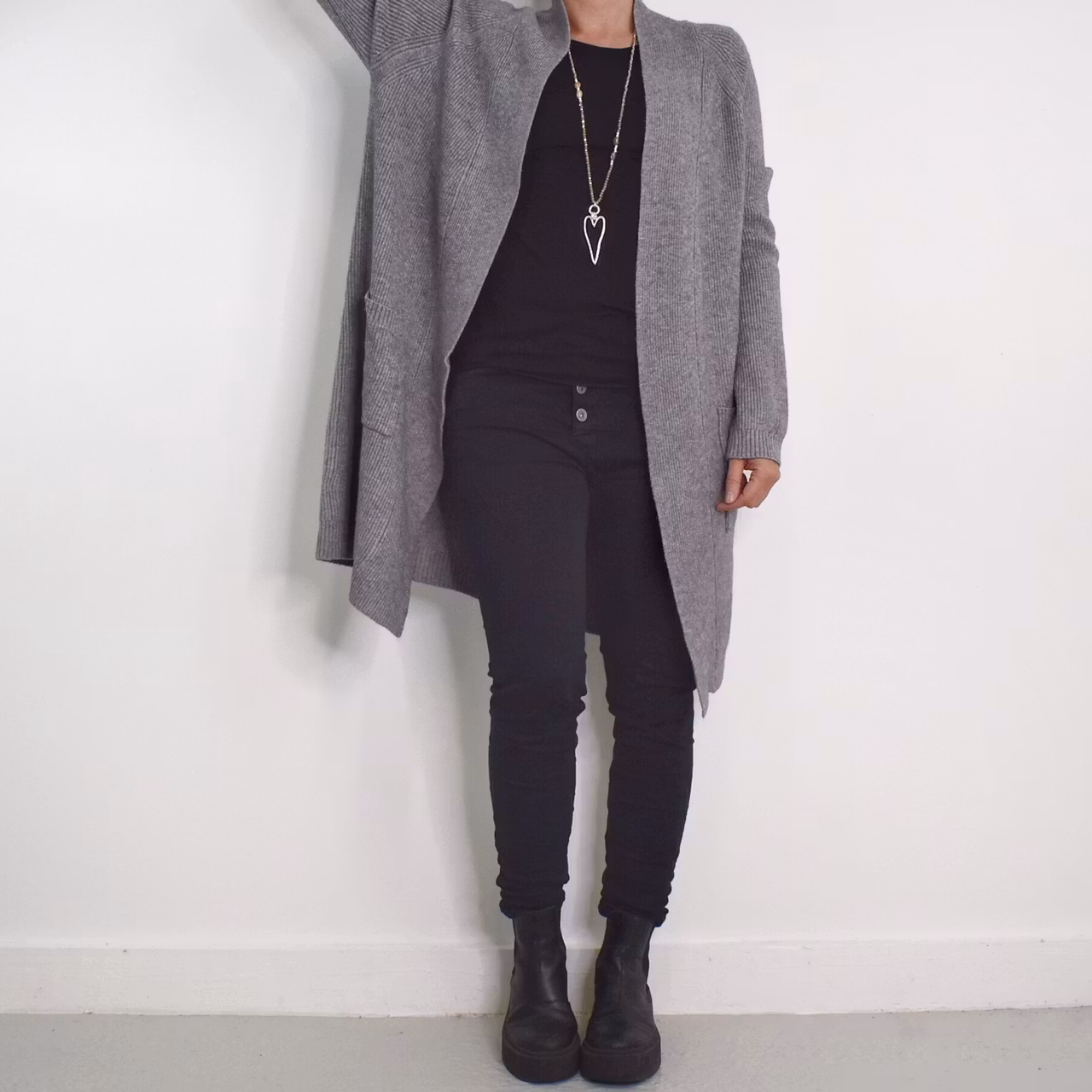 Det här är en underbar ribbstickad halvlång kofta i mjukt härligt material och med två fickor fram. One Size - passar uppskattningsvis upp till L/XL (40/42). Då vi alla är olika formade rekommenderar vi att man tar hjälp av måtten nedan för att bedöma om plagget kan passa. Modellen har en bröstvidd på cirka 88cm och är 163cm lång.