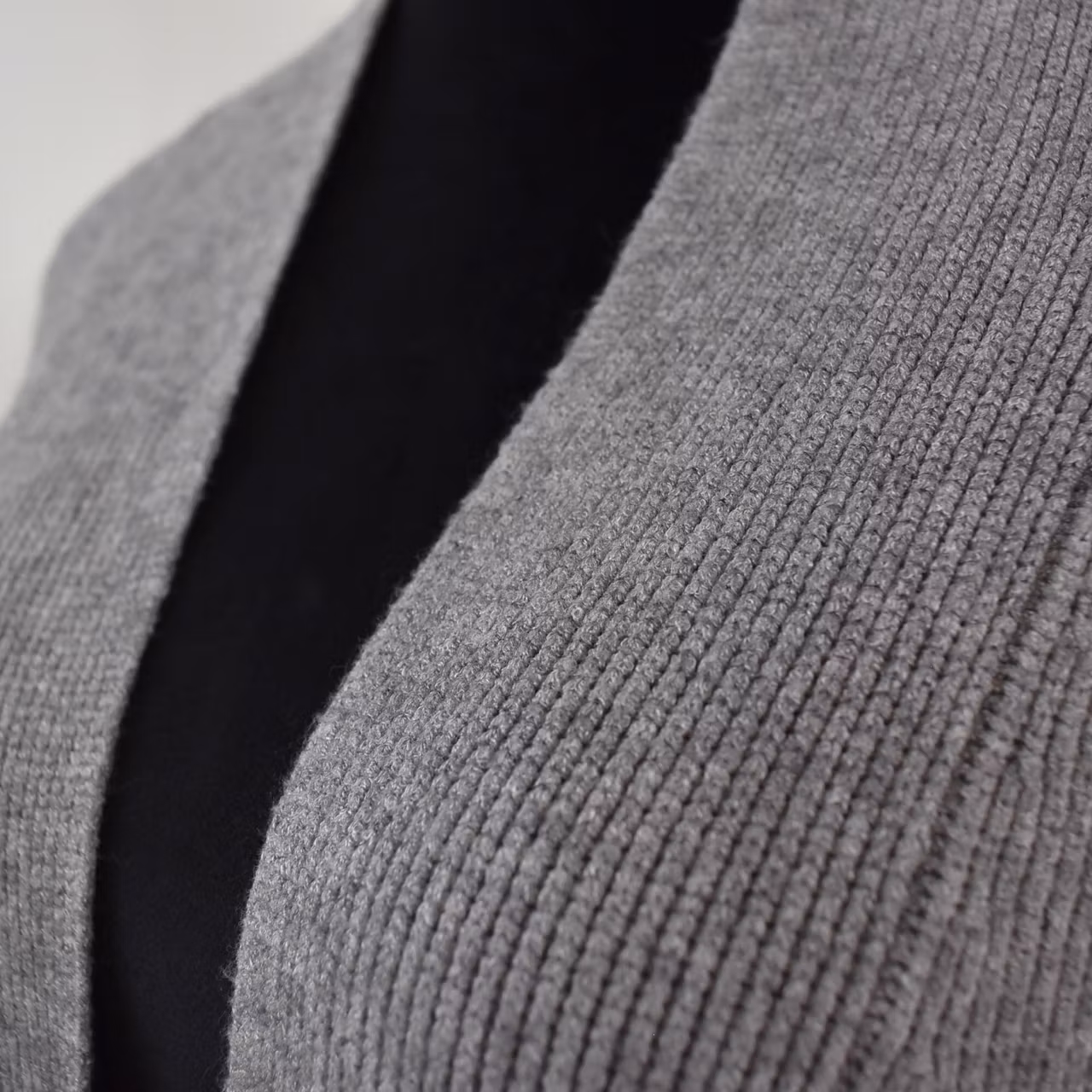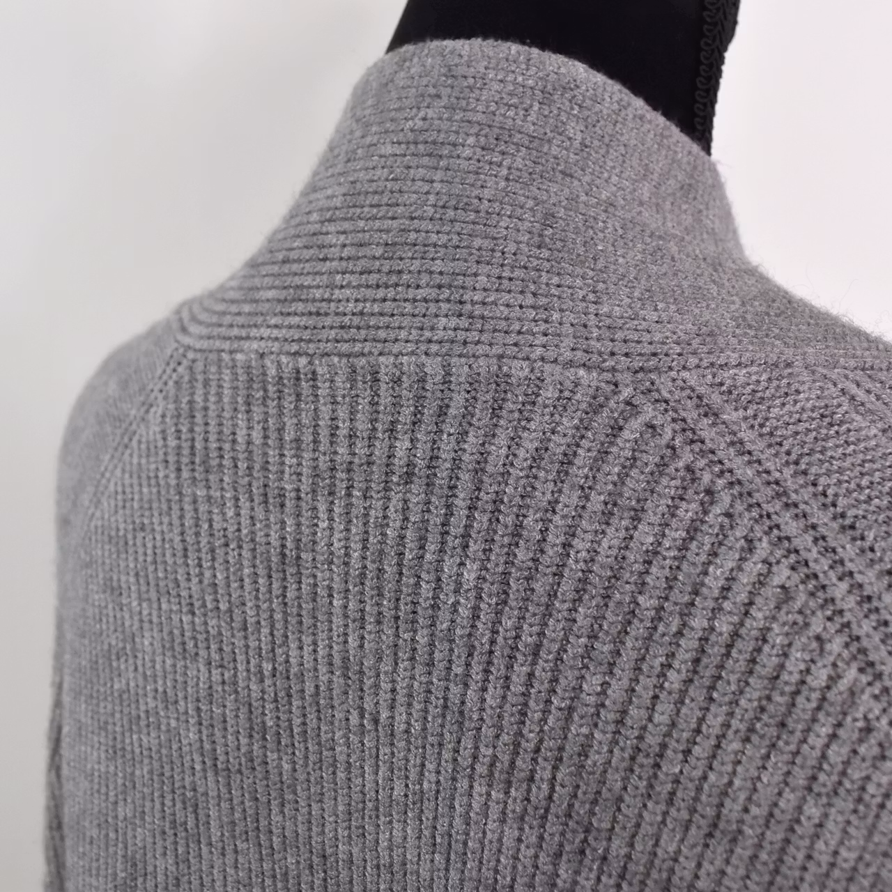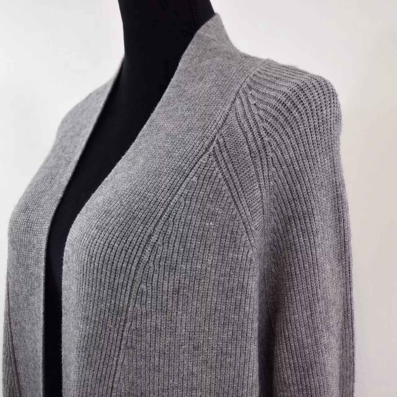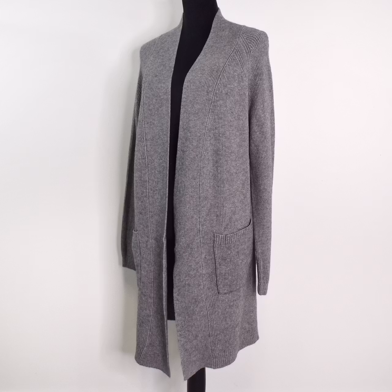 Det här är en underbar ribbstickad halvlång kofta i mjukt härligt material och med två fickor fram. One Size - passar uppskattningsvis upp till L/XL (40/42). Då vi alla är olika formade rekommenderar vi att man tar hjälp av måtten nedan för att bedöma om plagget kan passa. Modellen har en bröstvidd på cirka 88cm och är 163cm lång.