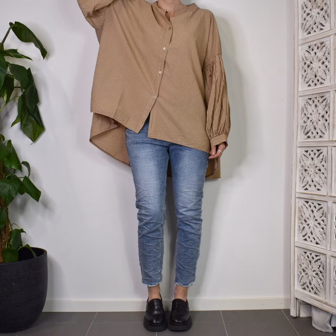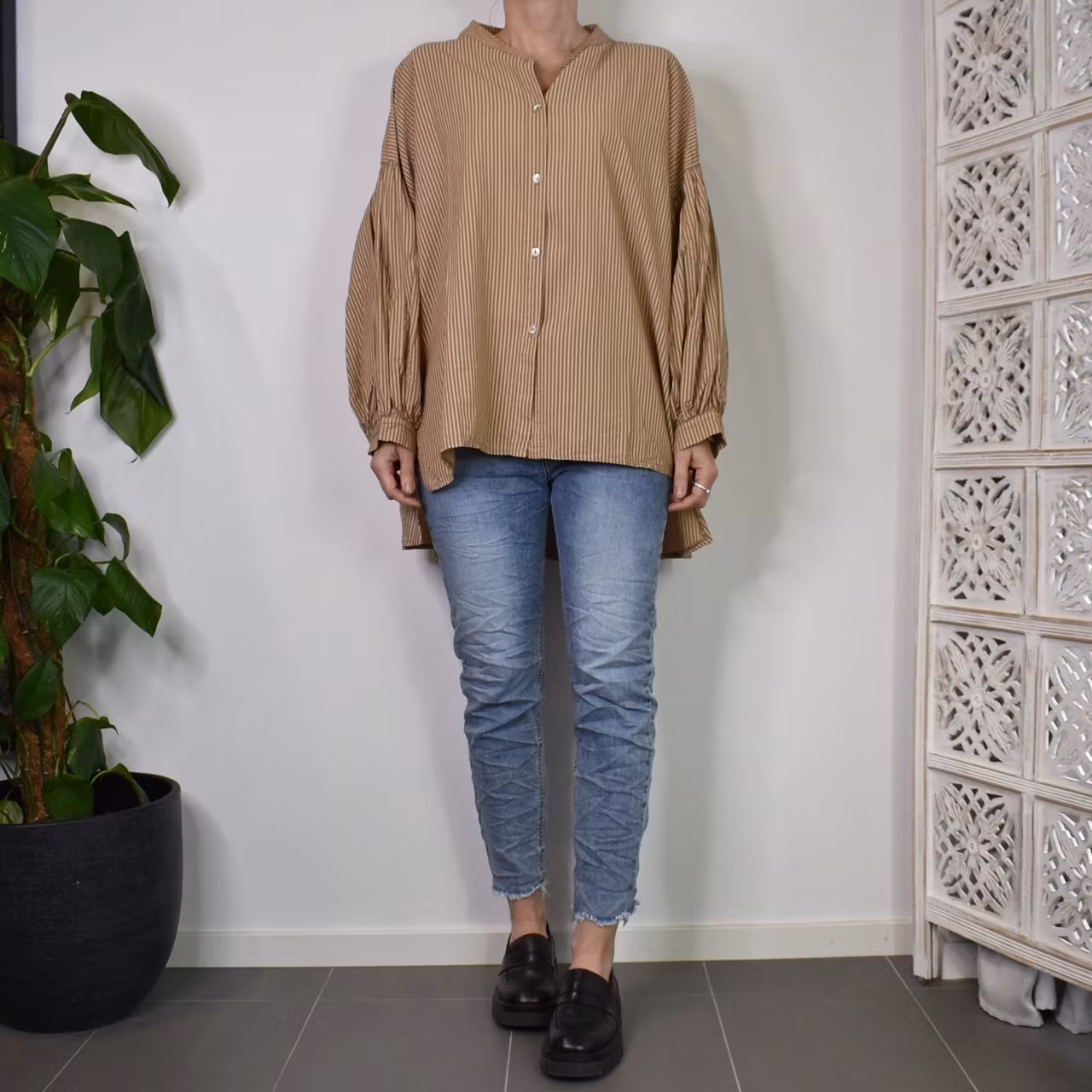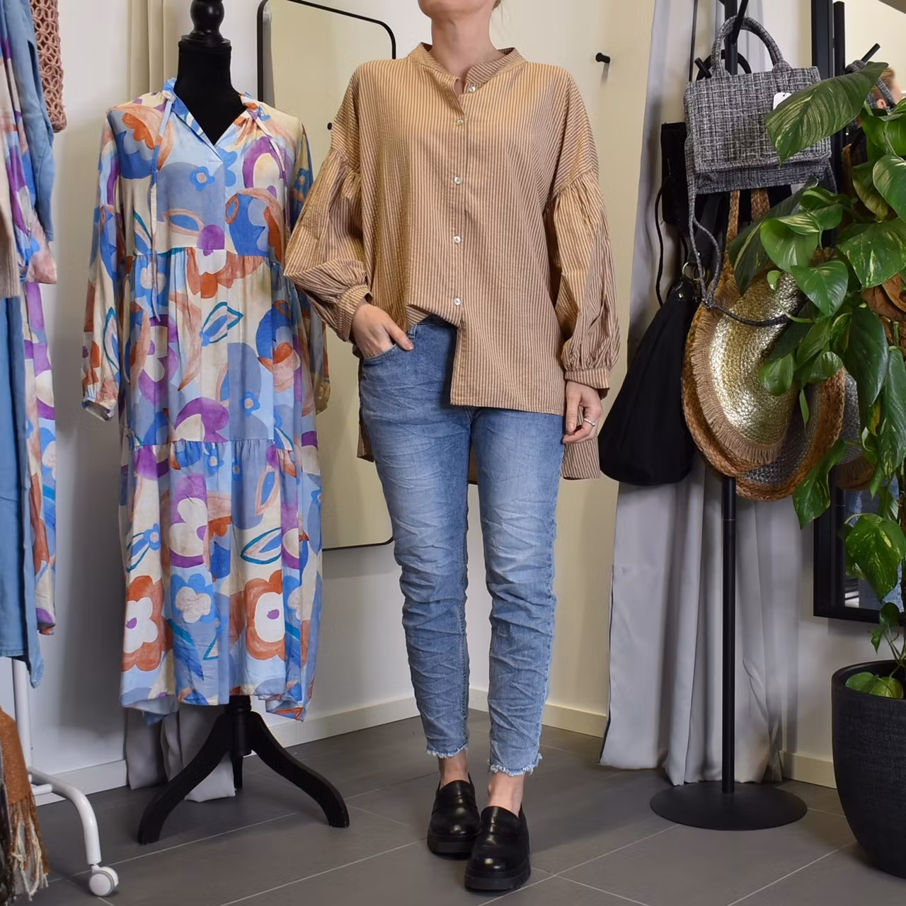 Det här är en snygg storskjorta med liten ståkrage, knappar hela vägen framtill och läcker puffig ärm. Axeln är nerhasad och vid sömmen till ärmen är tyget rynkat. I ärmslutet finns en knapp och i sidorna är där en liten slits. Nertill på framsidan går sömmen lite snett på varje sida. Blusens bakstycke är längre än framtill. Ärmen kan dras upp om man vill ha den ännu puffigare. Tyget är något våfflat och observera att det inte innehåller stretch. Tänk på att ärmen blir kortare ju bredare man är över axlarna. Då vi alla är olika formade rekommenderar vi att man alltid tar hjälp av måtten nedan för att bedöma om plagget kan passa eller ej. One Size - passar uppskattningsvis upp till L/XL (passformen varierar beroende på varje unik persons form och proportioner). Se ungefärliga mått längre ner i beskrivningen. Modellen är storlek S, har en bröstvidd på cirka 88cm, och är 163cm lång.