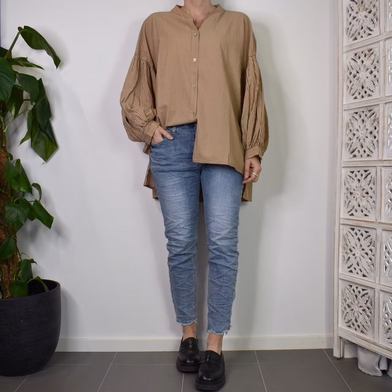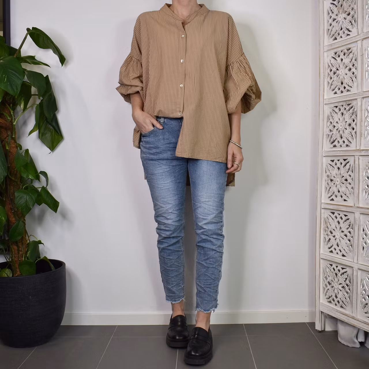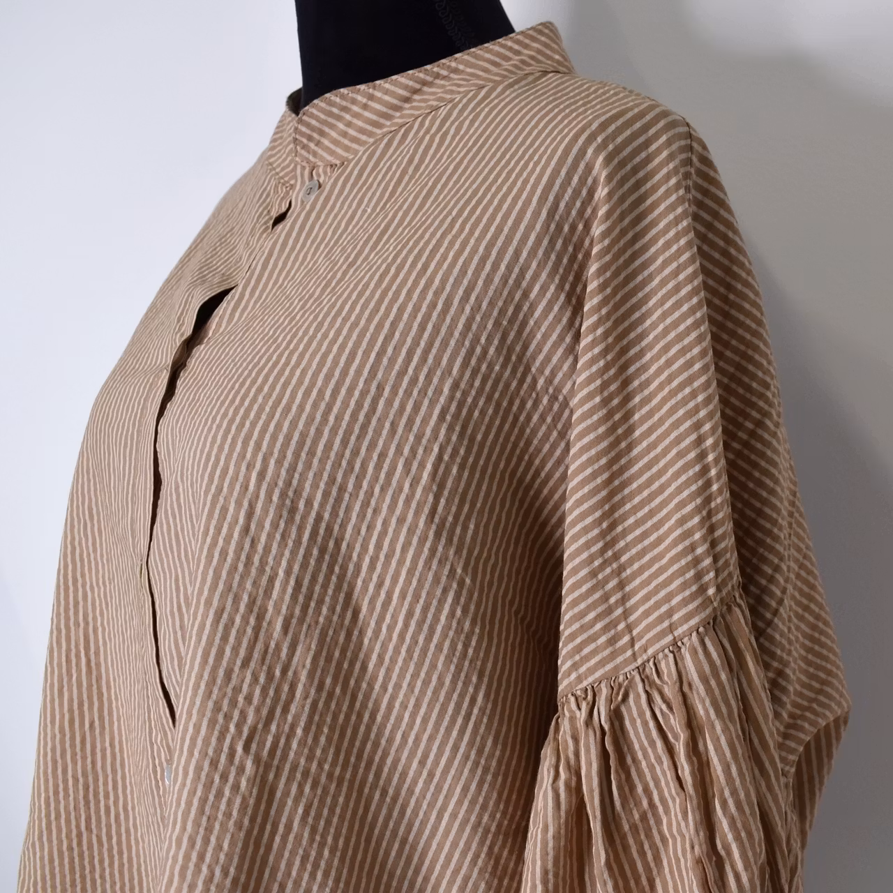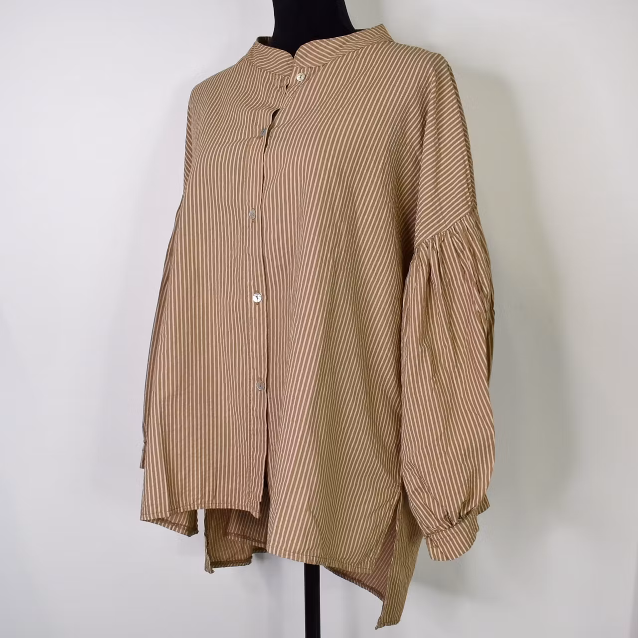 Det här är en snygg storskjorta med liten ståkrage, knappar hela vägen framtill och läcker puffig ärm. Axeln är nerhasad och vid sömmen till ärmen är tyget rynkat. I ärmslutet finns en knapp och i sidorna är där en liten slits. Nertill på framsidan går sömmen lite snett på varje sida. Blusens bakstycke är längre än framtill. Ärmen kan dras upp om man vill ha den ännu puffigare. Tyget är något våfflat och observera att det inte innehåller stretch. Tänk på att ärmen blir kortare ju bredare man är över axlarna. Då vi alla är olika formade rekommenderar vi att man alltid tar hjälp av måtten nedan för att bedöma om plagget kan passa eller ej. One Size - passar uppskattningsvis upp till L/XL (passformen varierar beroende på varje unik persons form och proportioner). Se ungefärliga mått längre ner i beskrivningen. Modellen är storlek S, har en bröstvidd på cirka 88cm, och är 163cm lång.
