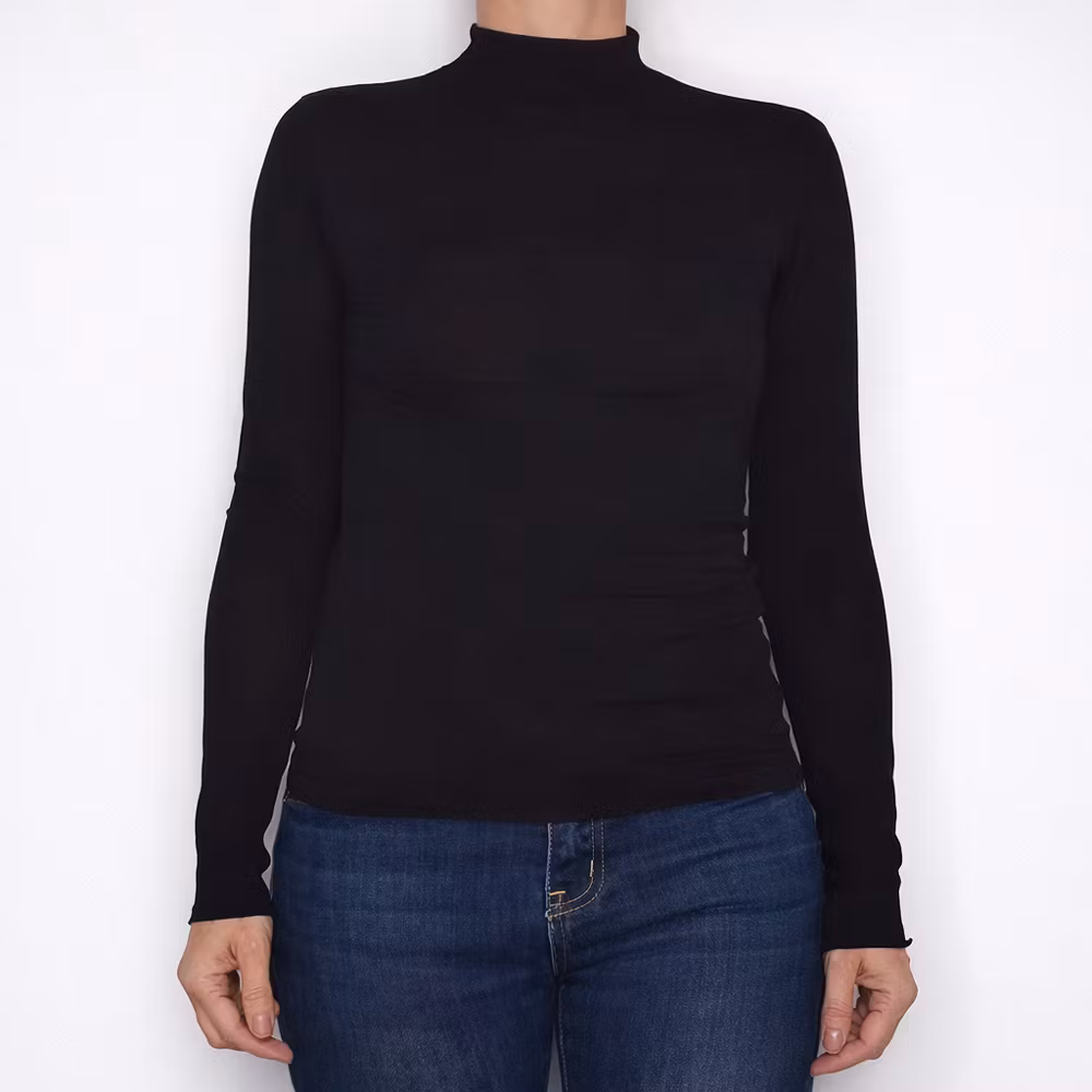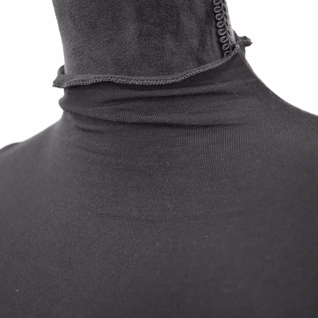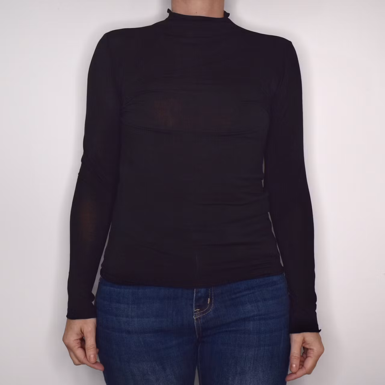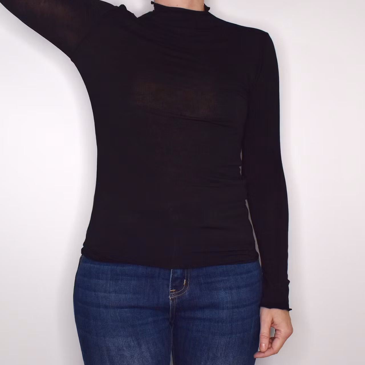 Det här är en skön åtsittande och höghalsad bastopp i mycket tunt, mjukt och stretchigt material. Ett användbart plagg som är skönt att ha under tröjor, koftor, kavajer etc. Observera att tyget kan ha en speciell doft när det är nytt men detta försvinner vid användning och tvätt. Modellen har en bröstvidd på cirka 88cm, är 163cm lång och bär S/M.