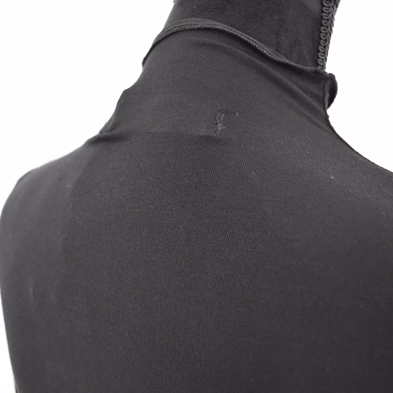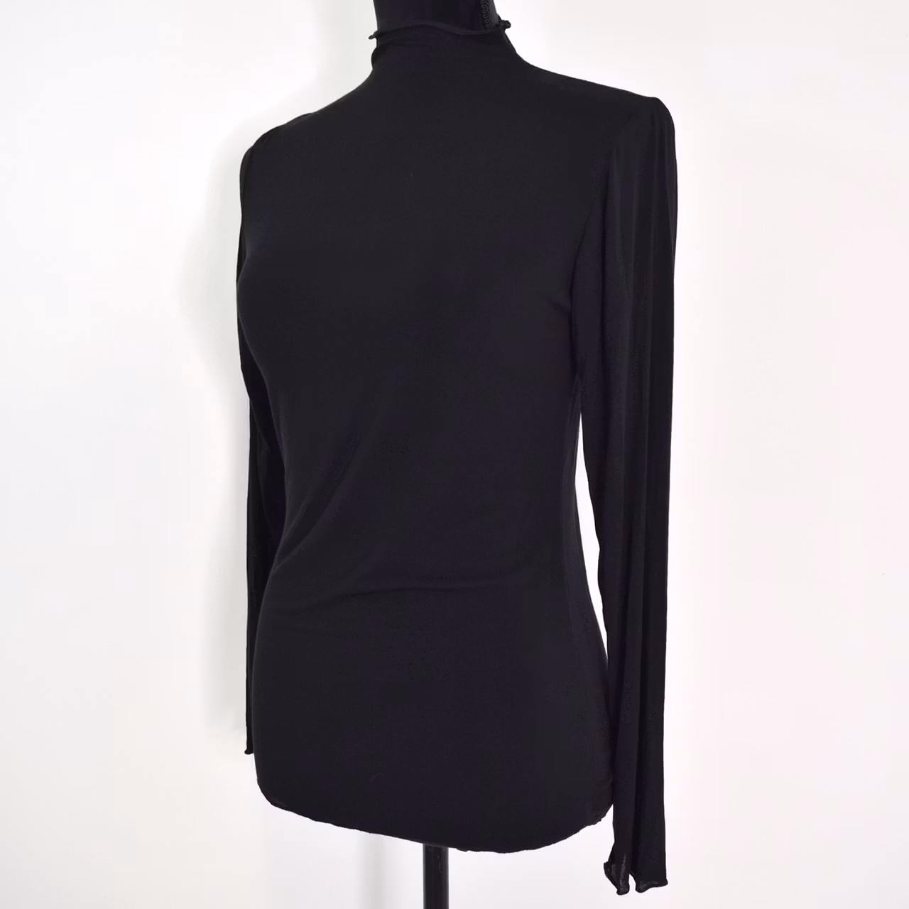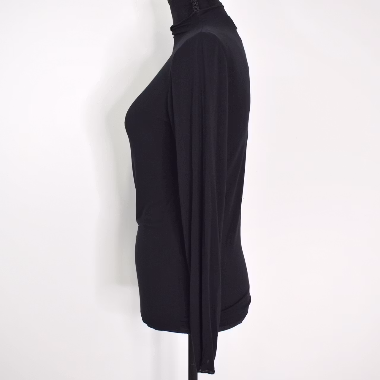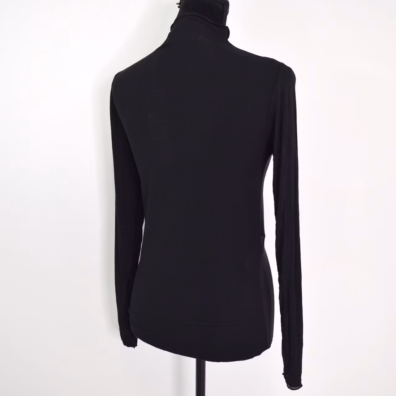 Det här är en skön åtsittande och höghalsad bastopp i mycket tunt, mjukt och stretchigt material. Ett användbart plagg som är skönt att ha under tröjor, koftor, kavajer etc. Observera att tyget kan ha en speciell doft när det är nytt men detta försvinner vid användning och tvätt. Modellen har en bröstvidd på cirka 88cm, är 163cm lång och bär S/M.