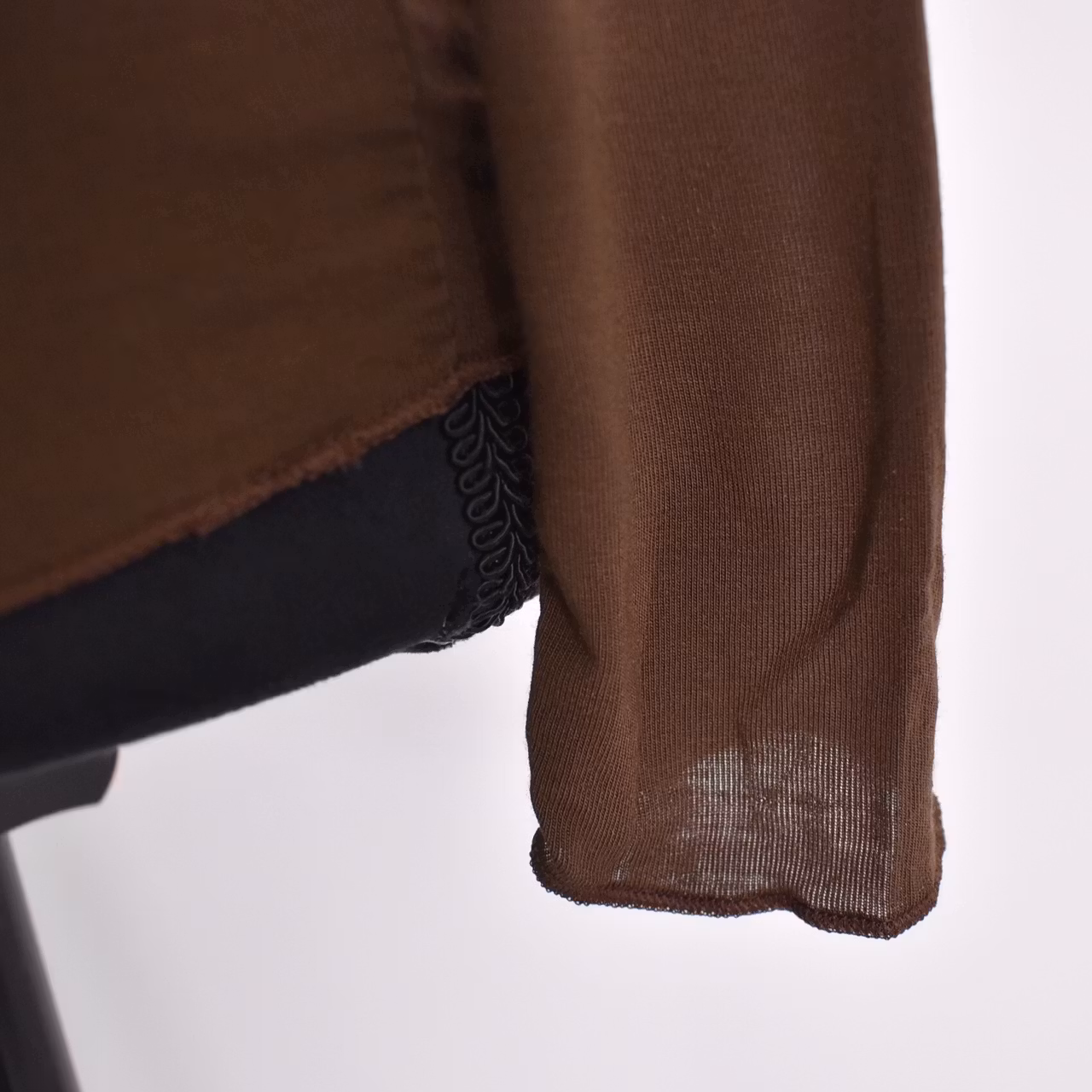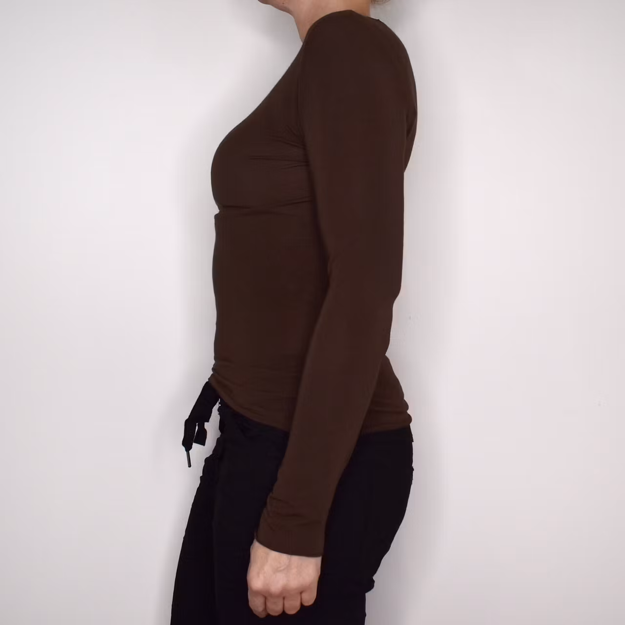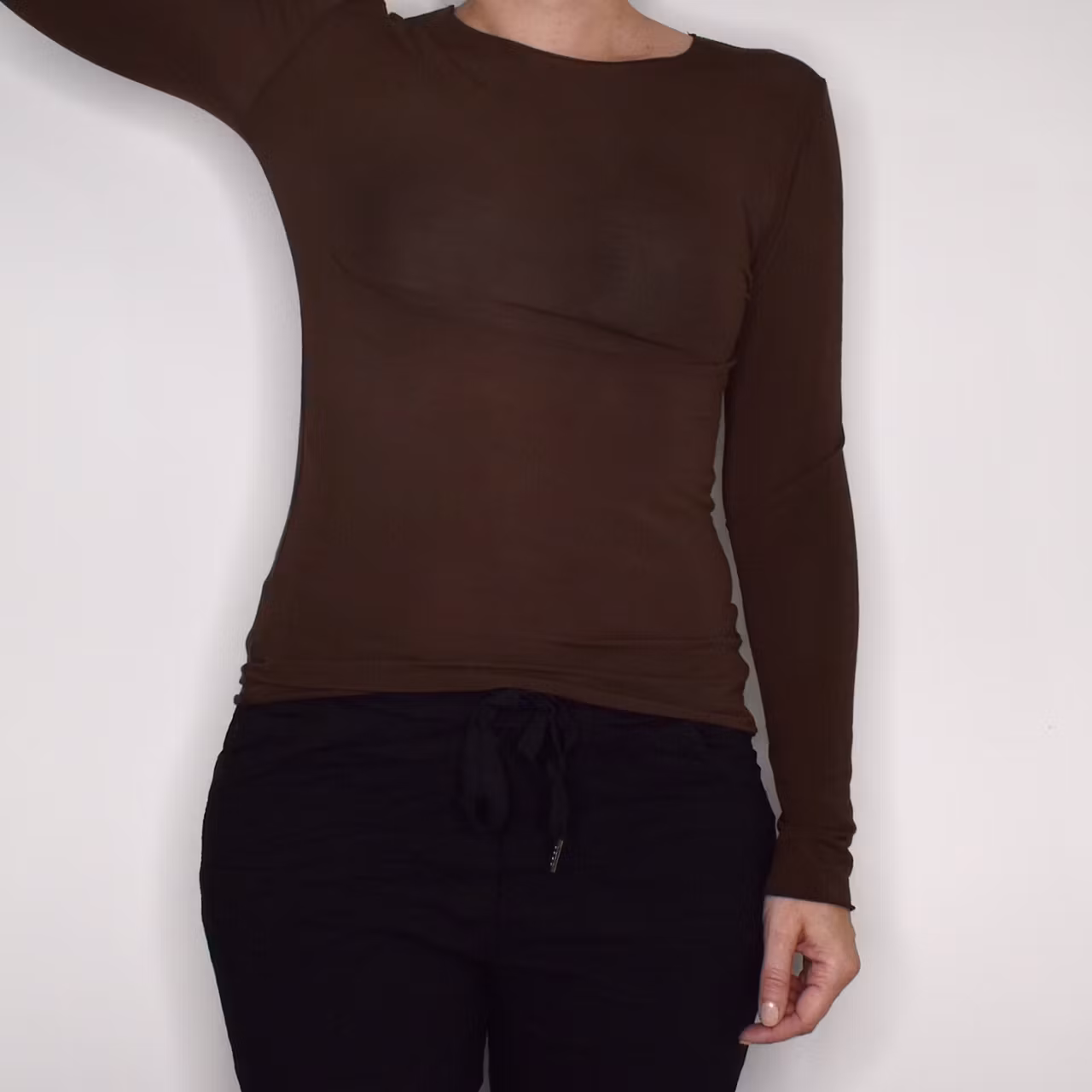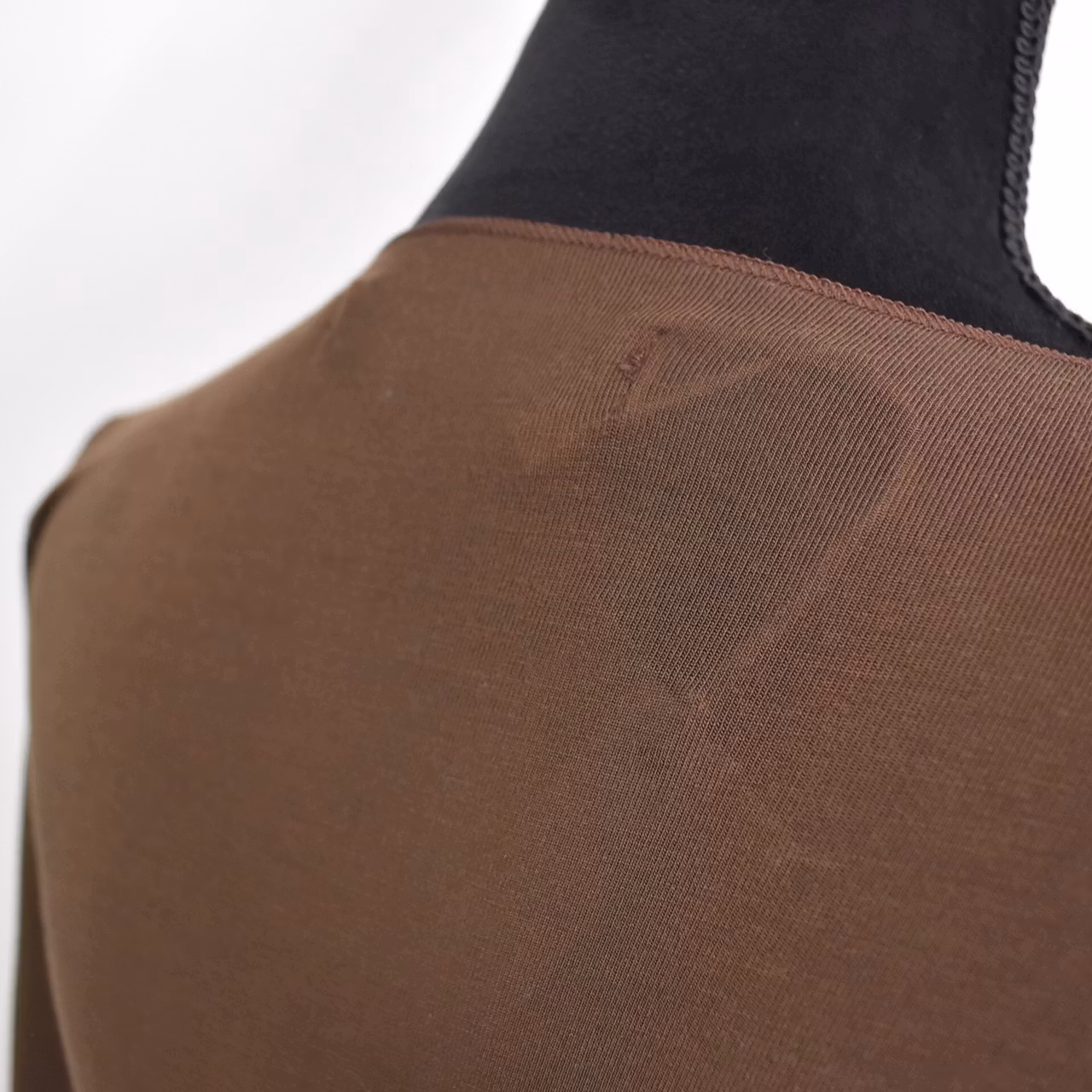 Det här är en skön åtsittande bastopp i mycket tunt, mjukt och stretchigt material. Ett mycket användbart plagg som är skönt att ha under tröjor, koftor, kavajer etc. Observera att tyget kan ha en speciell doft när det är nytt men detta försvinner vid användning och tvätt. Modellen har en bröstvidd på cirka 88cm, är 163cm lång och bär S/M.