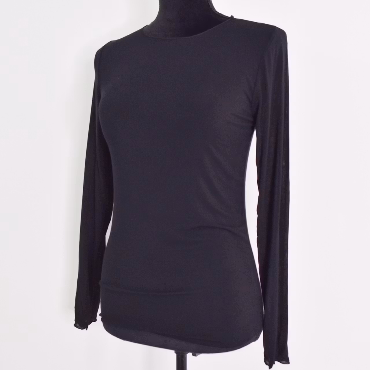 Det här är en skön åtsittande bastopp i mycket tunt, mjukt och stretchigt material. Ett mycket användbart plagg som är skönt att ha under tröjor, koftor, kavajer etc. Observera att tyget kan ha en speciell doft när det är nytt men detta försvinner vid användning och tvätt. Modellen har en bröstvidd på cirka 88cm, är 163cm lång och bär S/M.